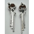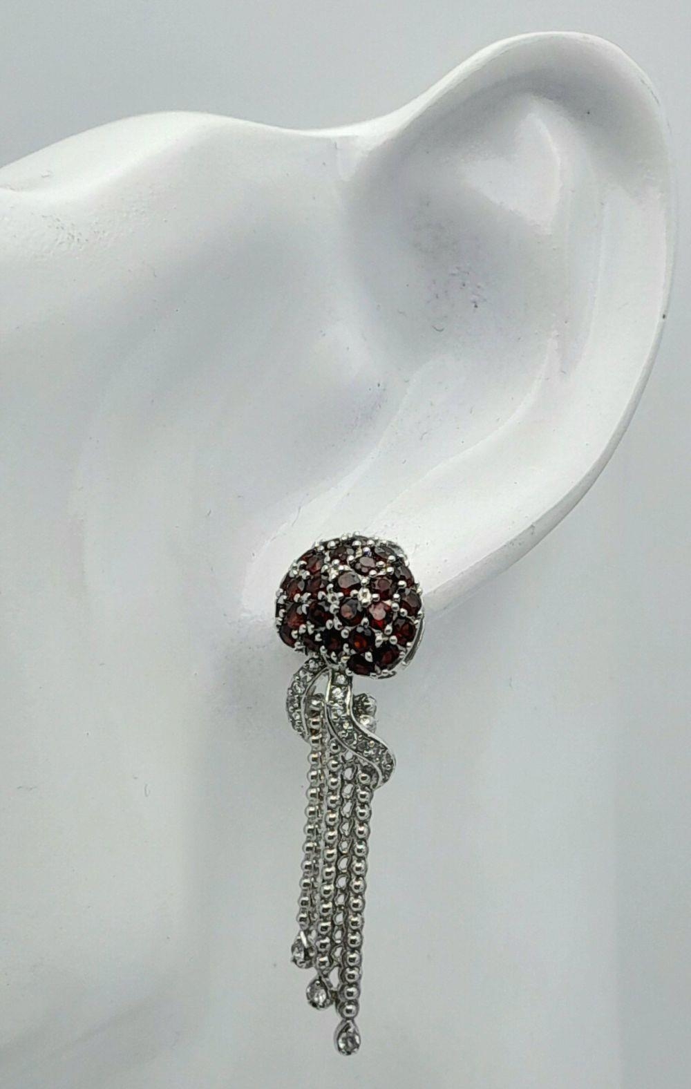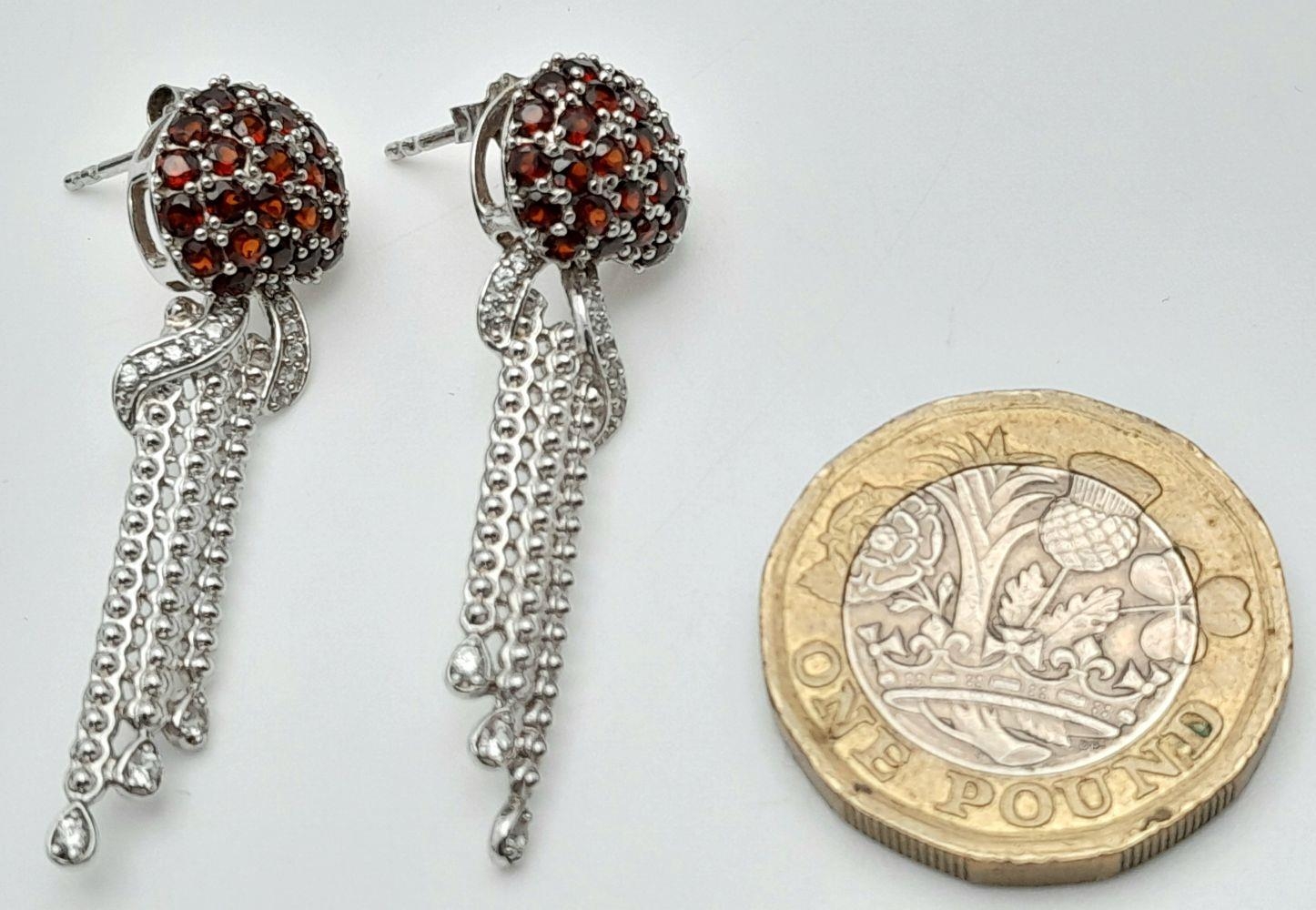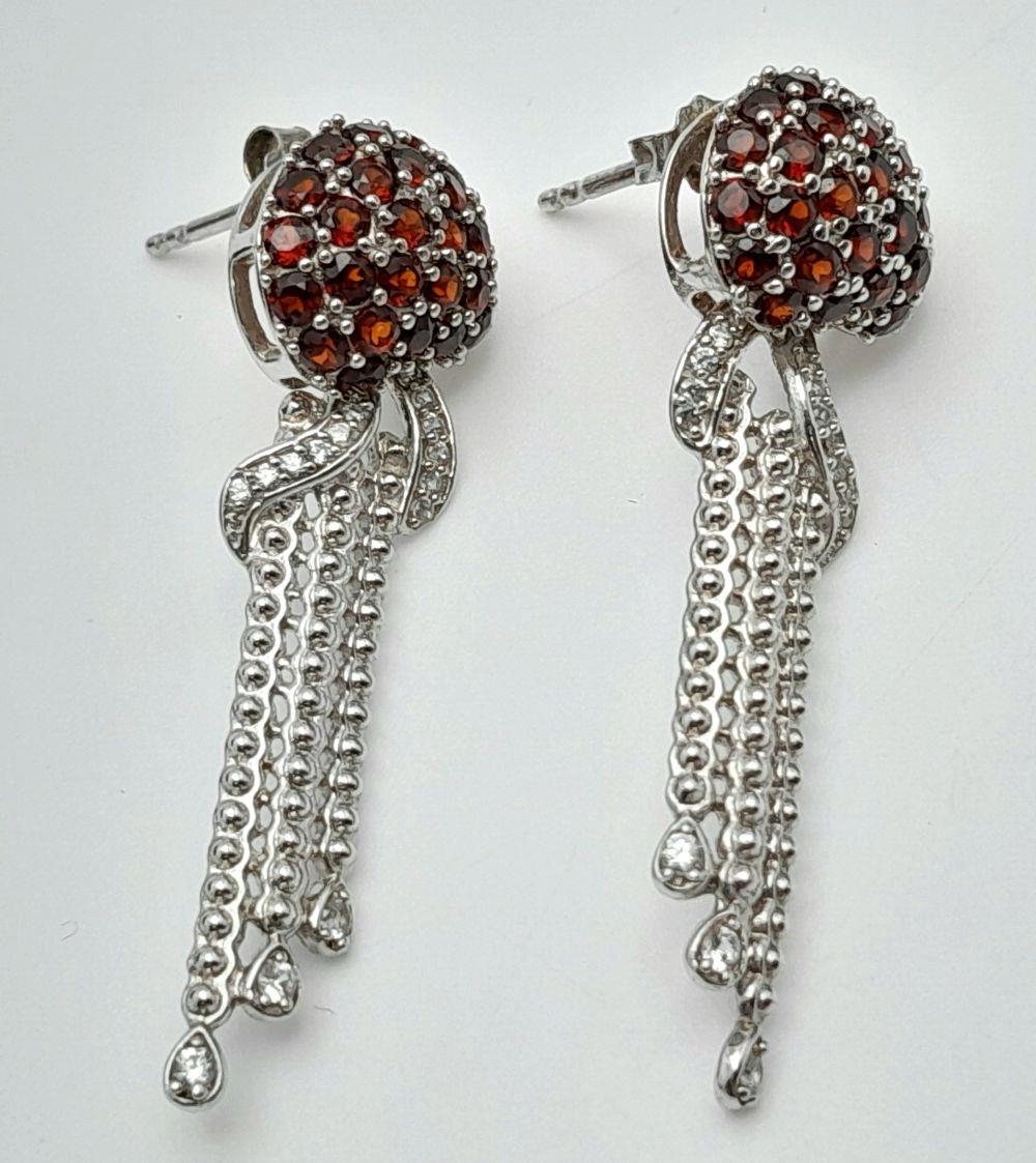 A Pair of Sterling Silver Garnet and White Topaz Set Pendulum Design Stud Earrings. 4cm Drop. 1.2cm Wide at Widest Point. Set with Round Cut Garnets, Pear and Round Cut White Topaz.