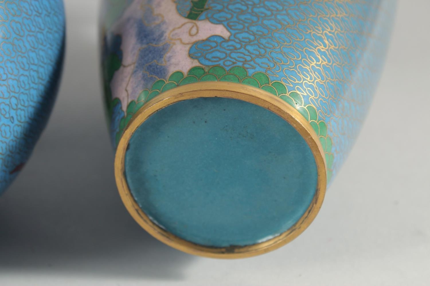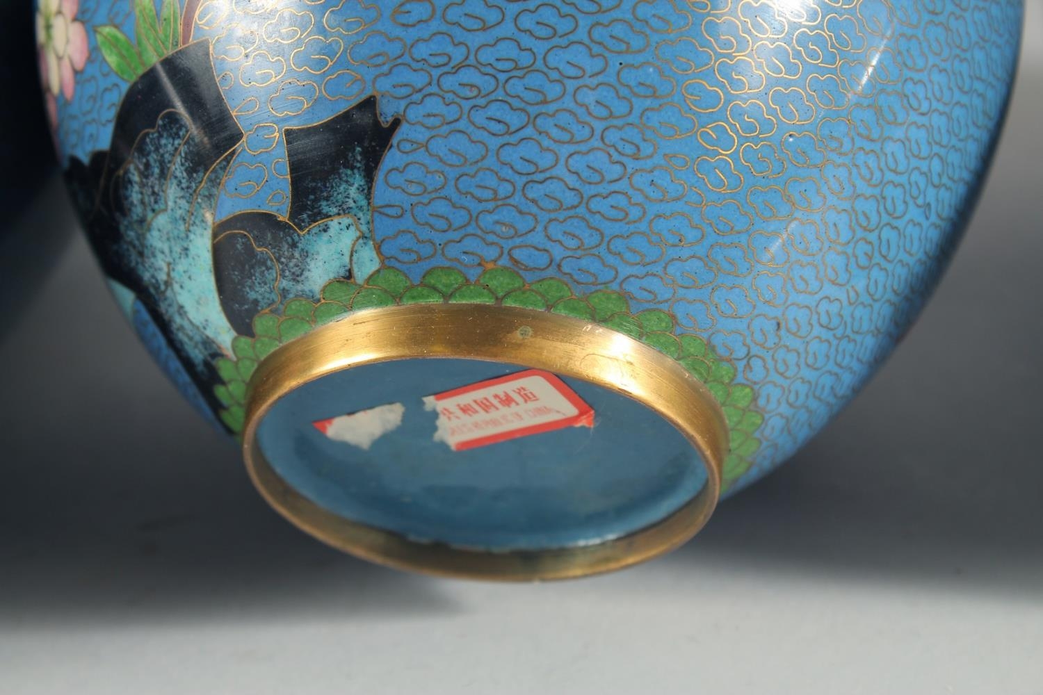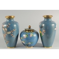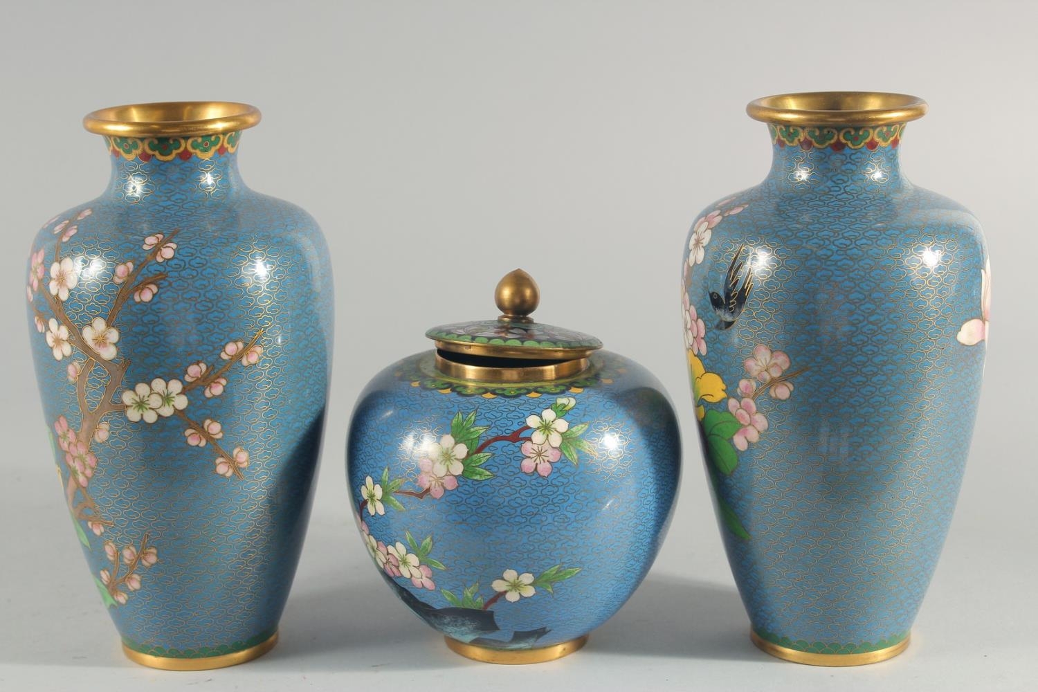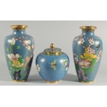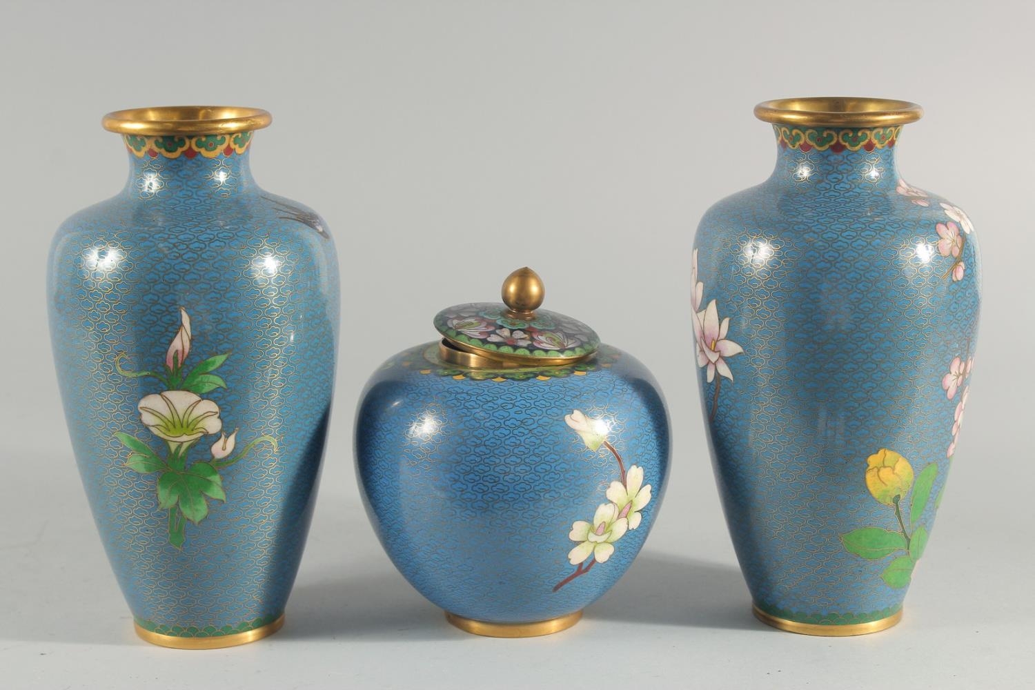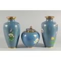 TWO CHINESE BLUE GROUND CLOISONNE VASES, and a similar jar with associated cover, vases 23.5cm high, (3).