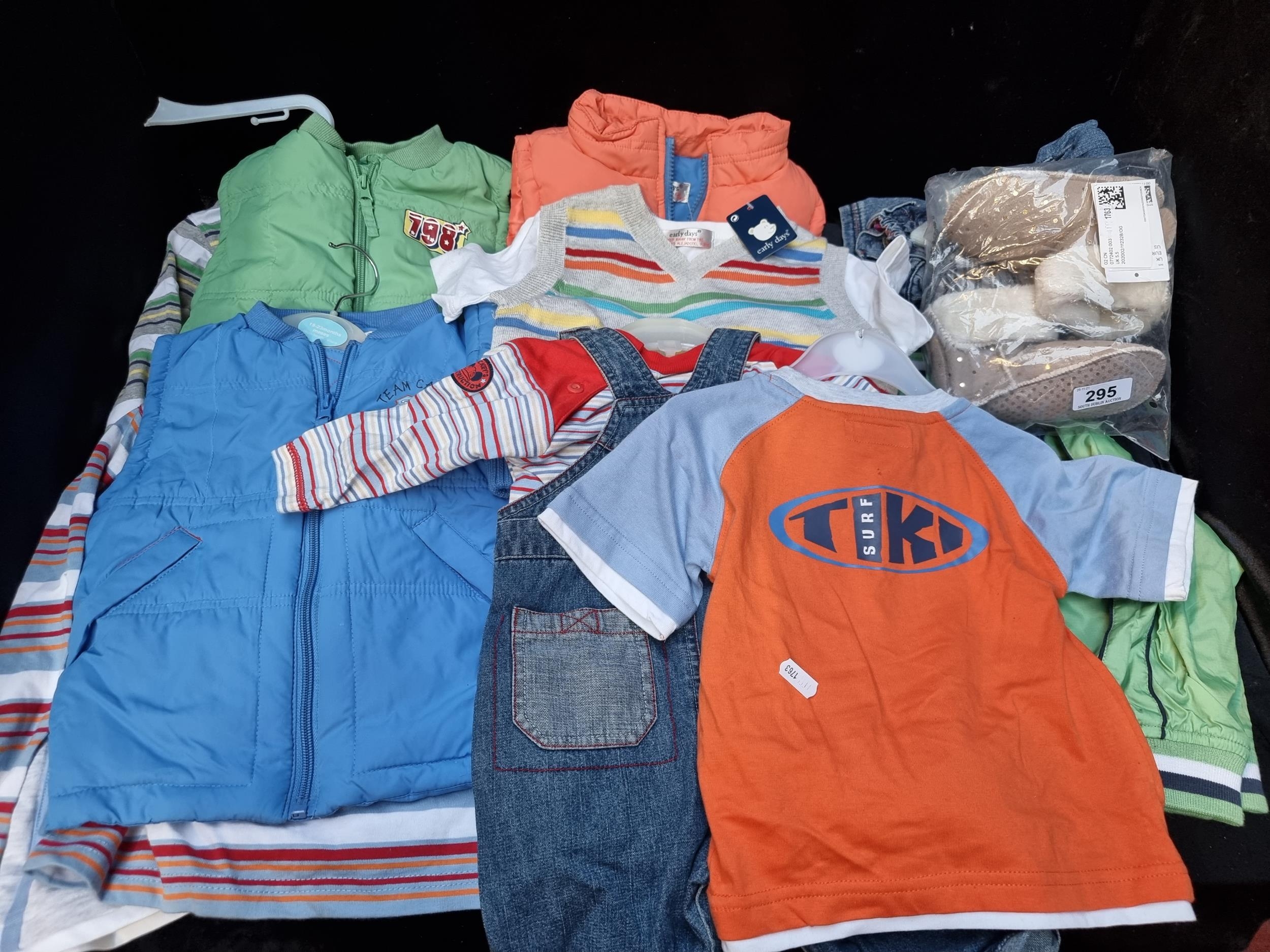 A large quantity of boy's babywear clothes. Aged 18-23months. Including a Disney Mickey Mouse pair of denim dungarees and two bodywarmers, shoes etc . All brand new condition with tags.