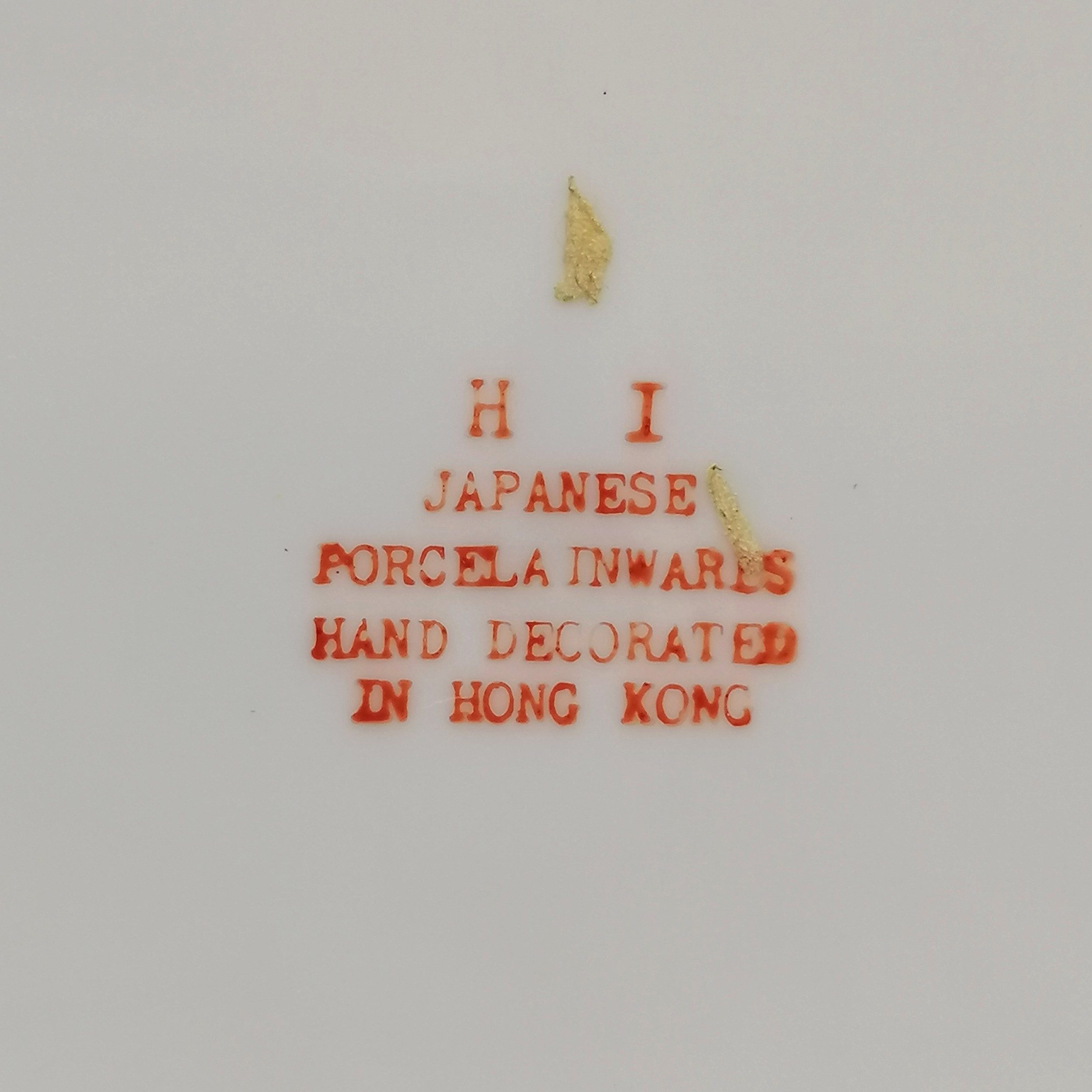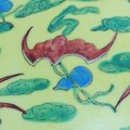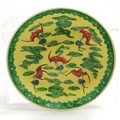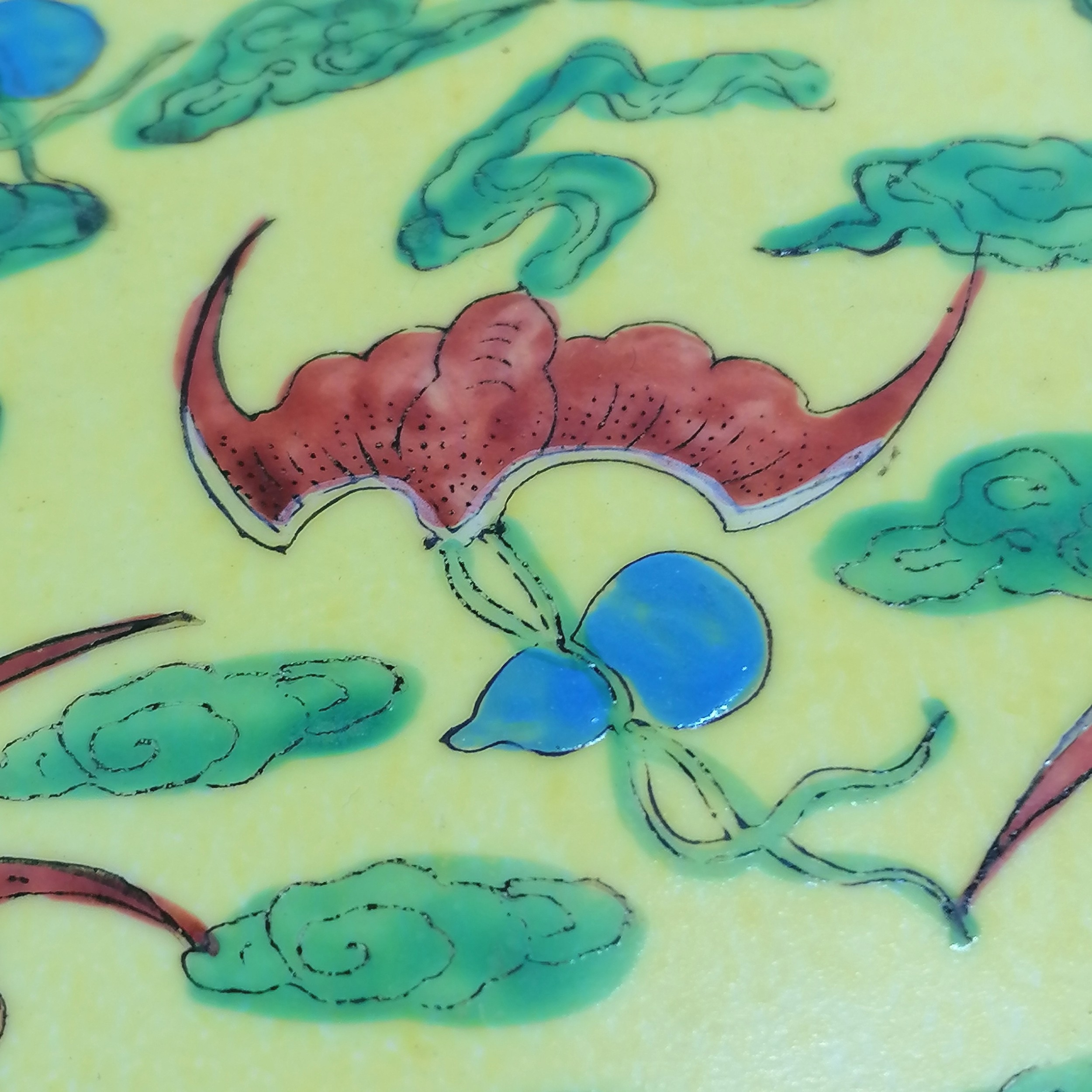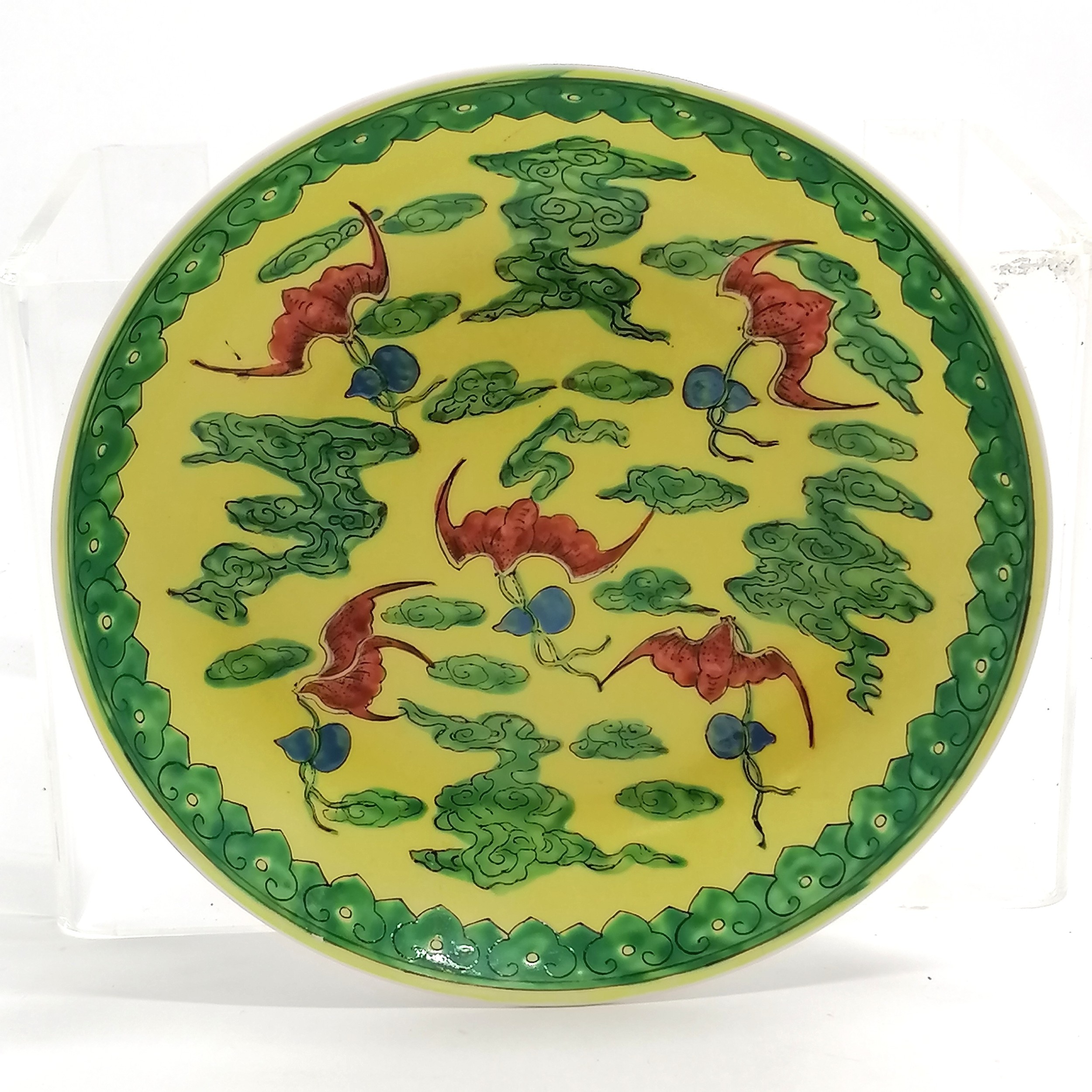Oriental Japanese hand decorated in Hong Kong bowl with 5 bat & purse detail on green / yellow ground - 19.5cm diameter & no obvious damage