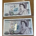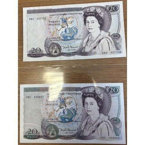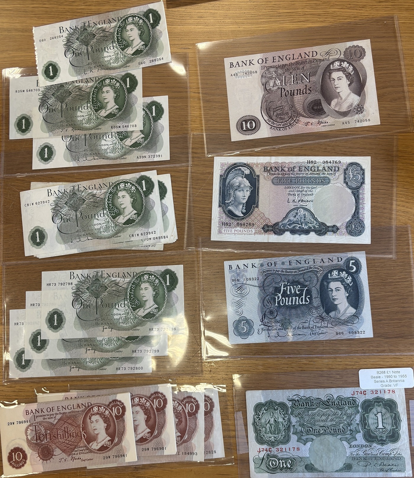 Collection of banknotes in plastic wallets, generally very fine to extremely fine, including Beale 1950 £1 J74C, O'Brien 1961 £5 H82, Hollom 1963 £5 B66, Fforde 1967 £10 A45, Page 1970 £20 A13, 1975 £10 A15, 1971 £5 A01, Somerset £20 1981 E64, 1984 02C, Gill £20 01T, 73M, Kentfield 1981 series D last £50 E30, 1991 E11 and £10 KN42 and KR30. Plus range of £1's and 10/-. Qty 44+ (R)