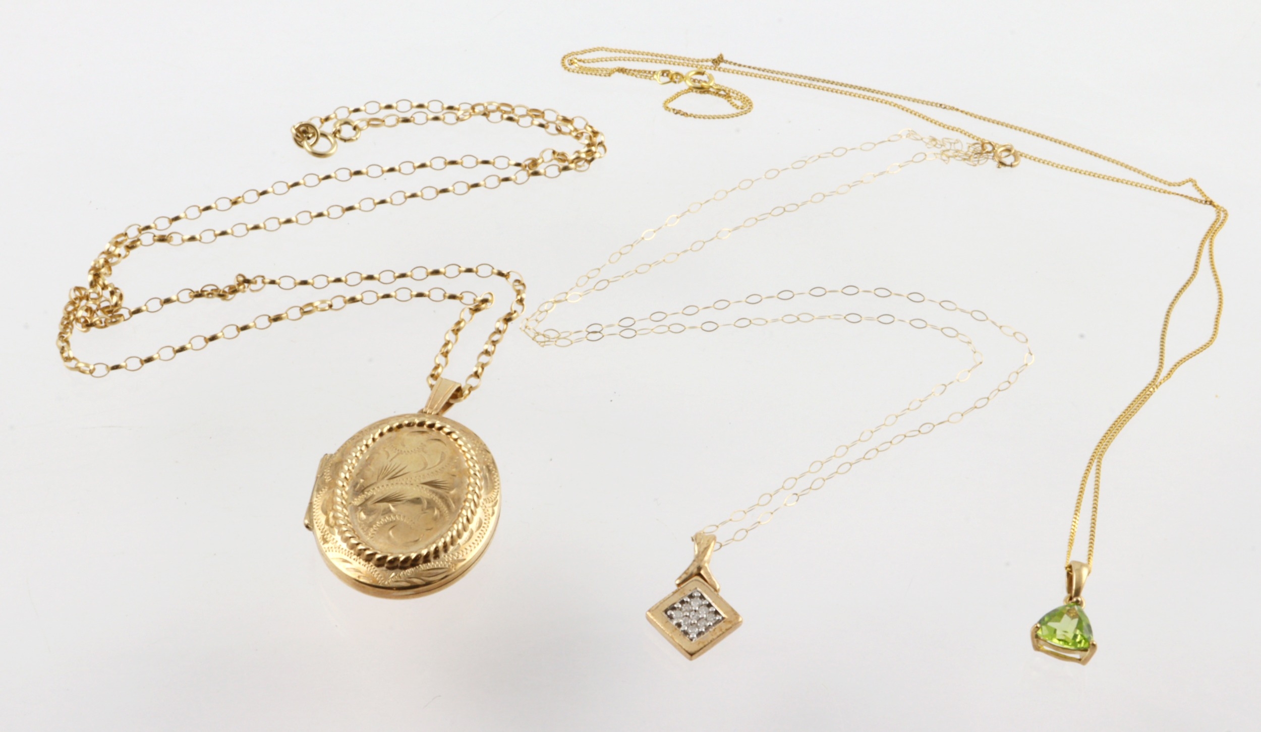 Three 9ct chains with pendants / photo locket. Total weight 9.7g