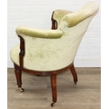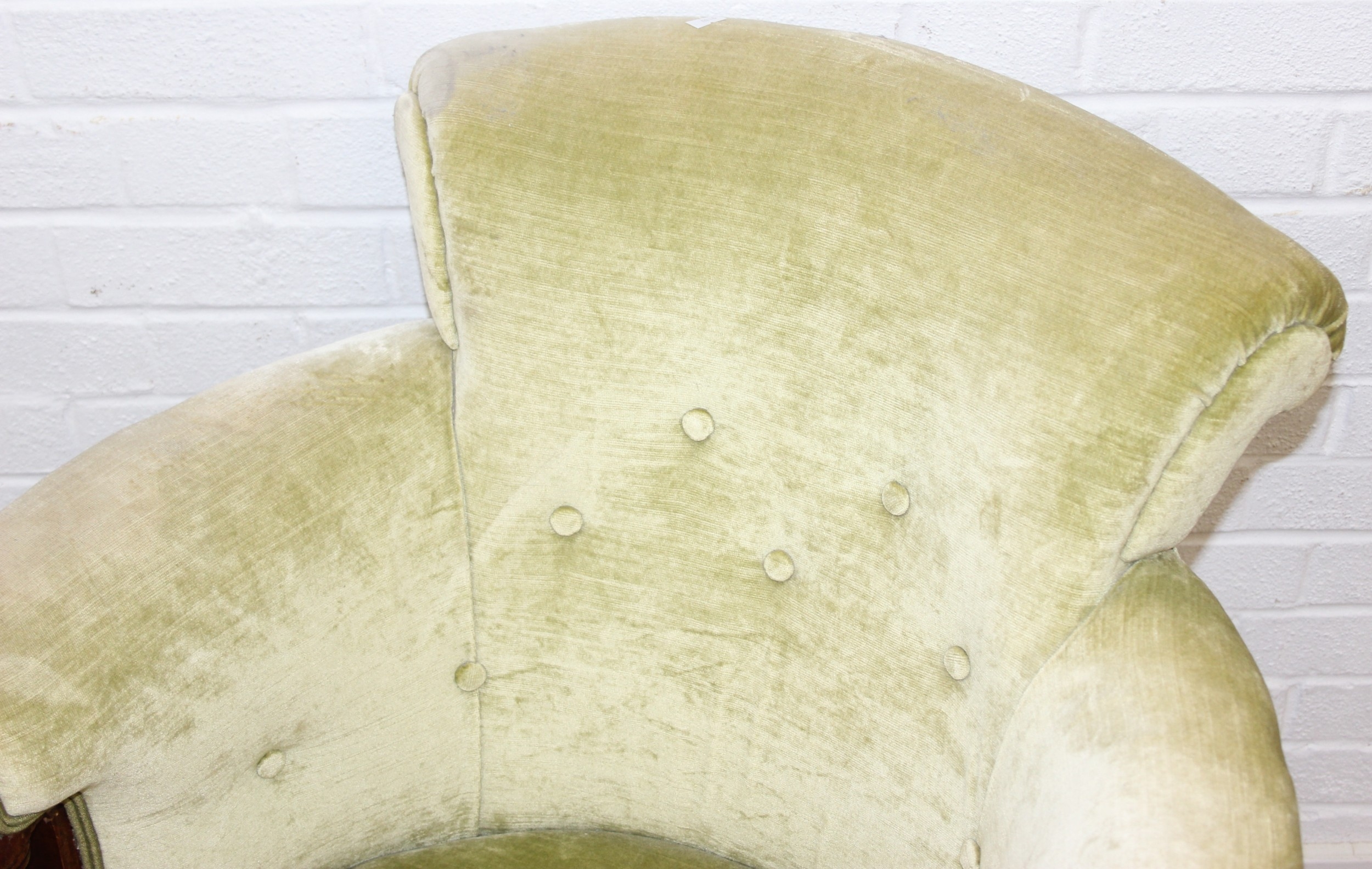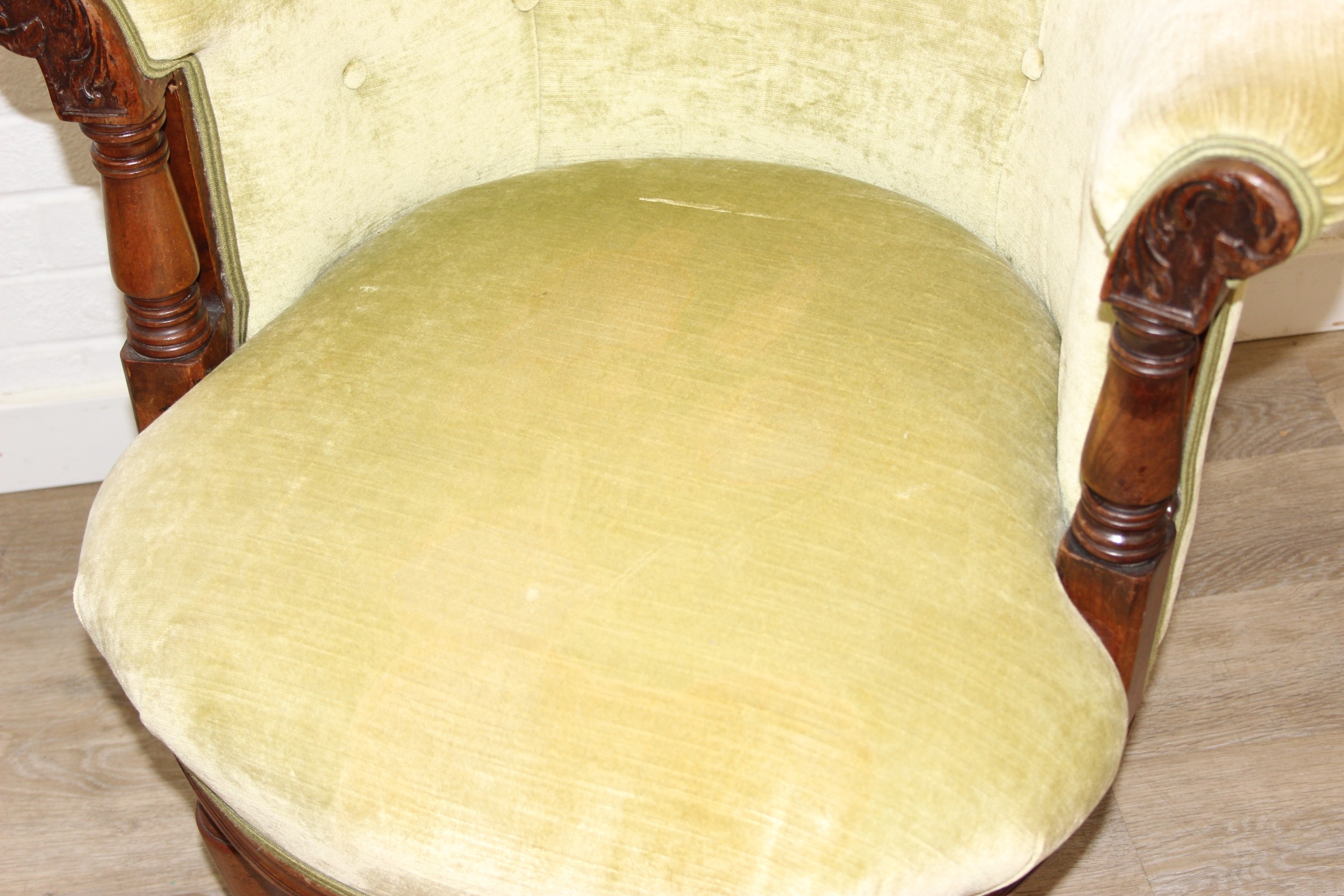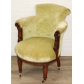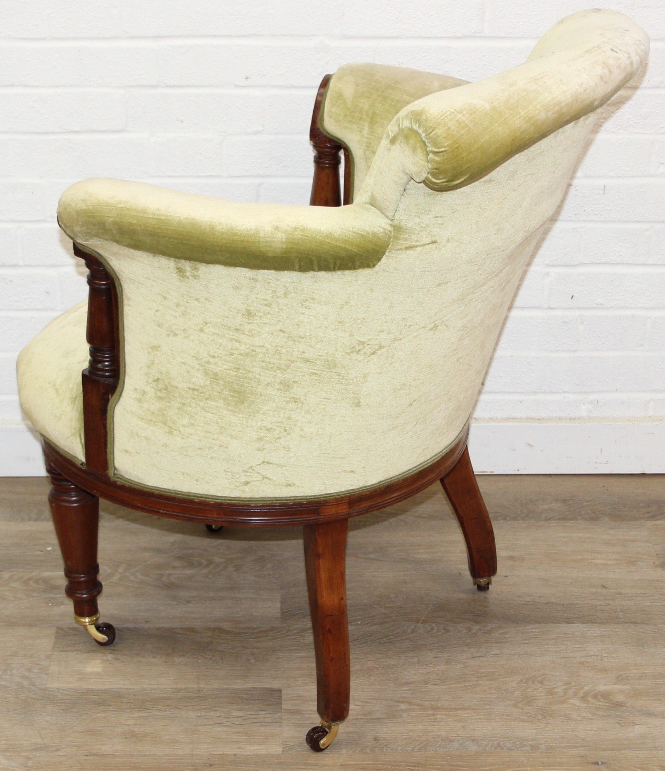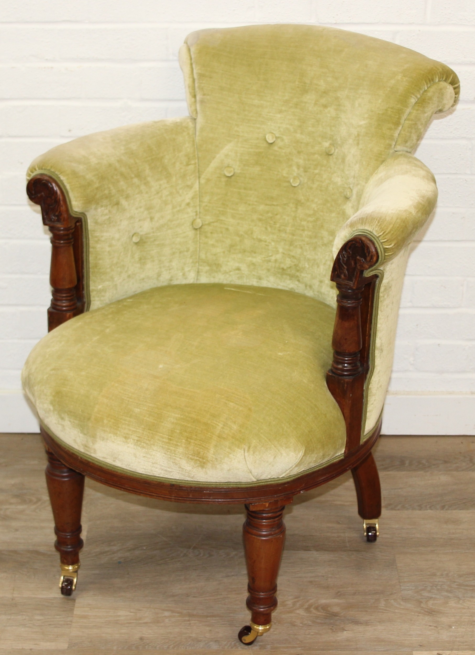 A Victorian tub chair or armchair with green buttoned velvet upholstery and exposed carved wooden frame, turned legs with brass and ceramic castors, 70cm wide x 95cm tall