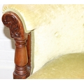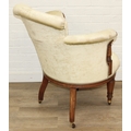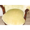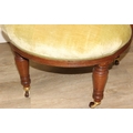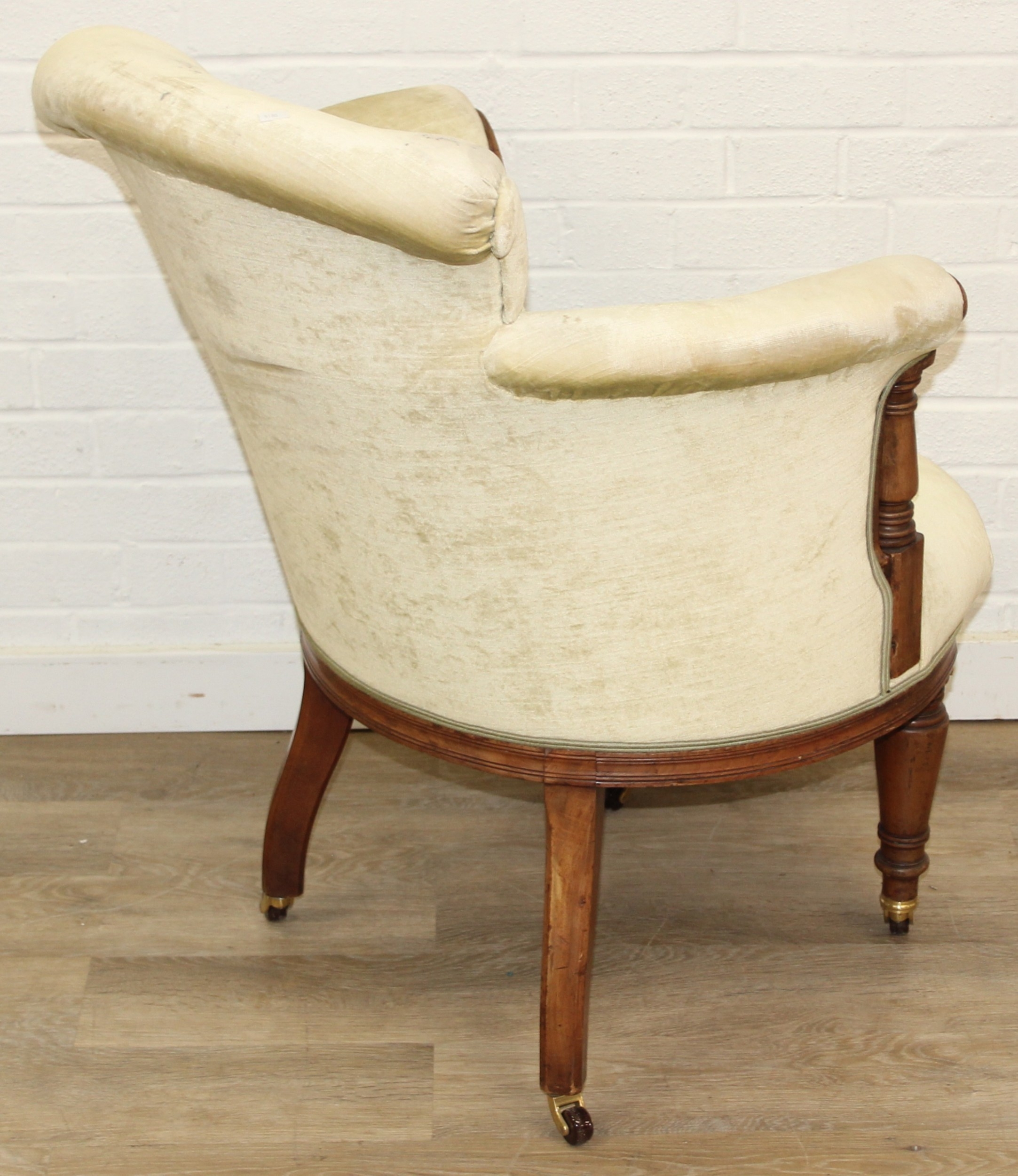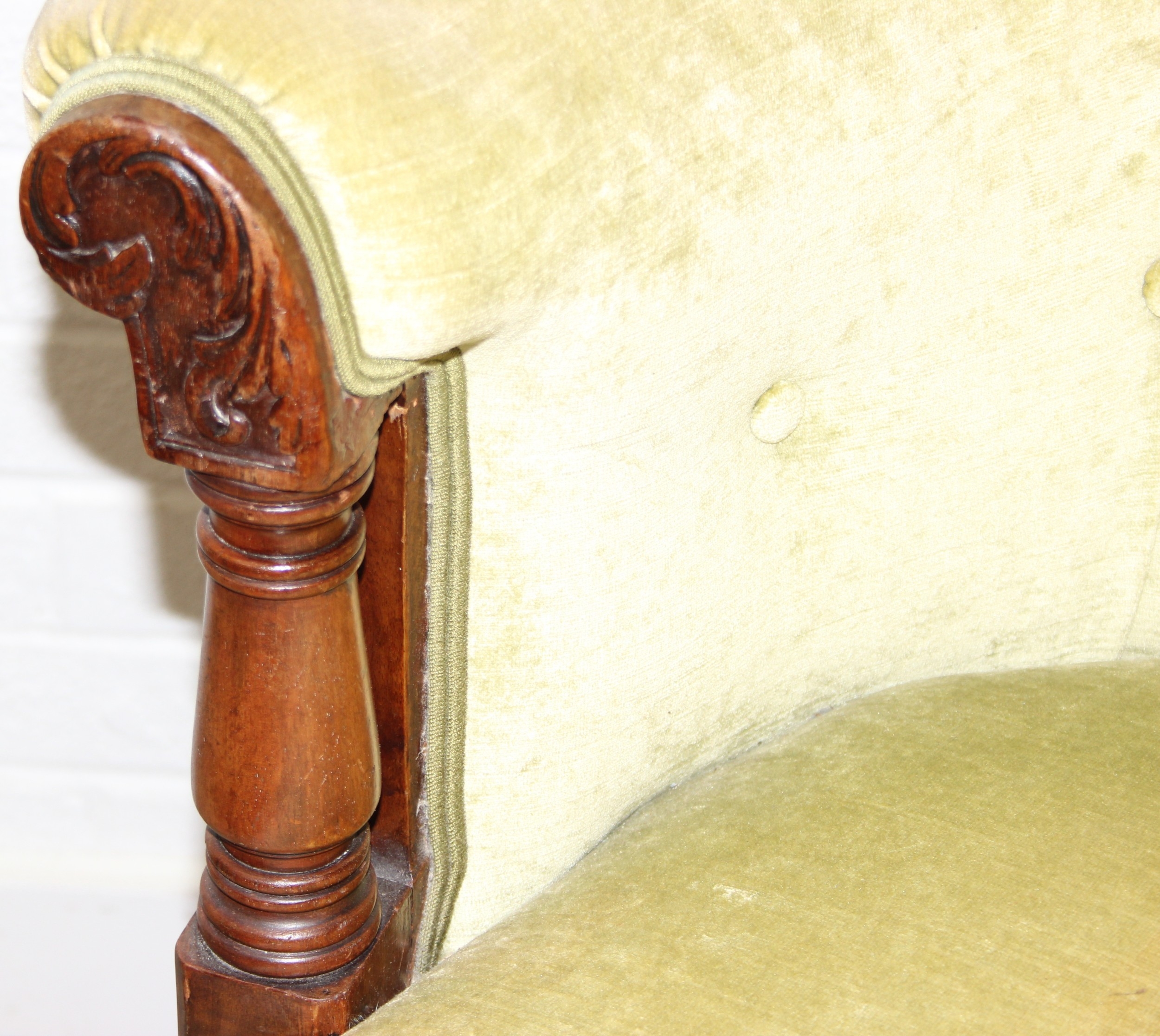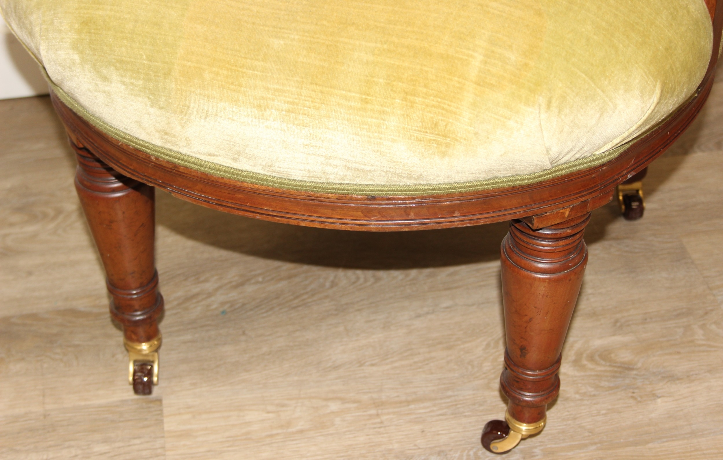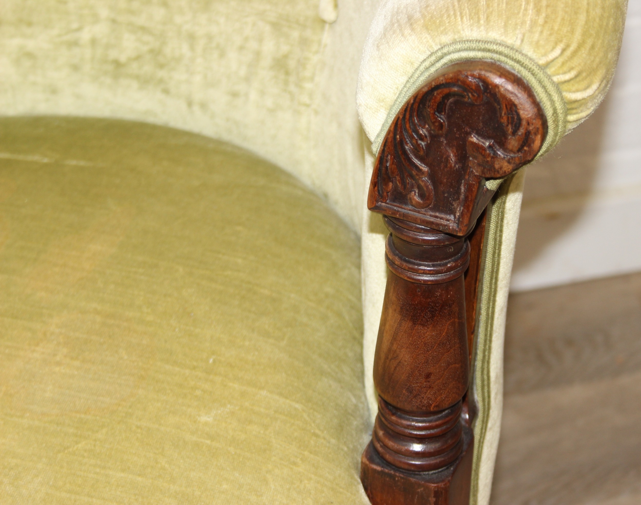 A Victorian tub chair or armchair with green buttoned velvet upholstery and exposed carved wooden frame, turned legs with brass and ceramic castors, 70cm wide x 95cm tall