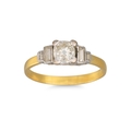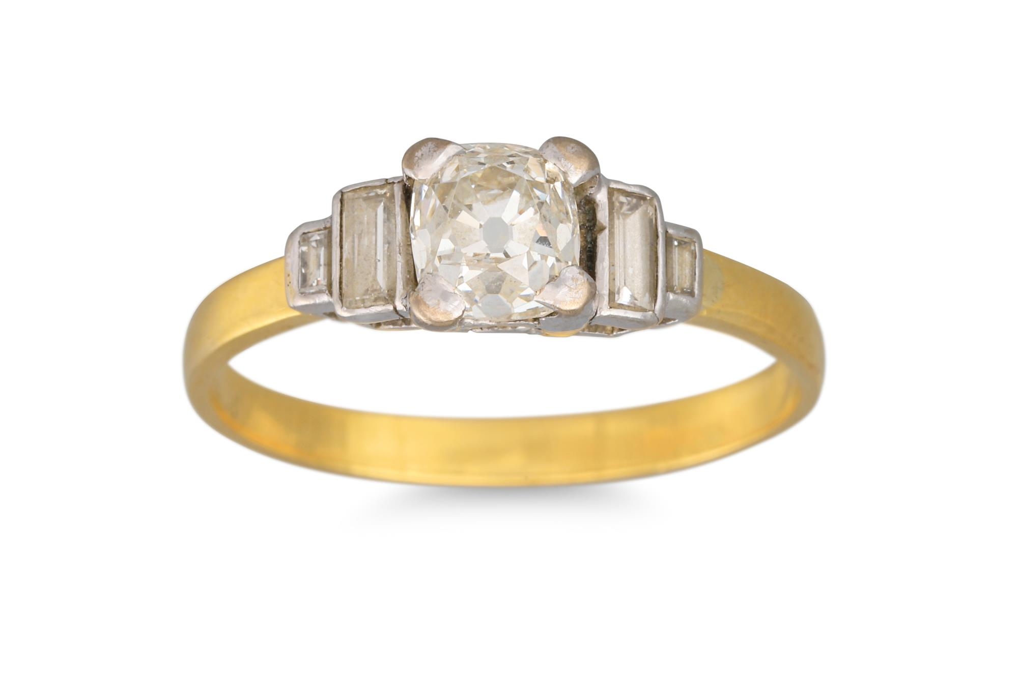A DIAMOND SOLITAIRE RING, the old cut diamond to baguette diamond shoulders, mounted in 18ct yellow gold. Estimated: weight of centre stone: 0.94 ct, size M