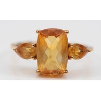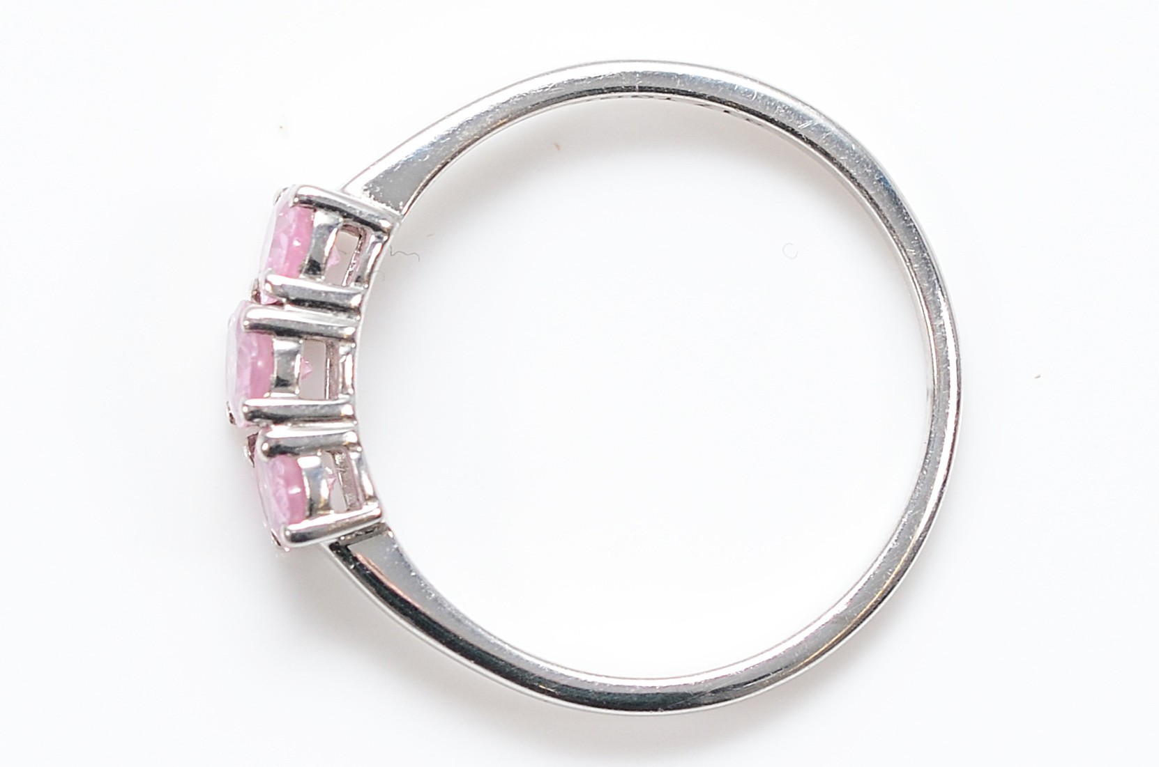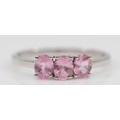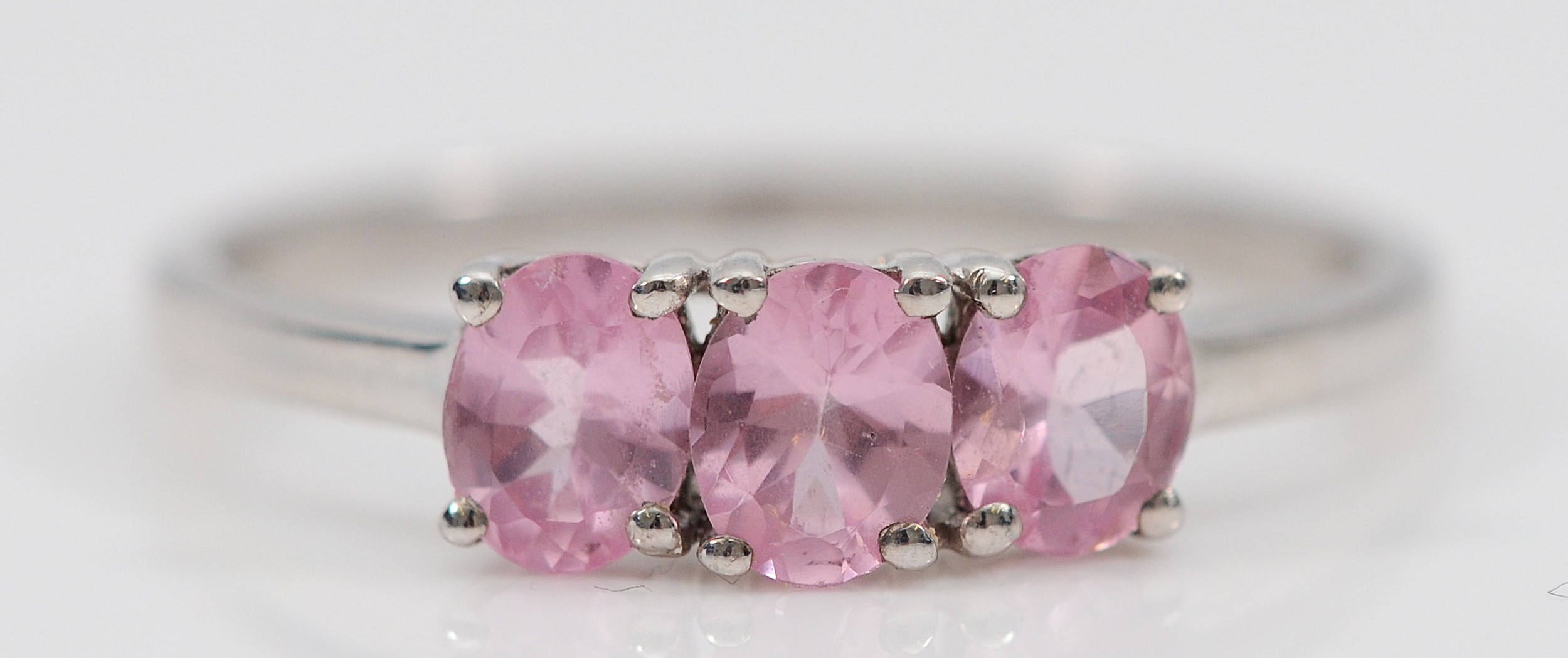 A TGGC 9ct white gold pink sapphire three stone ring, Q, 1.9g