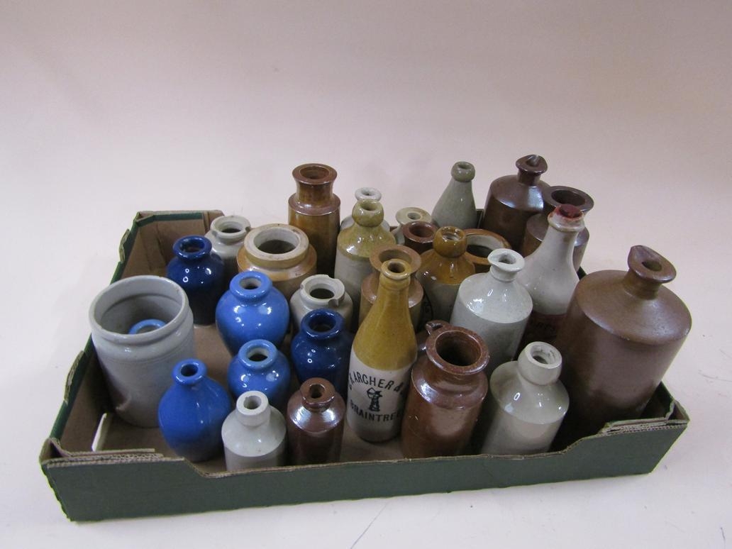 BOX OF STONEWARE INK AND OTHER BOTTLES