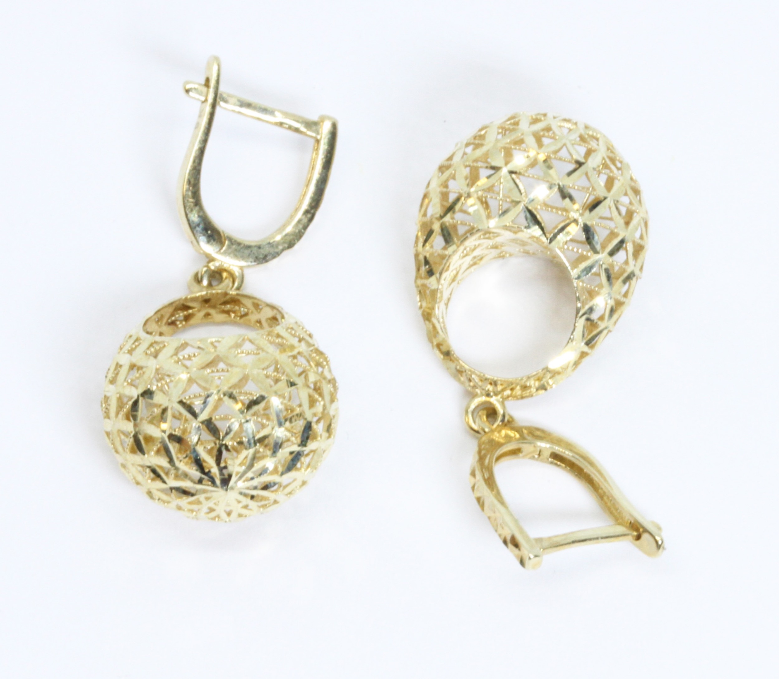 A pair of 9ct gold drop pierced basket design earrings, length 36mm, weight 4g.