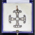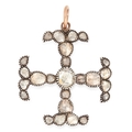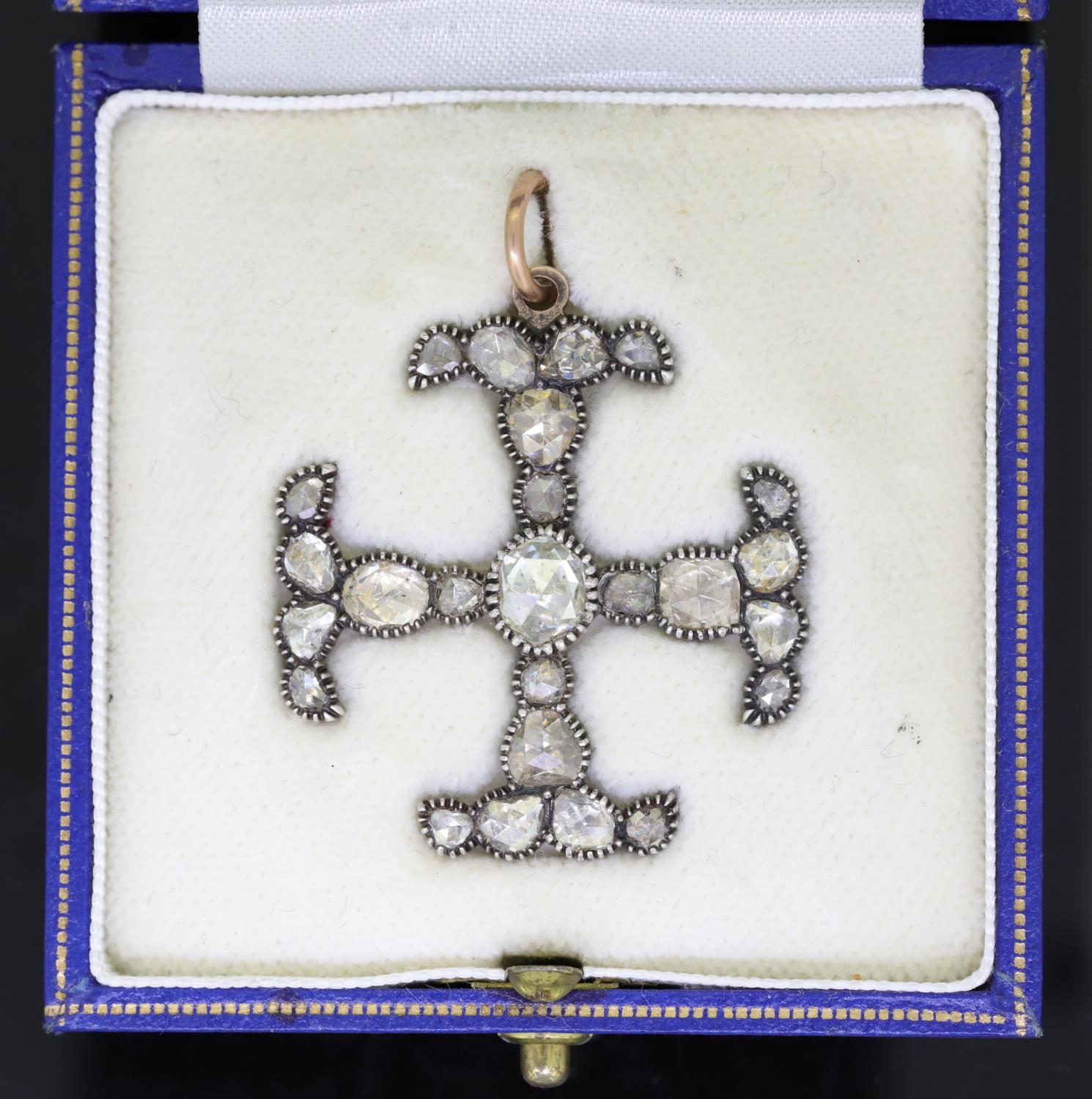 AN ANTIQUE DIAMOND CROSS PENDANT, 19TH CENTURY in yellow gold and silver, set with a central rose cut diamond of approx. 1.25 carats, flanked by further rose cut diamonds in the four arms, all diamonds totalling approx. 5.63 ct. W. 3.5 cm. 9.2 grams. With a fitted box.