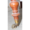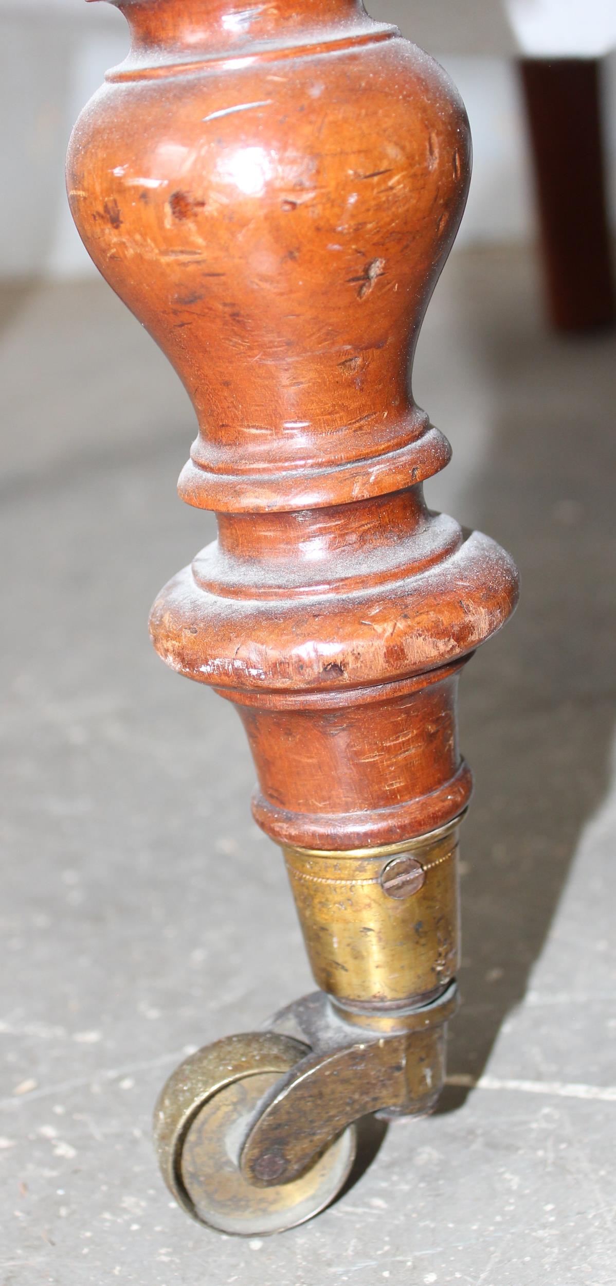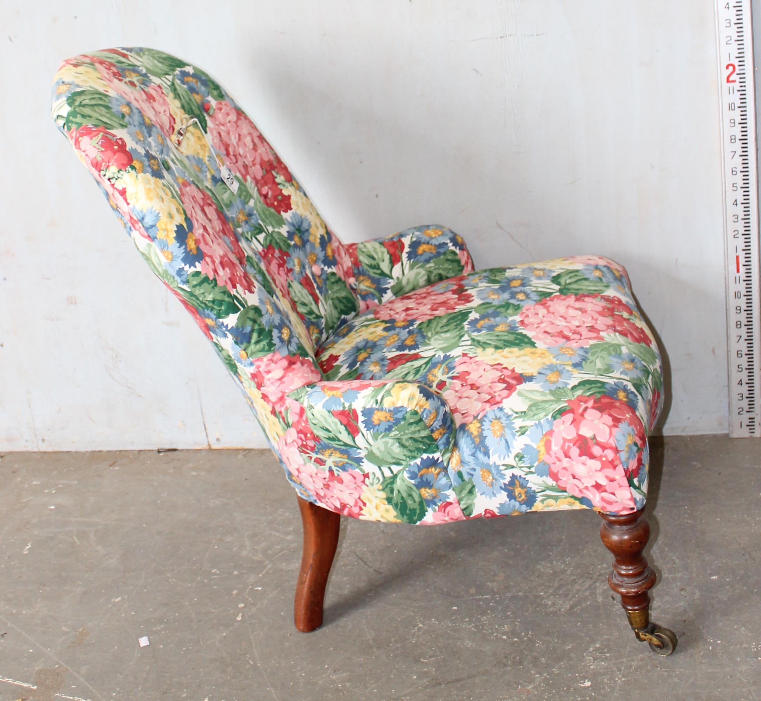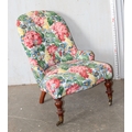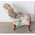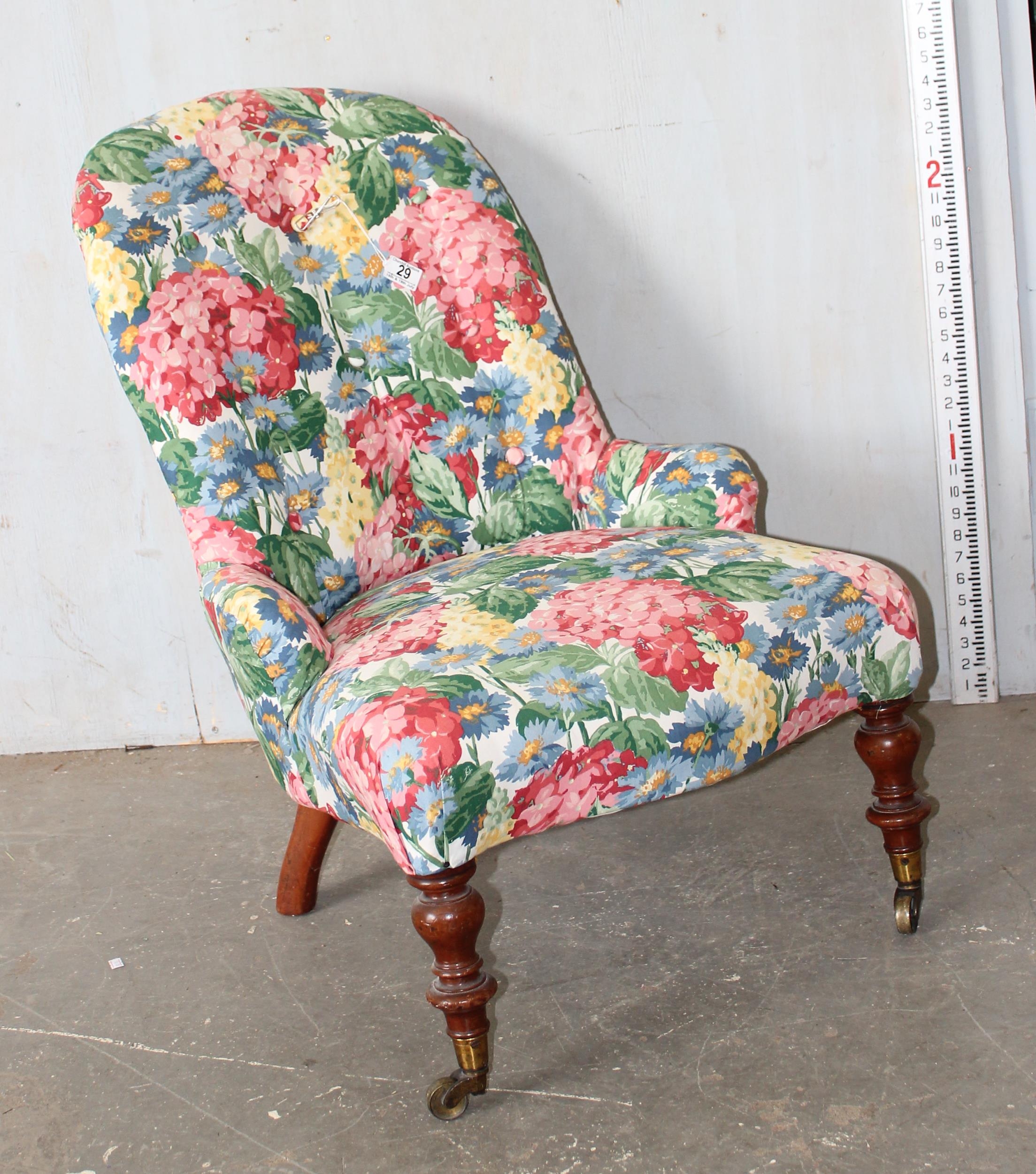 An antique low chair with later floral upholstery, brass and ceramic castors stamped Cope Collinson Patent