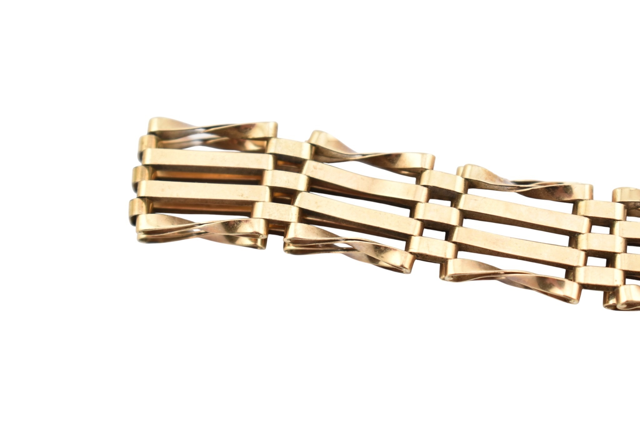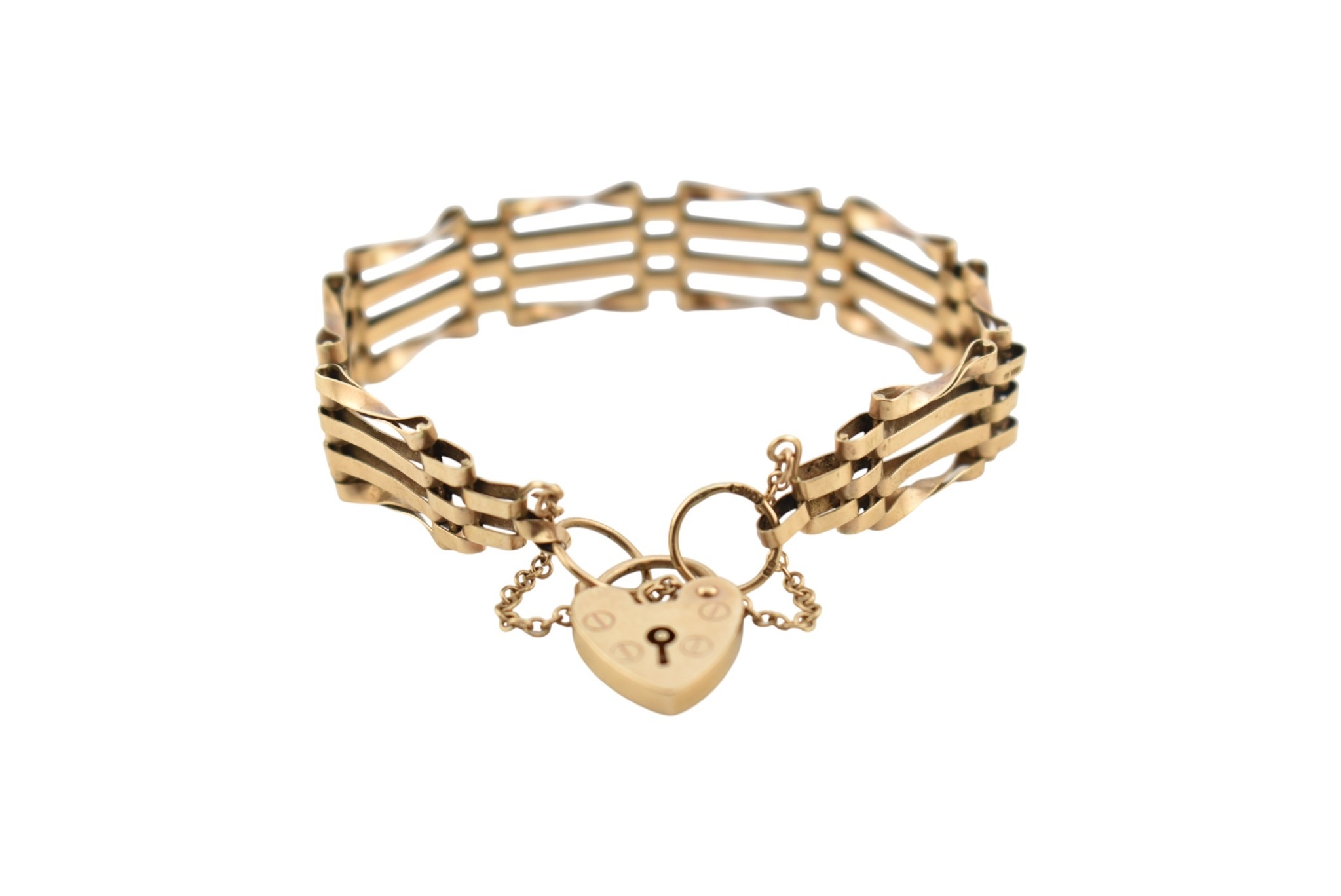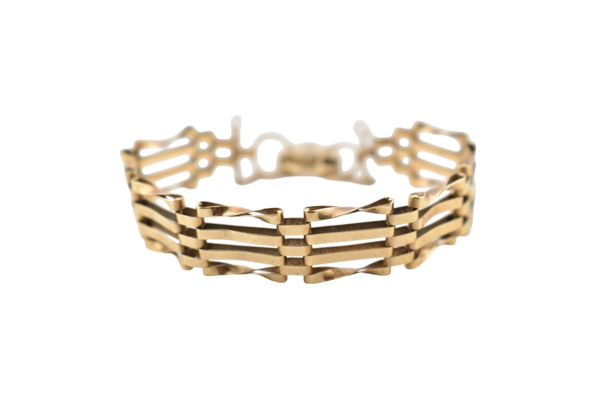 A hallmarked 9ct gold gate link bracelet. Hallmarked London, sponsors mark ASJ. Weight 8.9g. Measures approx 18cm.