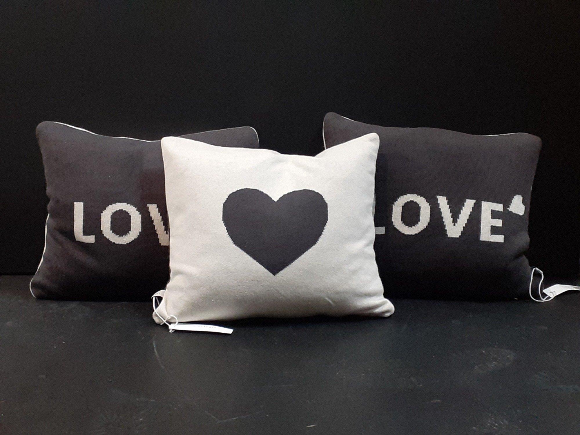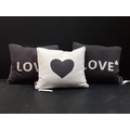 XMAS GIFTING IDEAS! - A set of three POSH handmade cushions by RETREAT featuring LOVE & LOVE HEARTS - darker grey and white - dimensions of each 38cm x 28cm approx - rrp each cushion £24.99
