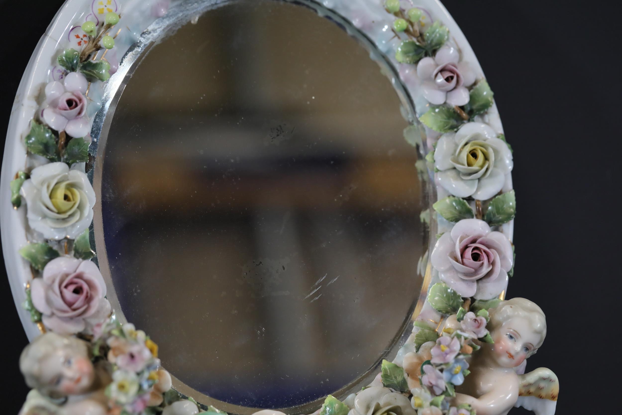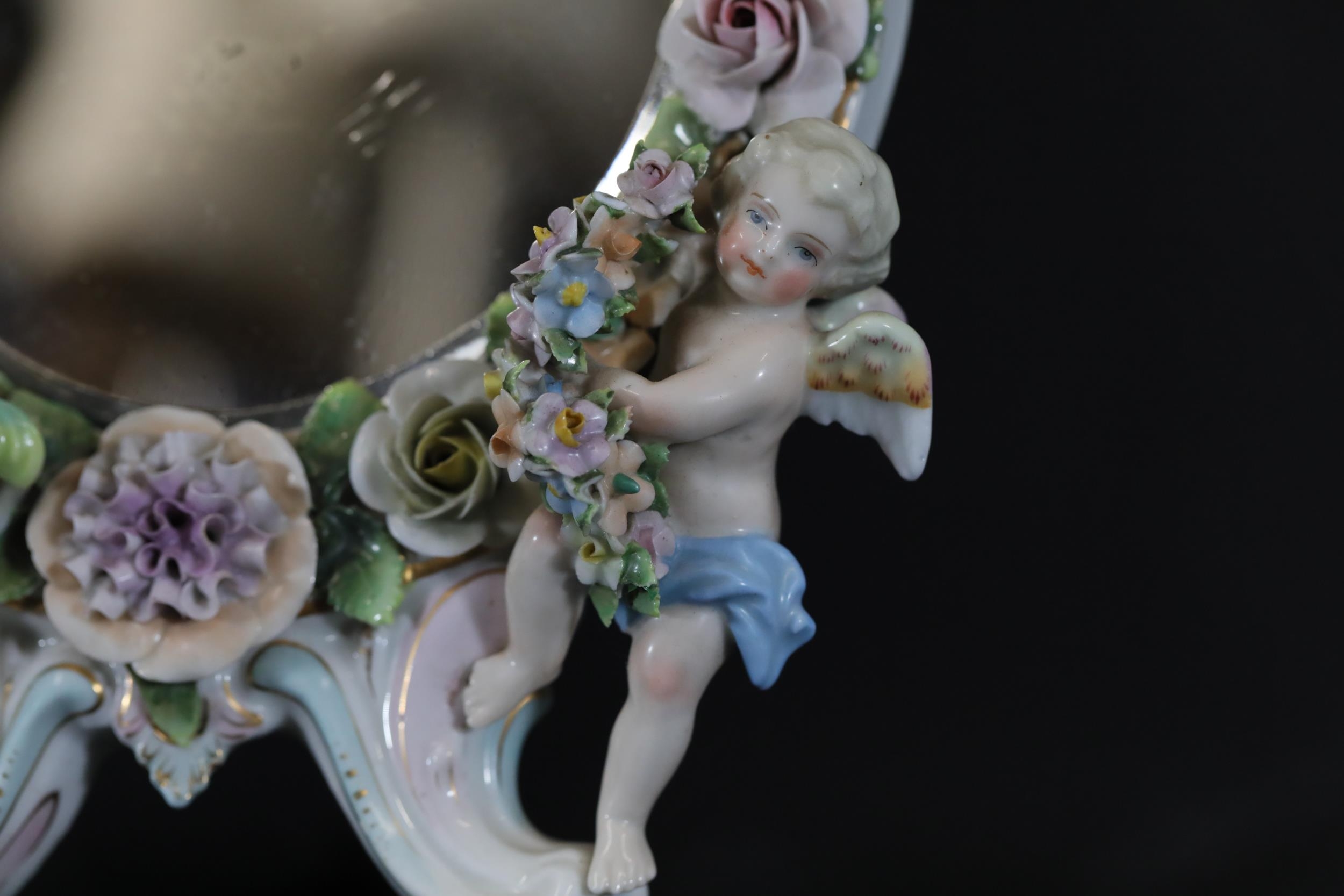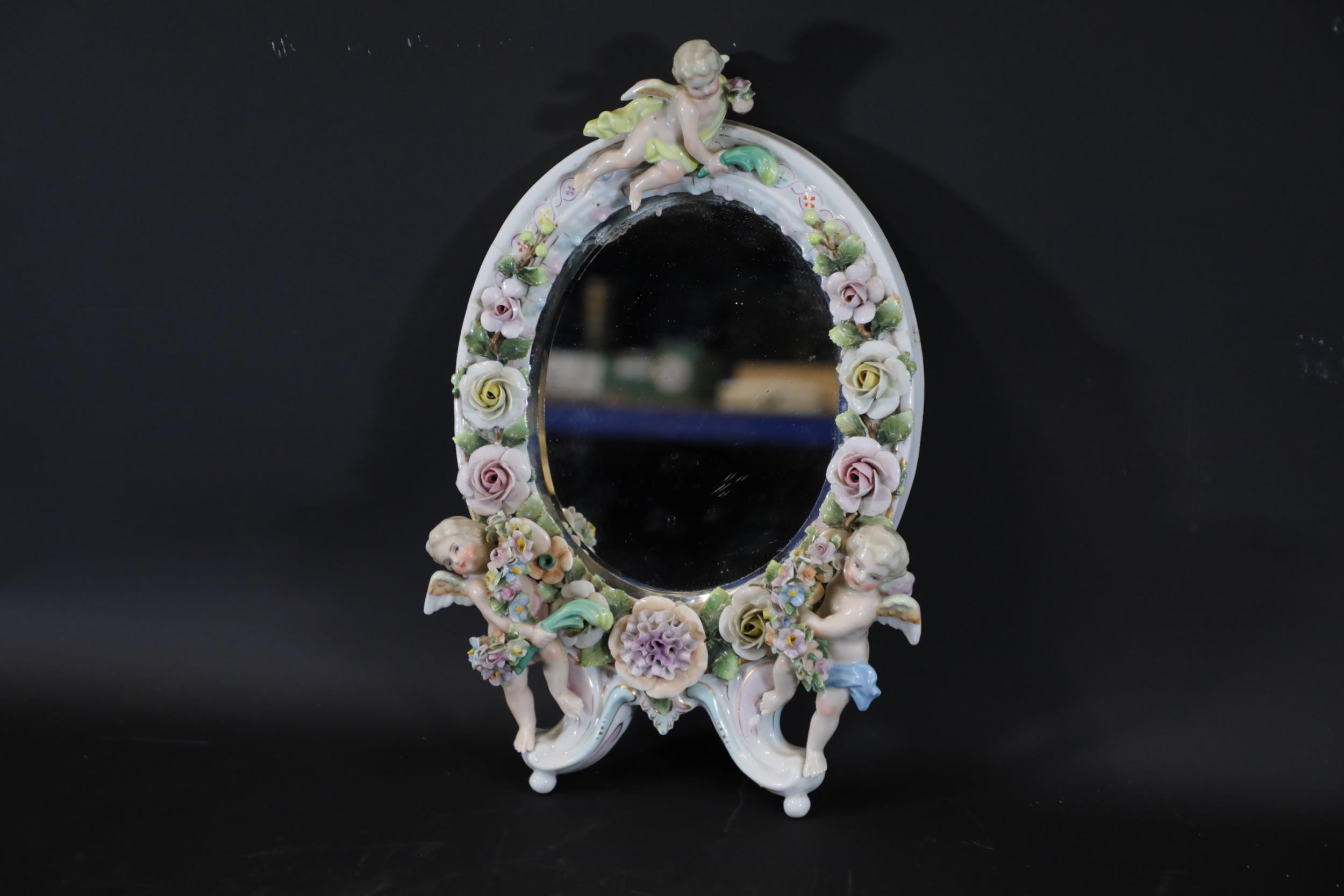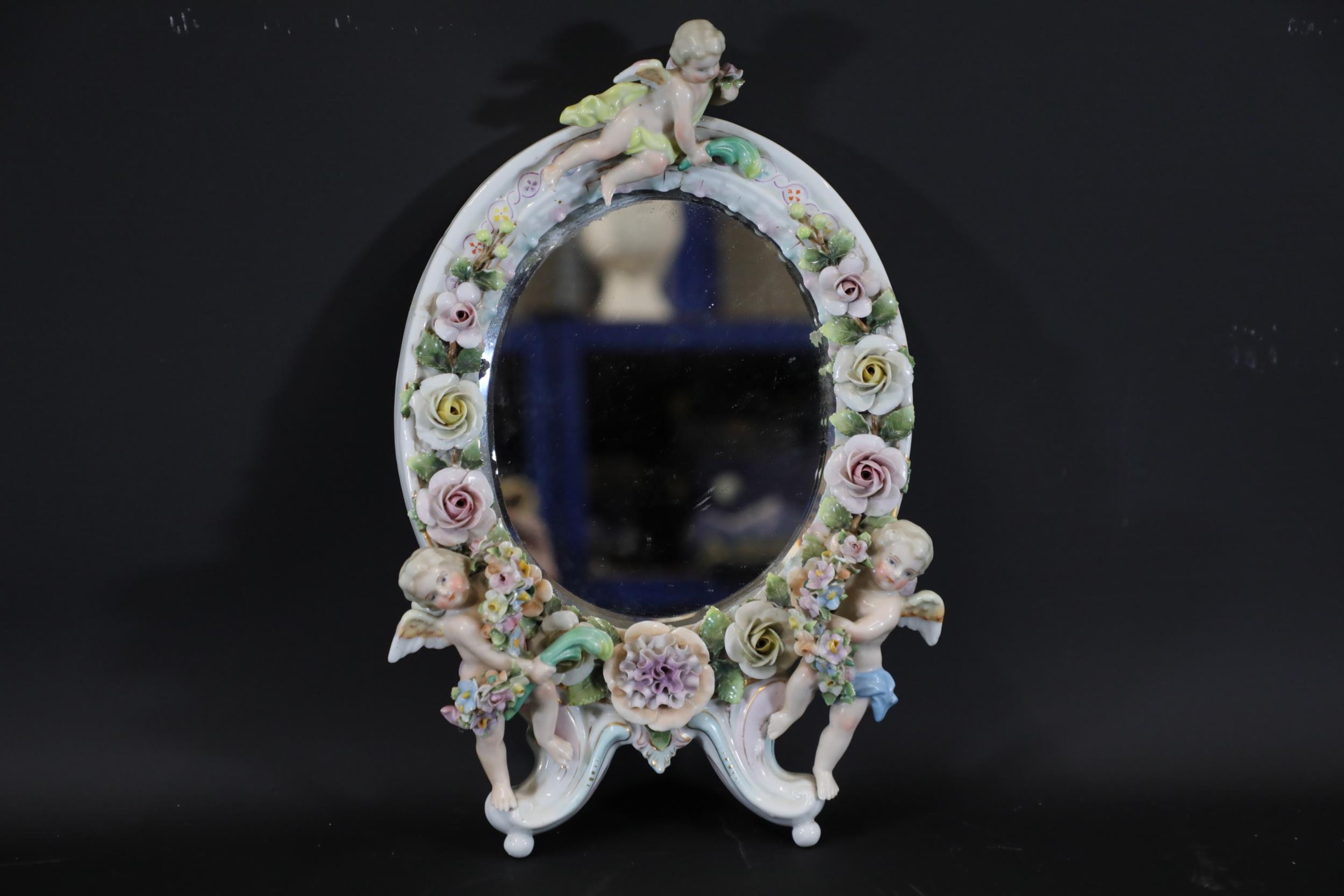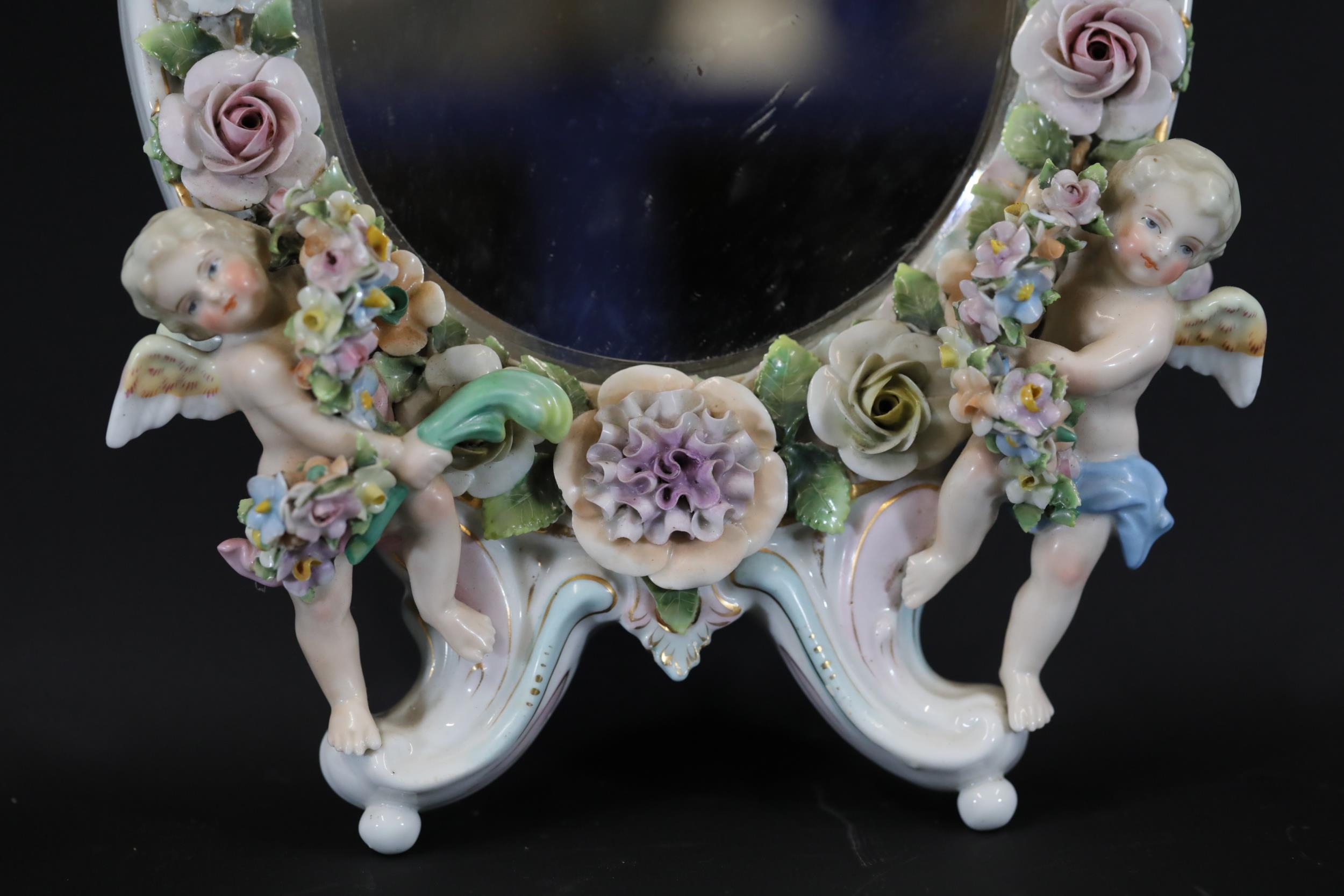 German Porcelain Cherub Floral Vanity Mirror - Dresden / Meissen Crossed Sword Mark