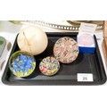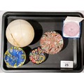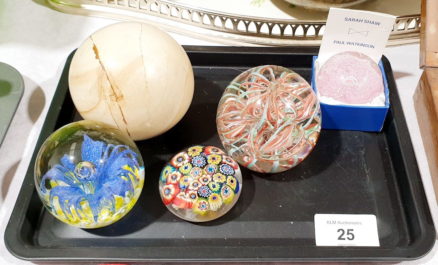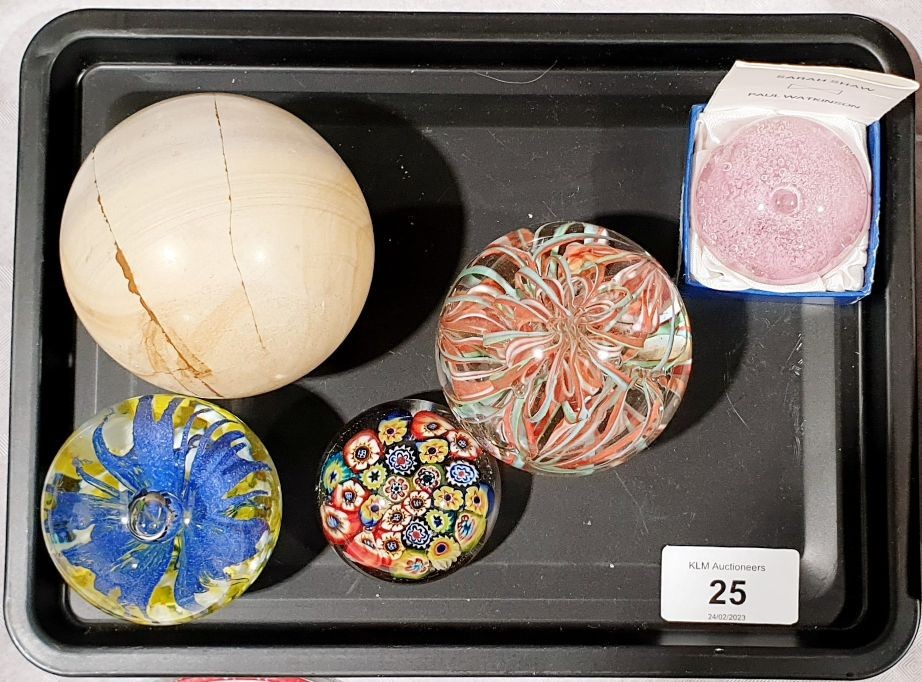 Four paper weights including Millrace and a decorative marble ball. UK shipping £14.