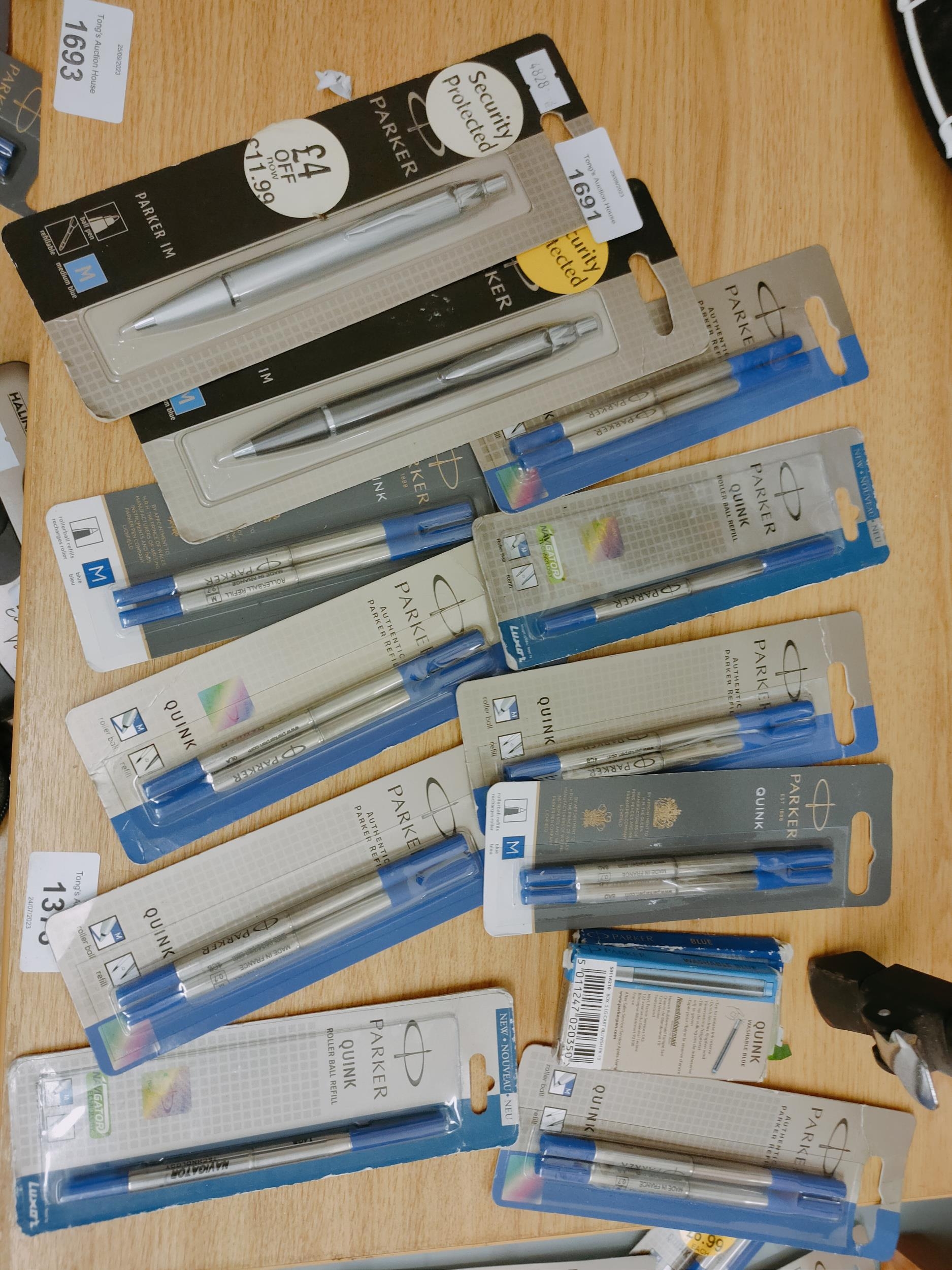 2 Parker refillable ball pens together with a selection of roller ball refills