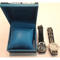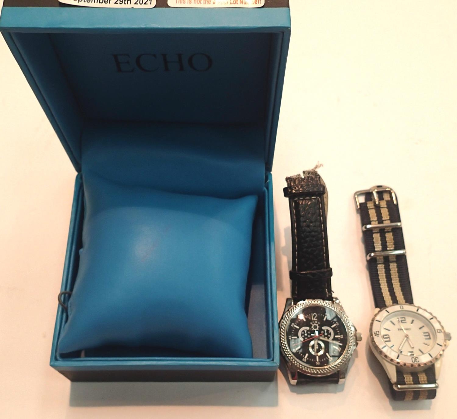 Echo gents boxed wristwatch (no buckle on strap) and a Henley gents ceramic wristwatch on a canvas strap, both requiring batteries (2). P&P Group 1 (£14+VAT for the first lot and £1+VAT for subsequent lots)