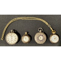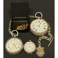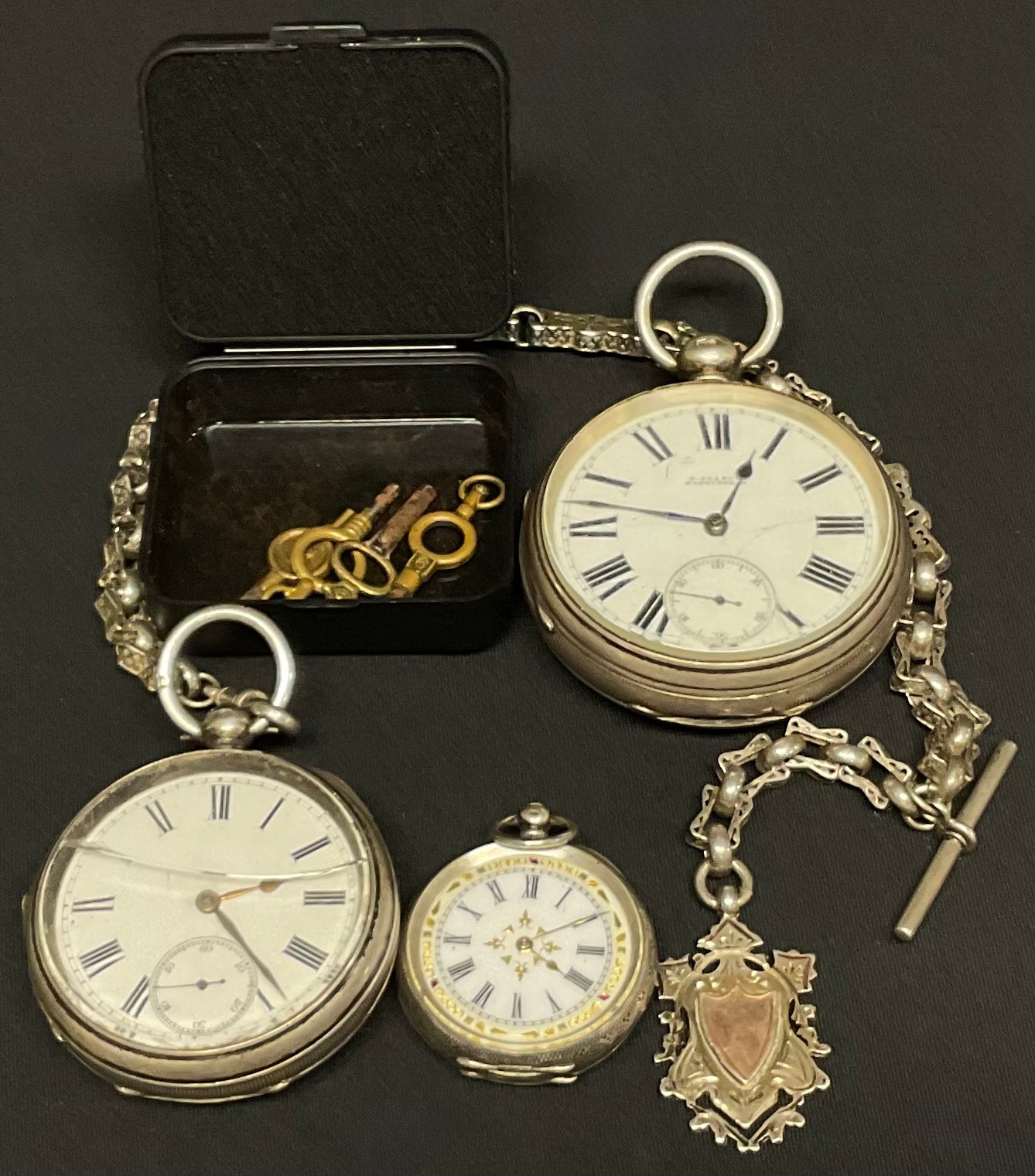 Watches - a Victorian silver pocket watch, white enamel dial, bold Roman numerals, subsidiary seconds, key wind movement, Birmingham 1894, (151g gross) suspended from a fancy link silver Albertina pocket watch chain with medallion pendant, T Bar terminal, (36g gross); a G Pearce, Nottingham Victorian silver over sized pocket watch, London 1876, (233g gross); another continental 935 silver cased fob watch (39.5g gross) and 4x pocket watch keys
