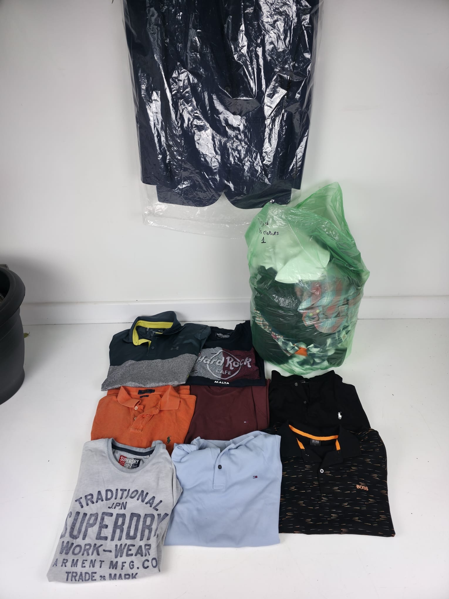 A large collection of menĂ¢??s clothing, comprising a good quantity of quality gentswear including polo shirts, tops, sportswear and outerwear, together with a Moss suit (Moss Esq.), complete and presented on a hanger. The clothing includes examples by brands such as Ralph Lauren, Hugo Boss, Superdry, Adidas and others. Most items appear in good condition and are predominantly size Large.