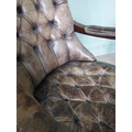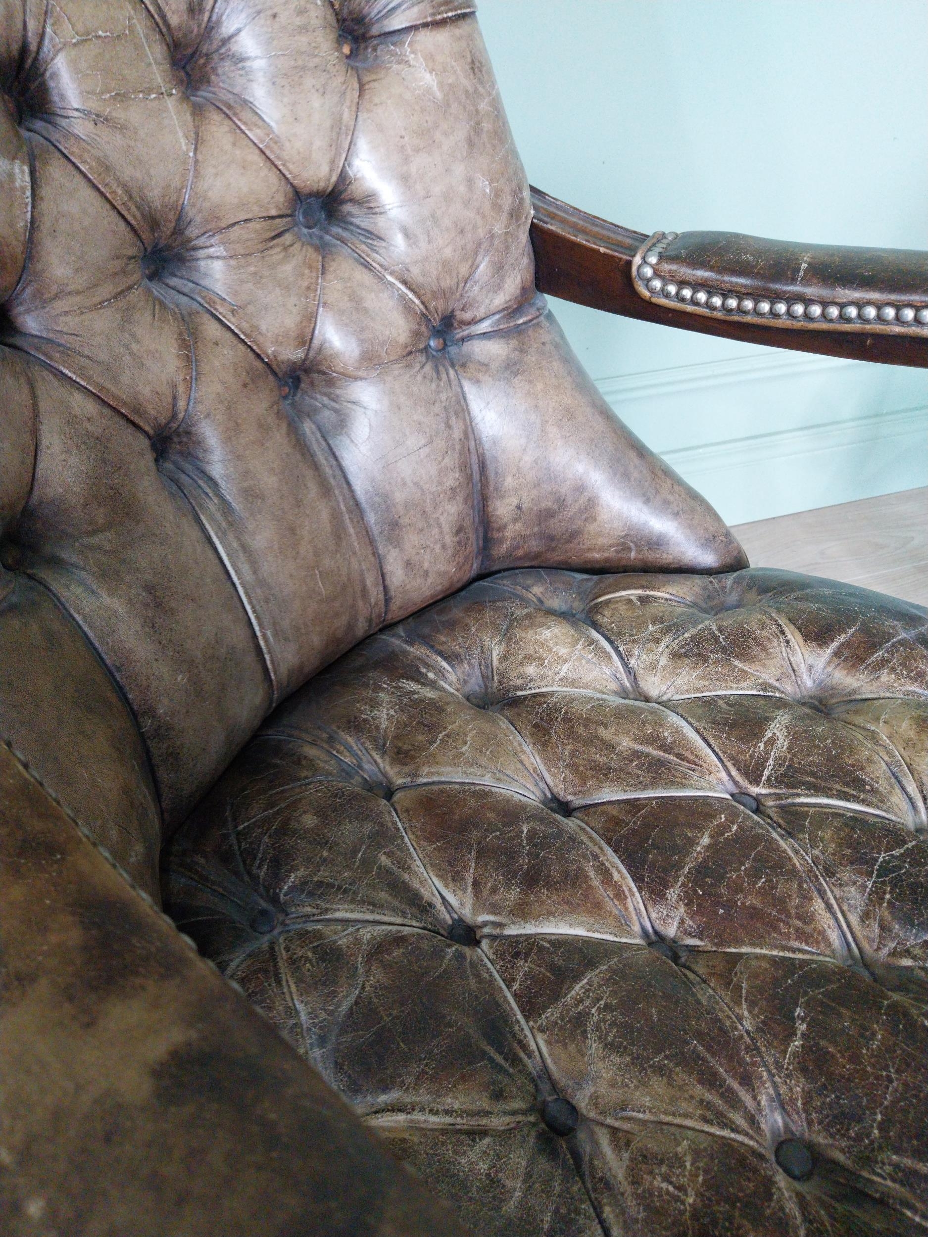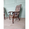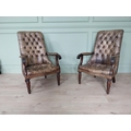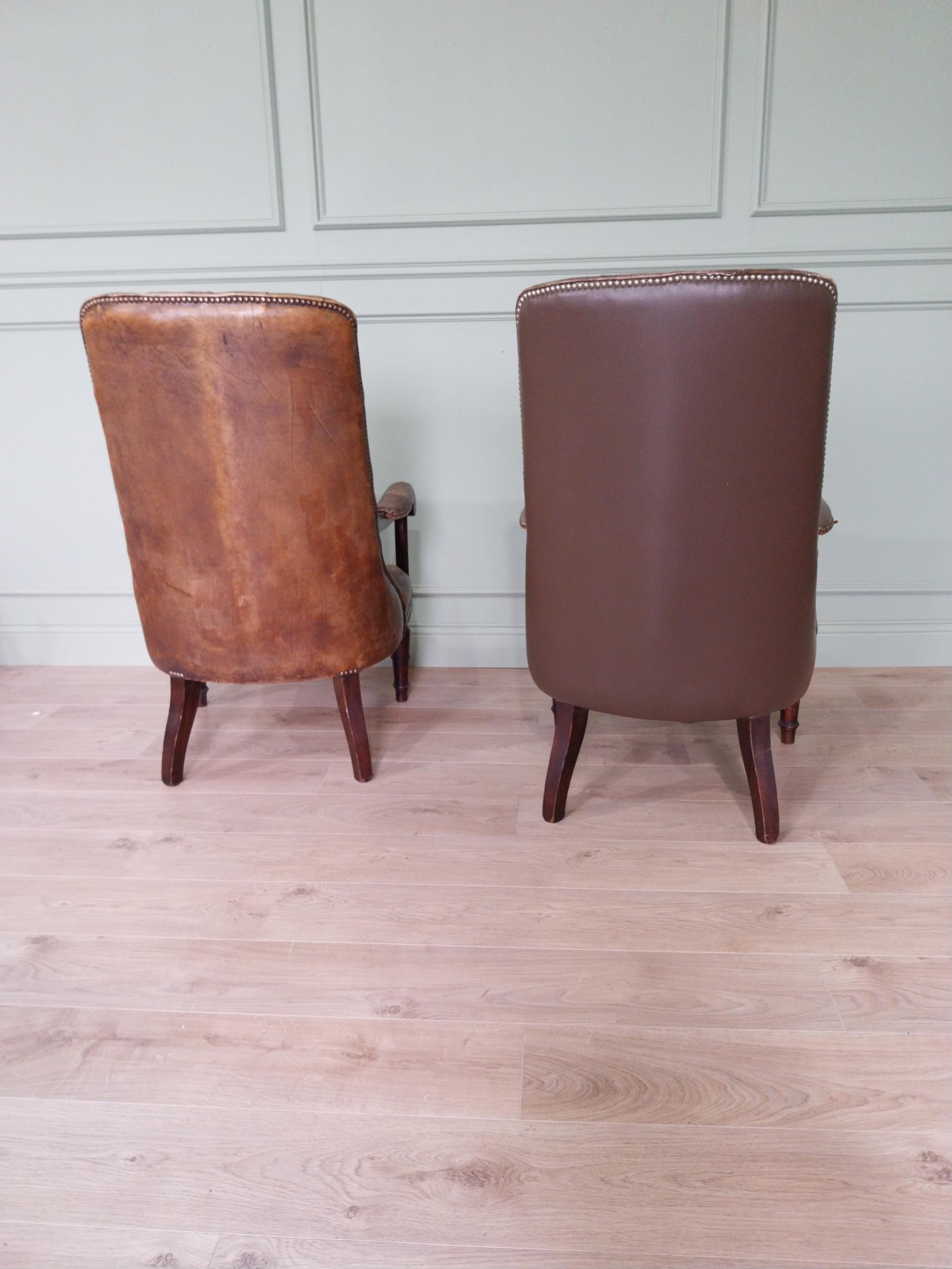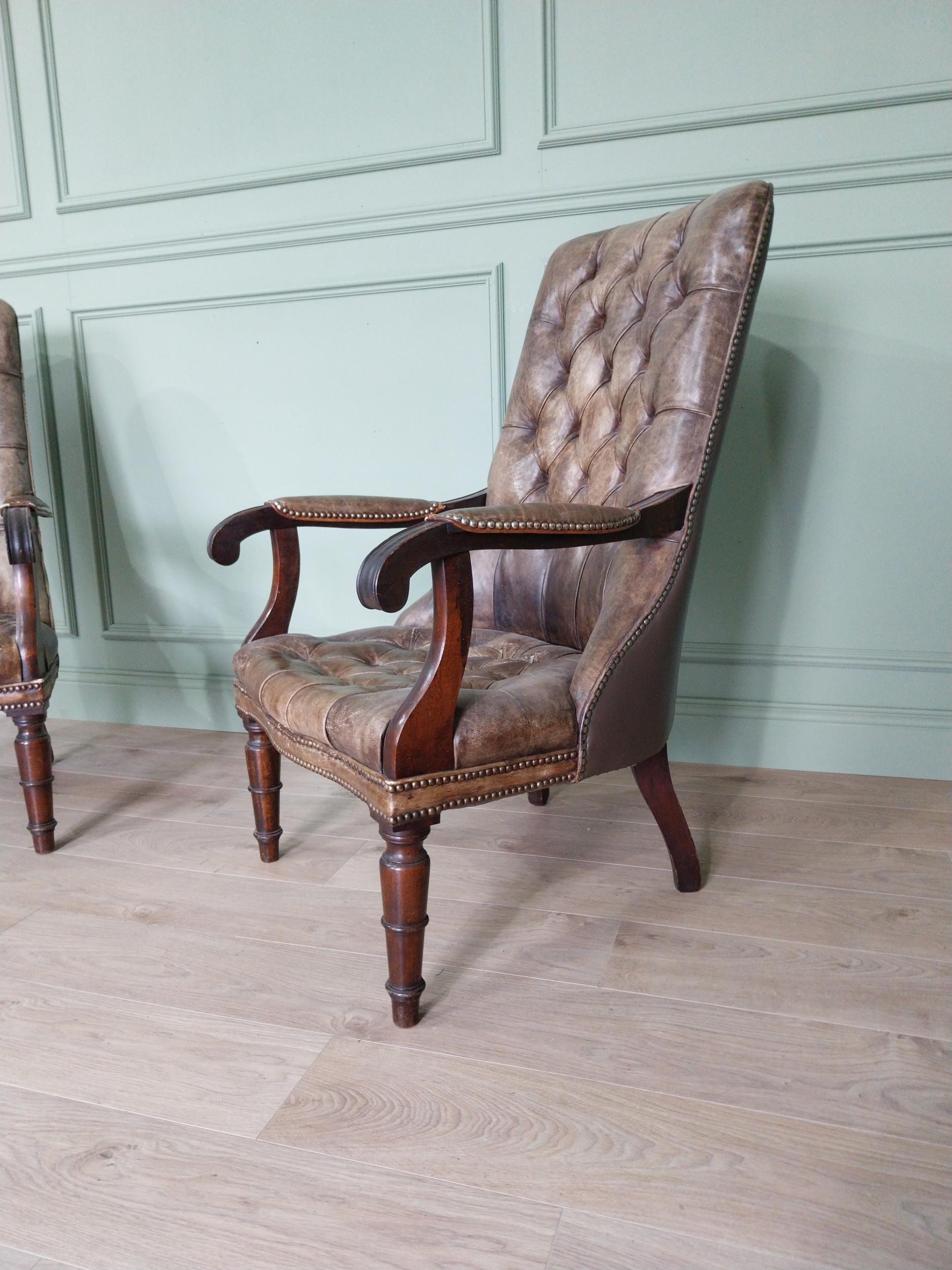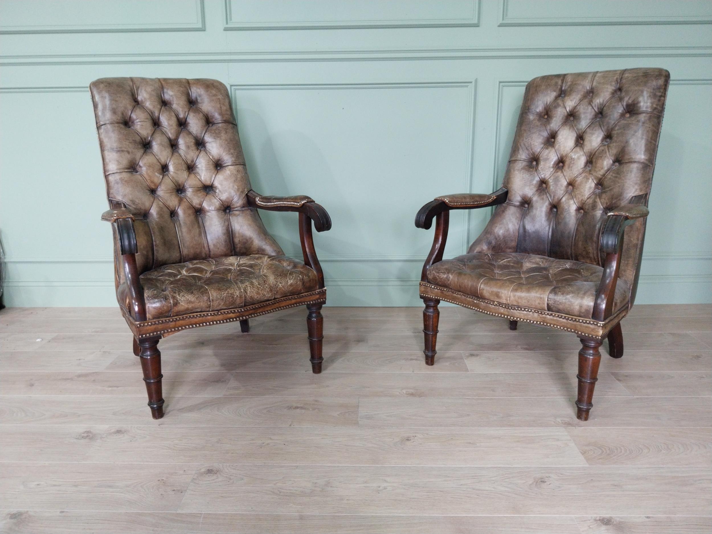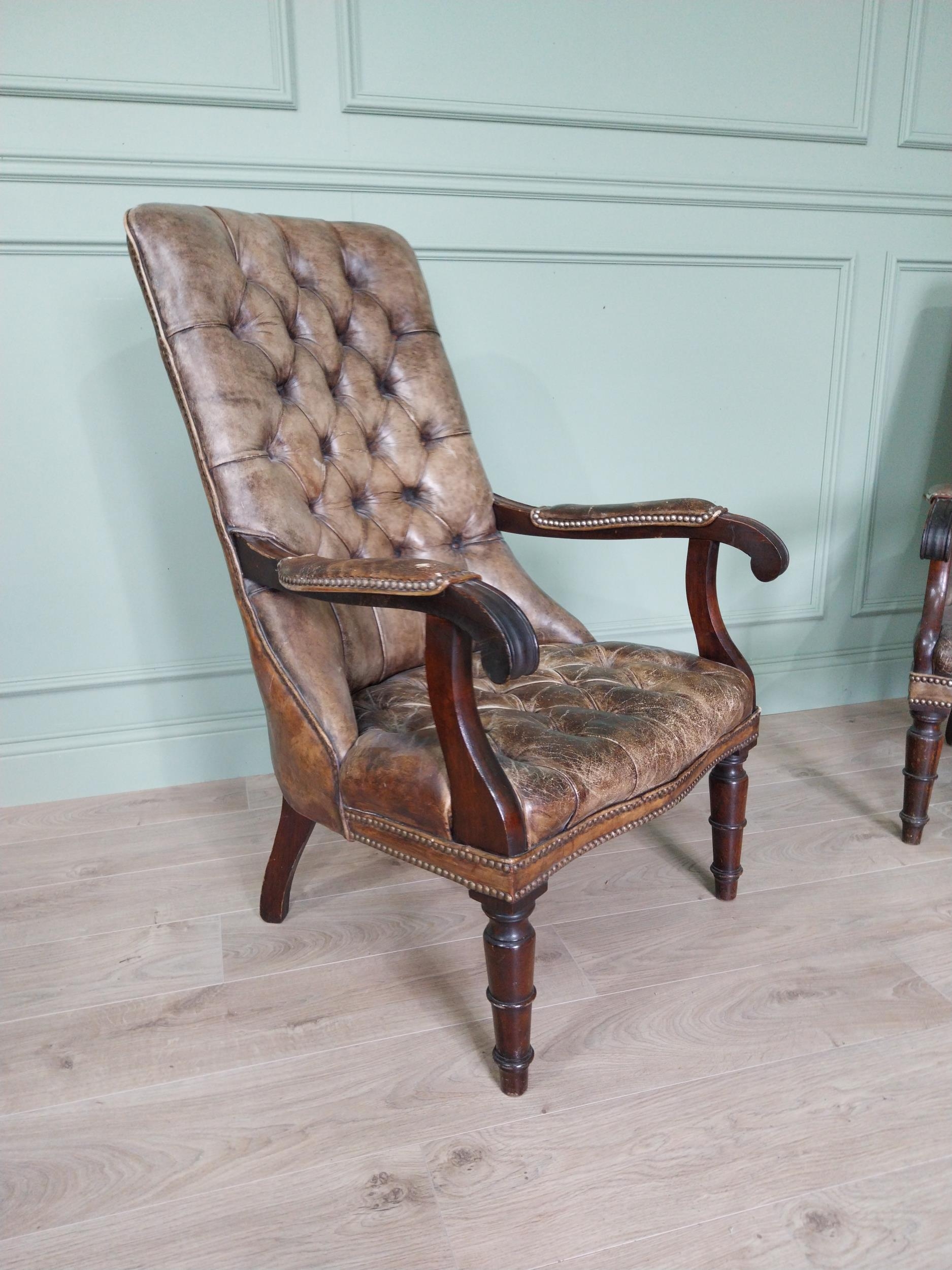 Pair of good quality deep buttoned leather upholstered library chairs on turned tapered legs. {108 cm H x 69 cm W x 80 cm D}.