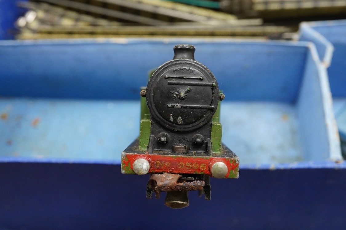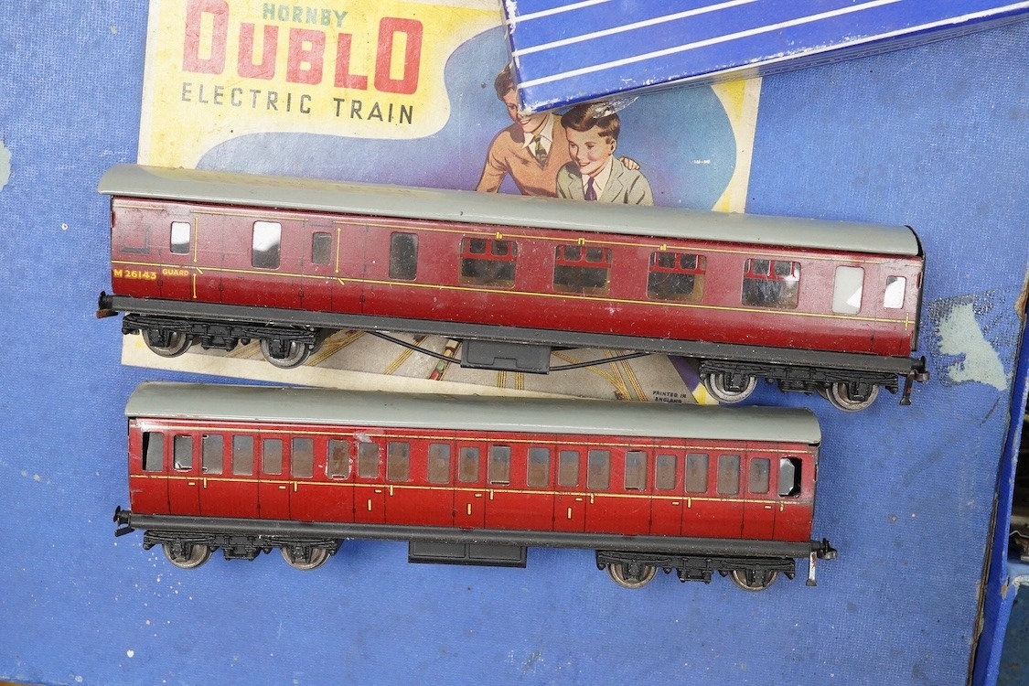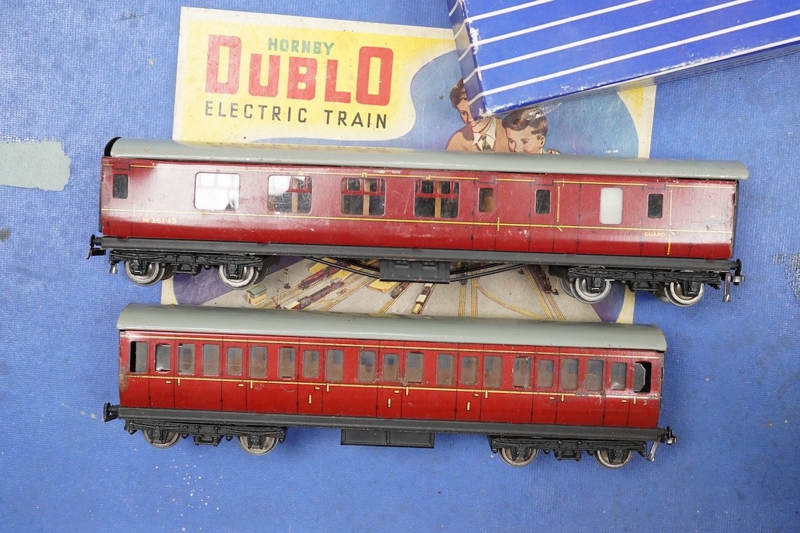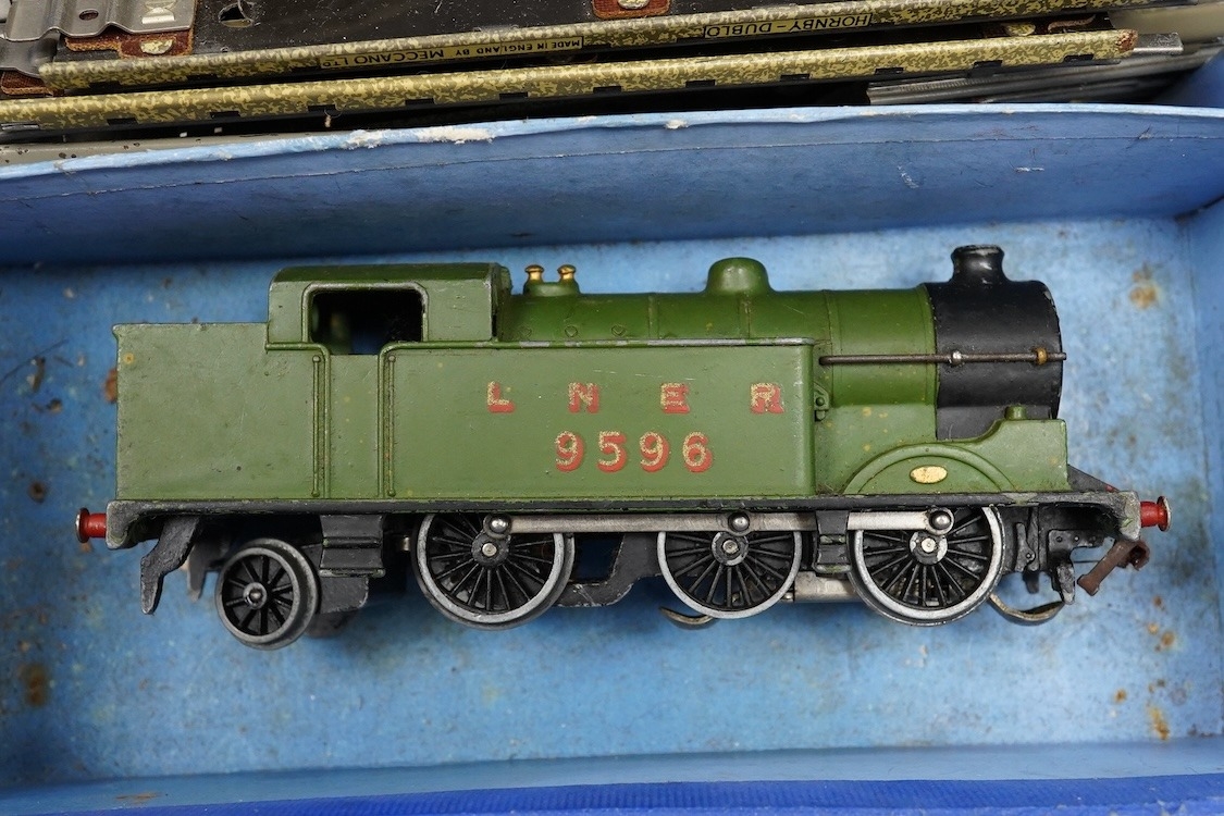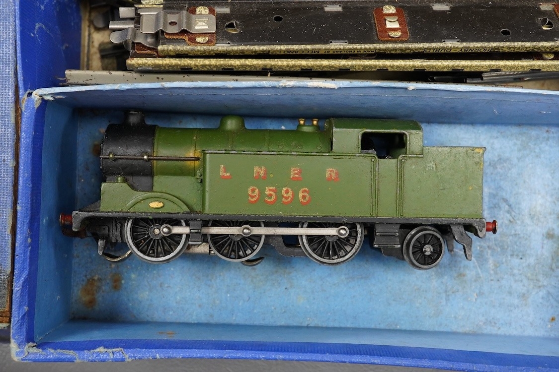 A small collection of Hornby Dublo railway for 3-rail running, including; an LNER class N2, 0-6-2T locomotive, 9596, in green livery, together with two bogie coaches, an open wagon, a D1 level crossing and a selection of track sections, contained within a box for an EDG7 Tank Goods Train set