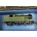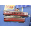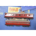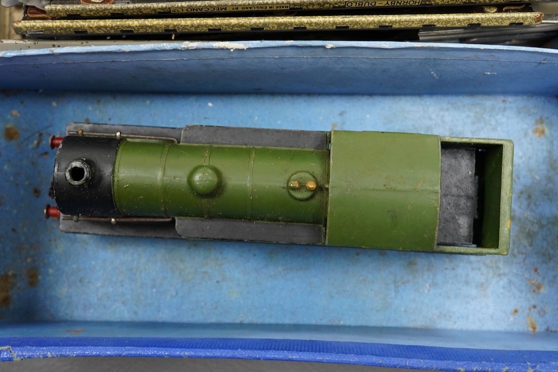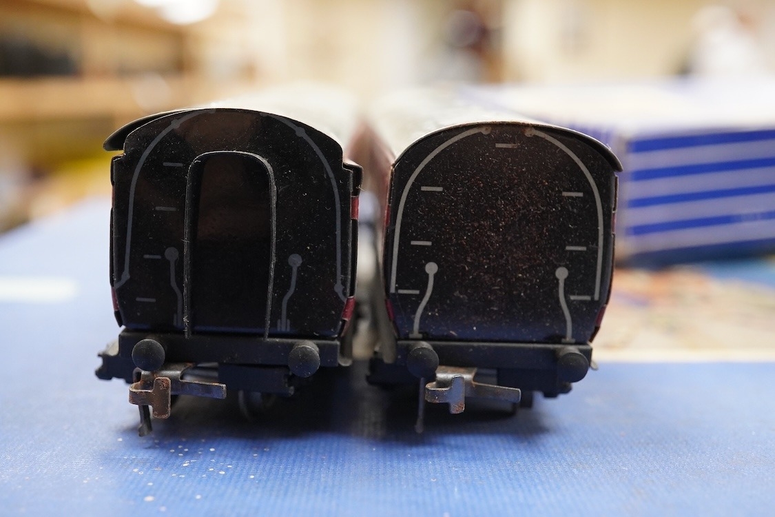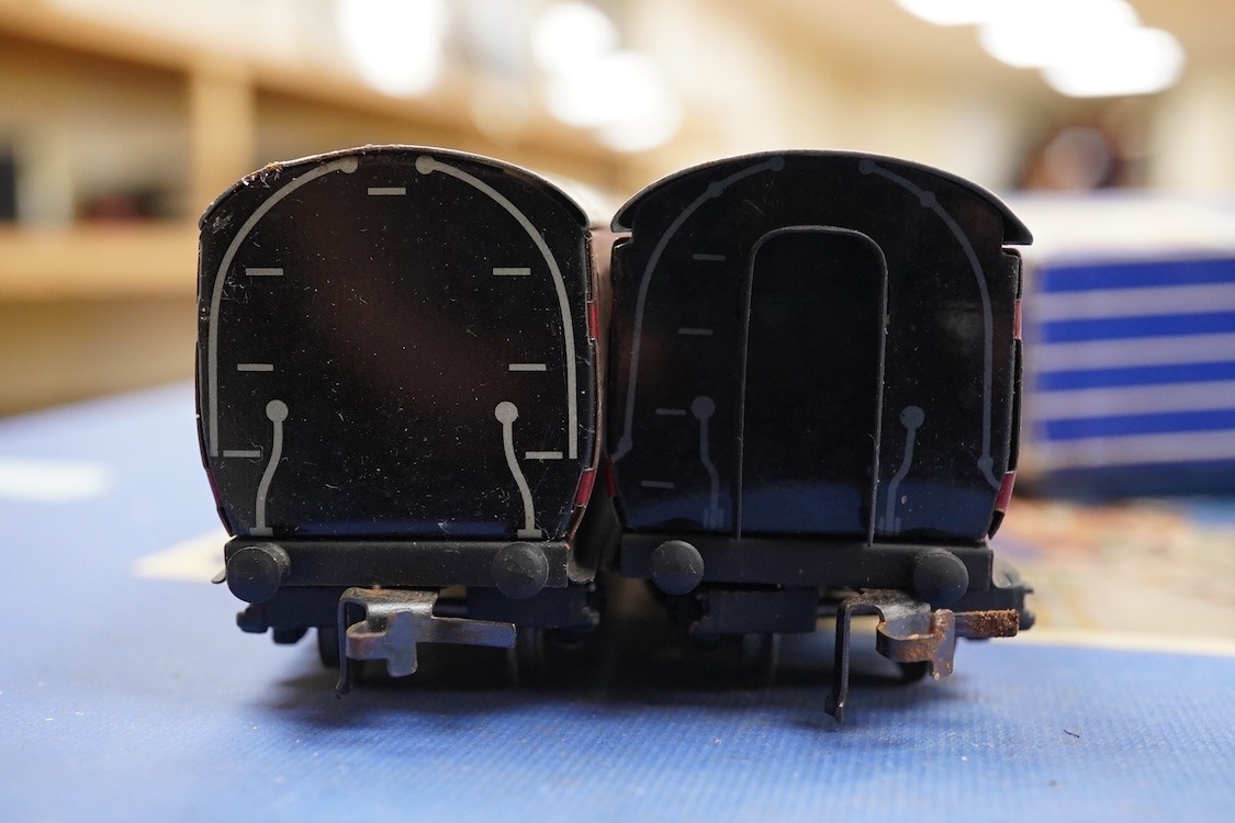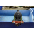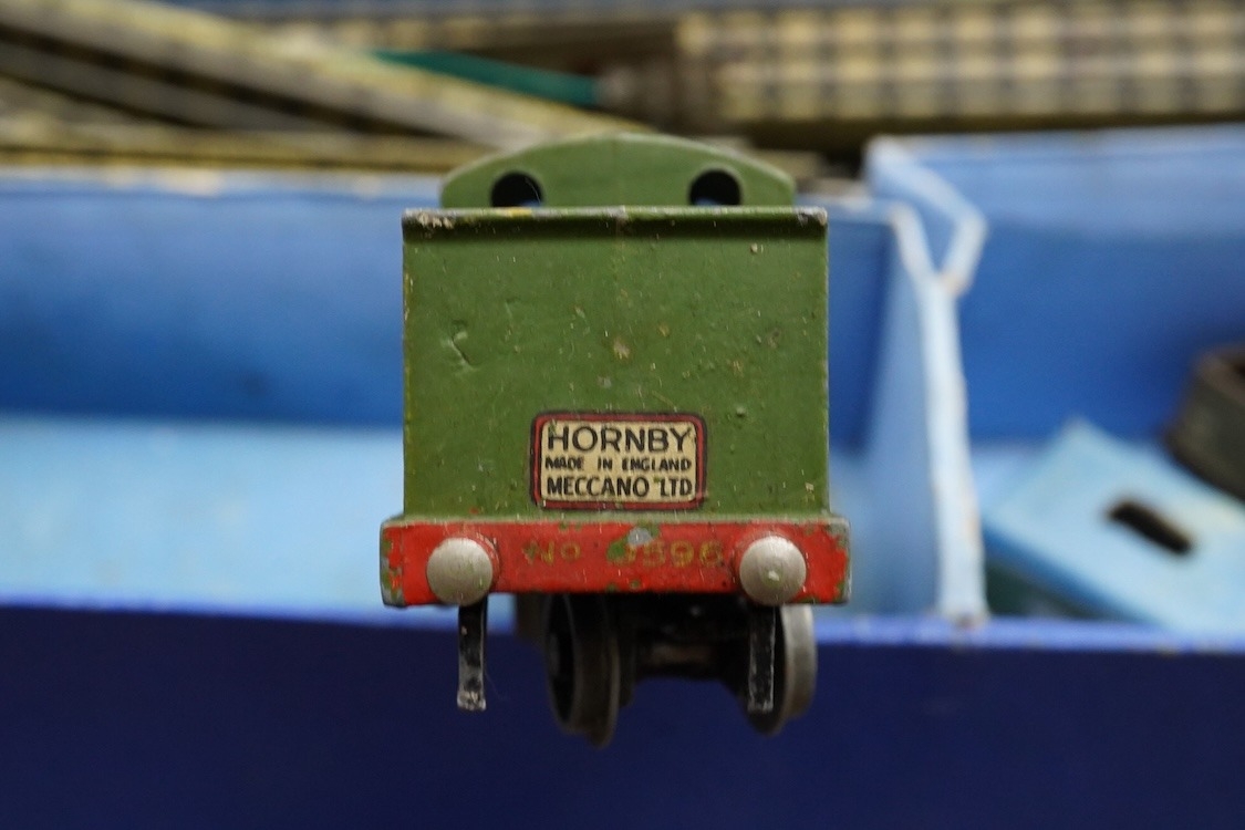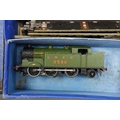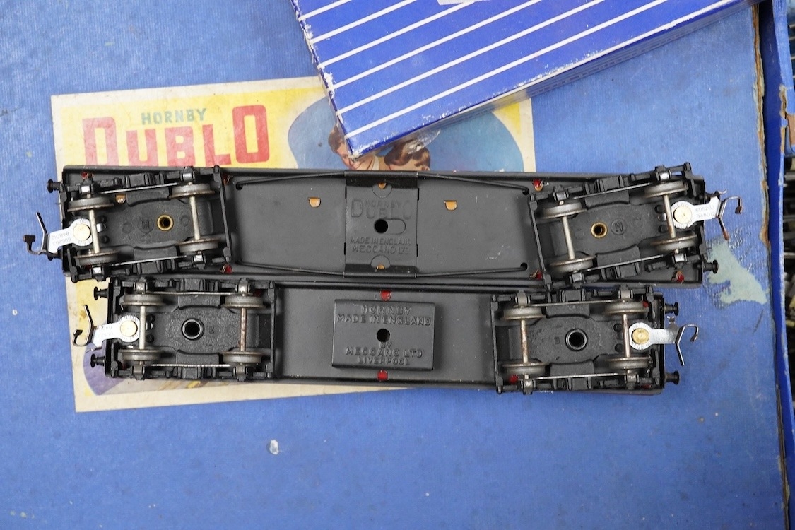 A small collection of Hornby Dublo railway for 3-rail running, including; an LNER class N2, 0-6-2T locomotive, 9596, in green livery, together with two bogie coaches, an open wagon, a D1 level crossing and a selection of track sections, contained within a box for an EDG7 Tank Goods Train set