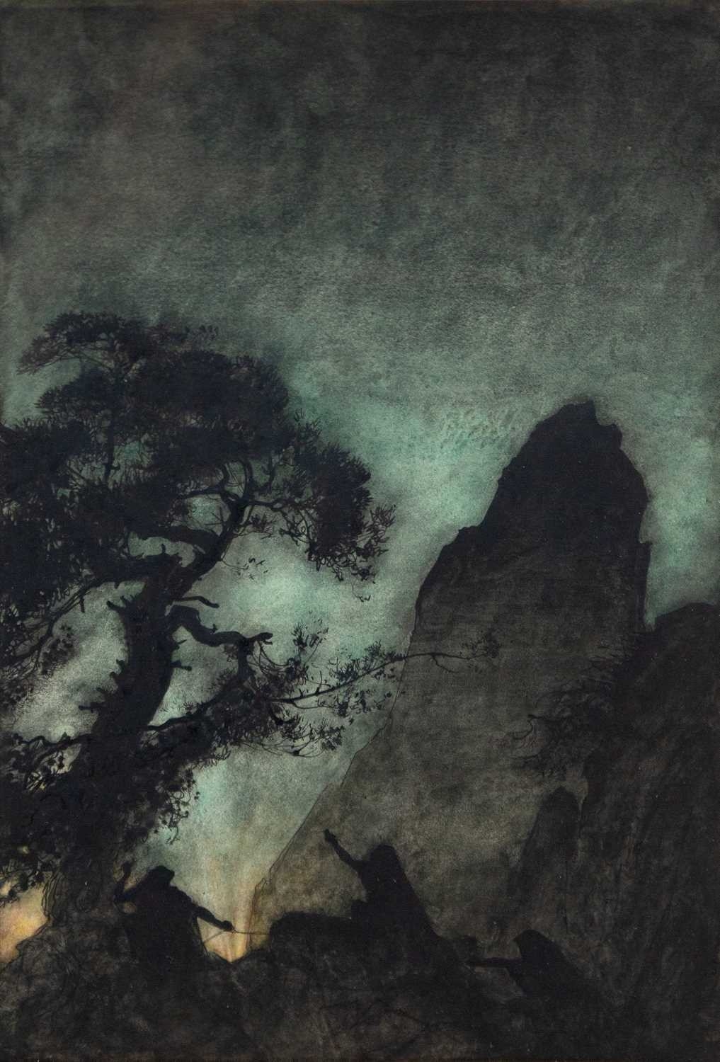 Arthur Rackham (1867-1939) The Three Norns Winding the Rope of Fate Original pen, ink, and watercolour, mounted, framed, and glazed (54 x 43.5 cm), with exhibition labels on verso. The Three Norns Winding the Rope of Fate portrays Erda’s daughters beneath Brünnhilde’s rock, created as an illustration (“The Three Norns,” p.103) for Rackham’s 1911 edition of Richard Wagner’s Siegfried & the Twilight of the Gods. Exhibited at the Leicester Galleries, Exhibition of Works by Arthur Rackham, November 1911, Lot 23; subsequently acquired by Miss Ionides, later appearing in The Fine Art Society’s Arthur Rackham retrospective, February 1971, with exhibition labels retained on the verso. This work exemplifies Rackham’s unique ability to blend mythological depth with lyrical artistry. Drawing on Norse mythology, the Norns—Urd, Verðandi, and Skuld—sit beneath Brünnhilde’s rock, weaving the threads of fate that govern gods and mortals alike. Rooted in Wagner’s reinterpretation of these figures, the illustration captures the eternal guardianship of destiny at the heart of the cosmos. With its distinguished provenance, mythological resonance, and iconic status within Rackham’s Wagner series, the piece embodies both the enduring allure of Norse myth and the Edwardian fascination with Wagnerian drama. Provenance; Michael Webb, former Director of Bonhams, by inheritance.