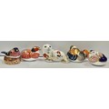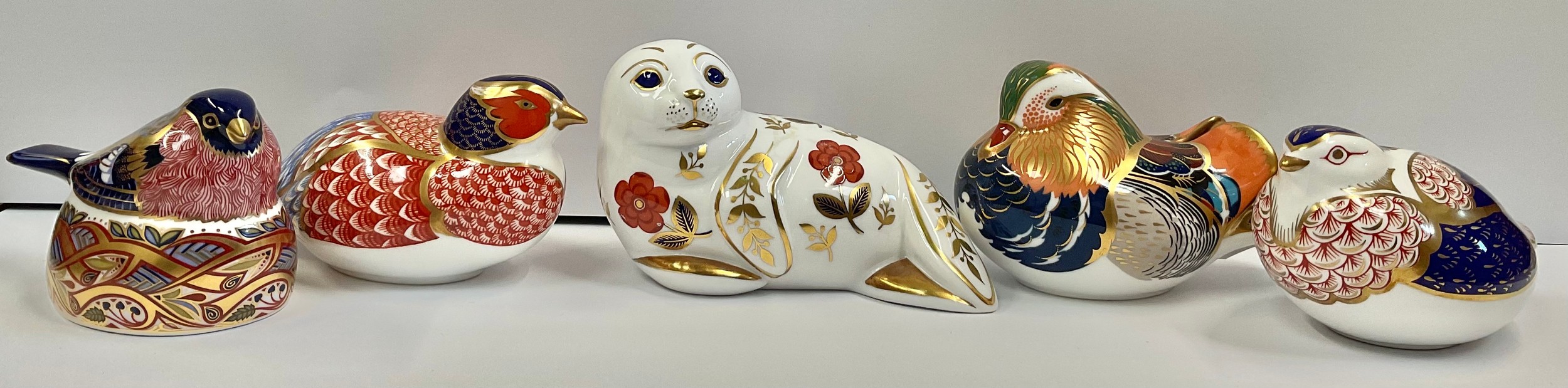 A Royal Crown Derby paperweight, Bullfinch Nesting, silver stopper, 6.5cm high; others, Mandarin Duck, silver stopper, Pheasant, silver stopper, 17cm long; Quail, silver stopper, 6.5cm high; Seal, no stopper, 12.5cm wide (5)