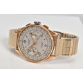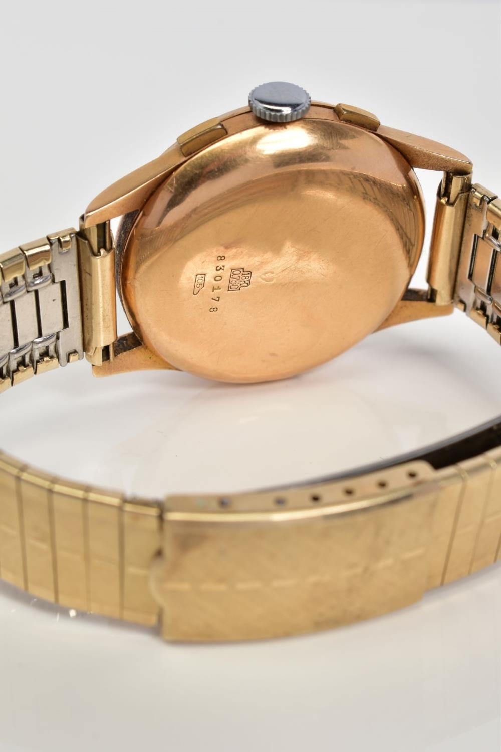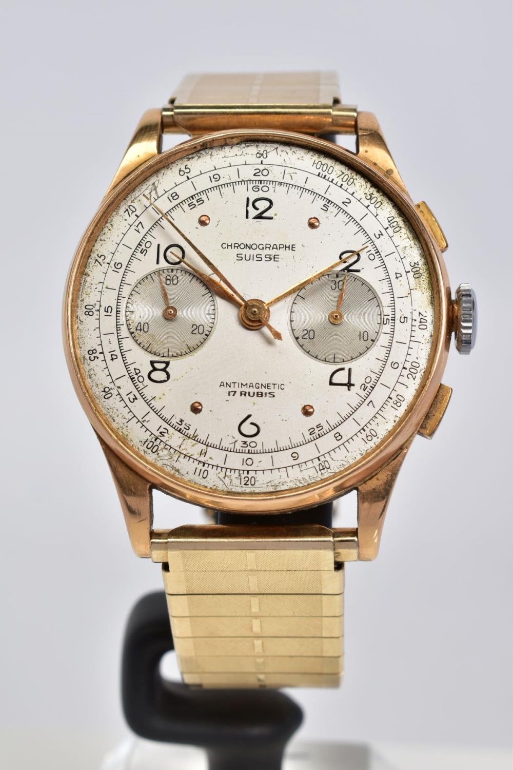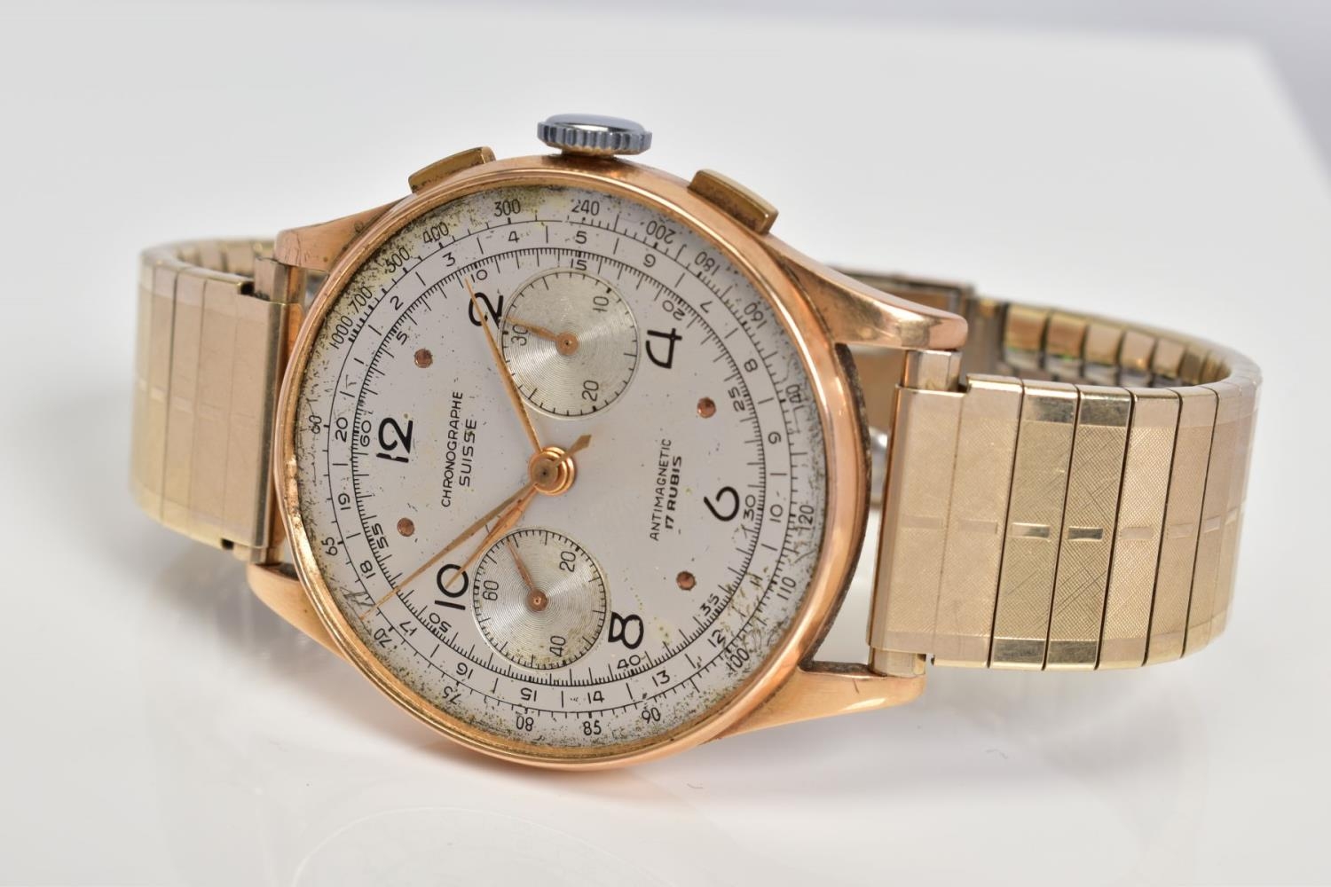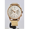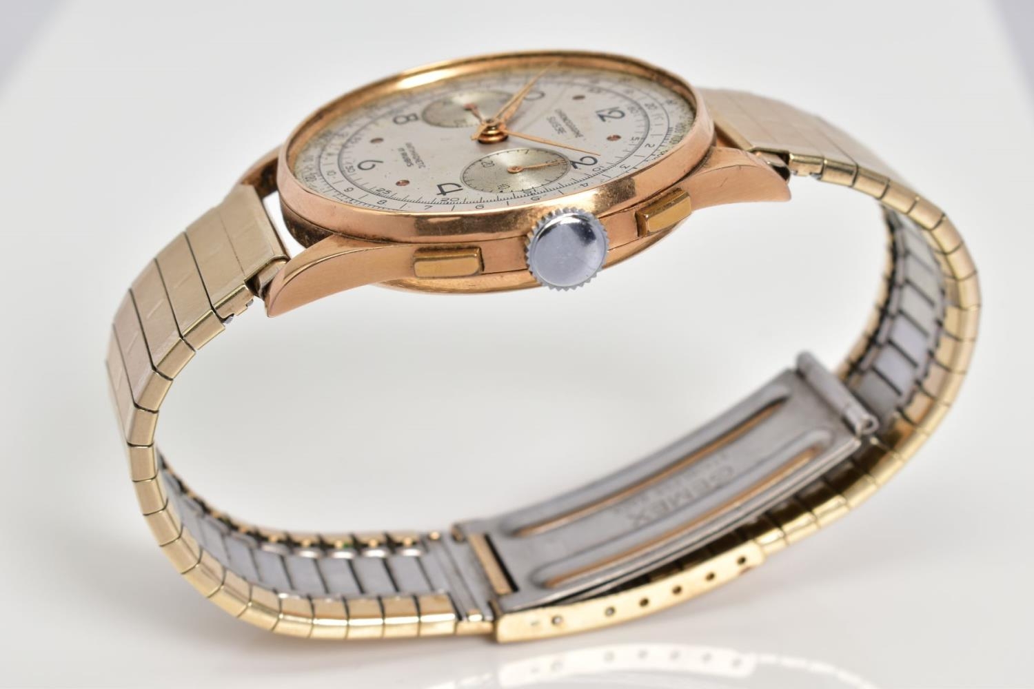 A GENTLEMENS CHRONOGRAPHE SUISSE WRISTWATCH, the silver dial with Arabic numerals and dot markers, two subsidiary dials placed at three and six o'clock, two pushers, case back stamped 18k 830178, attached to a rolled gold on stainless steel link bracelet, approximate case width 36mm, approximate bracelet diameter 60mm, approximate gross weight 67.0 grams (condition: glass is missing)