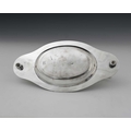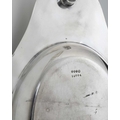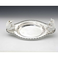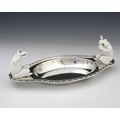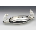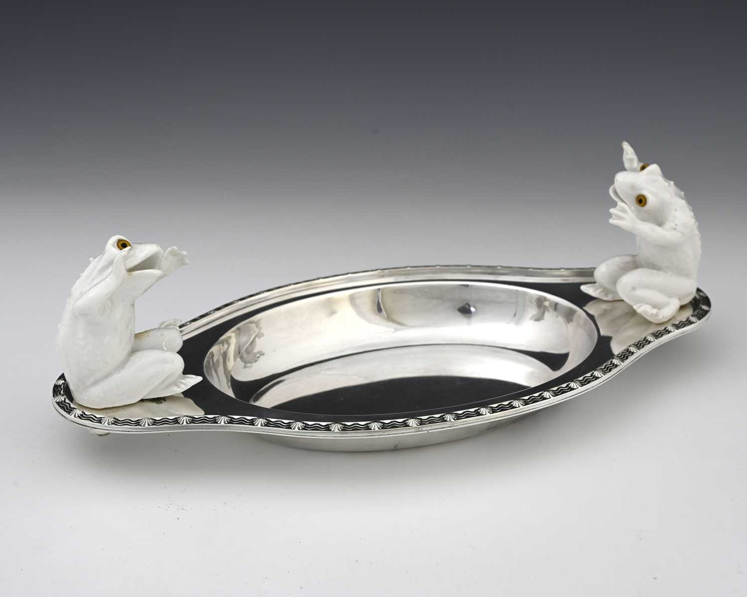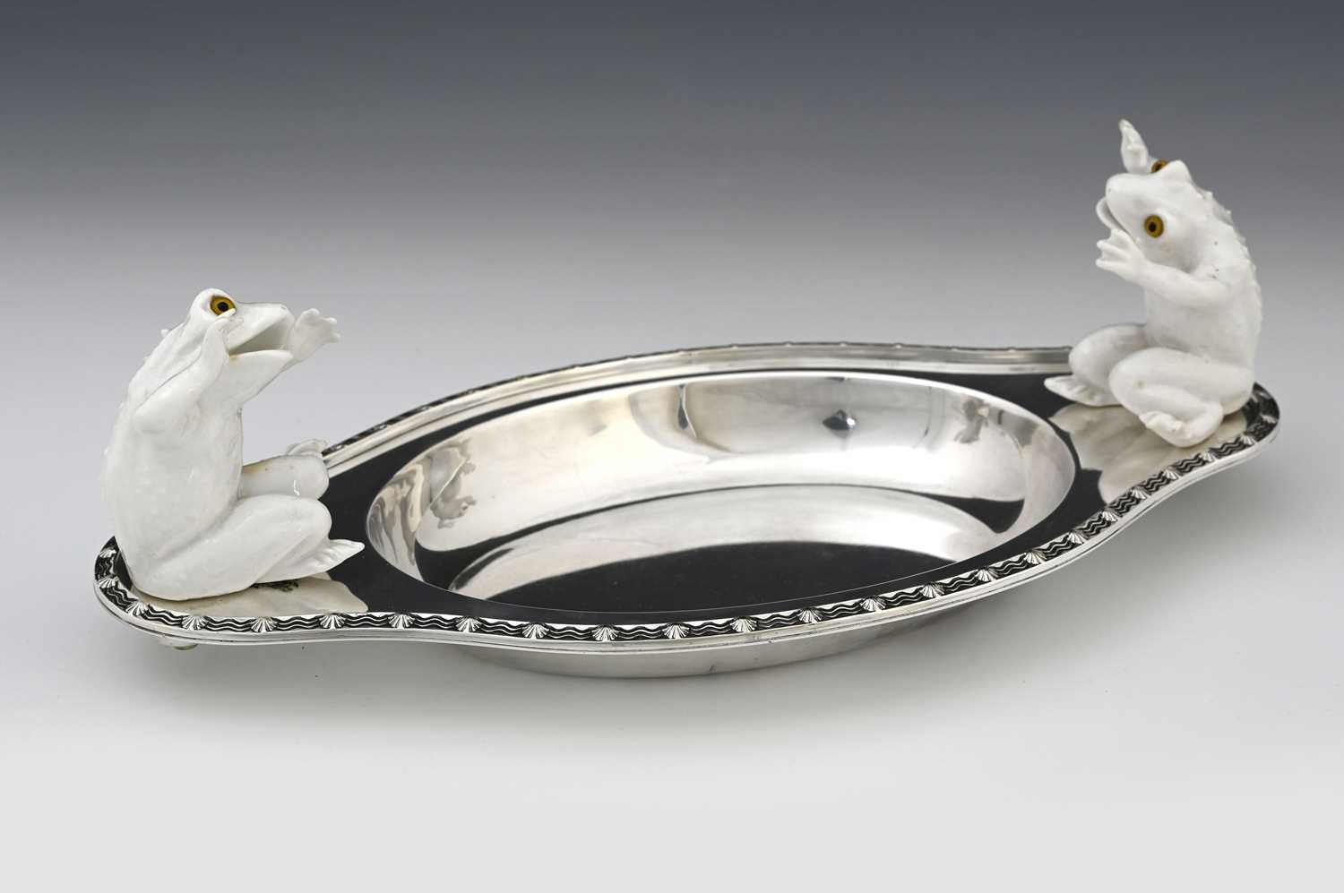 Christopher Dresser for Hukin and Heath, an Aesthetic Movement silver plate and ceramic dish, circa 1880, oval ogee form with cast scallop shell and wave border, the handles mounted with white ceramic toads, modelled in high relief sitting with characterful startled poses and set with glass eyes, the figures probably Minton of Coalport, marked H&H to both the metal and porcelain, 35cm long Note: reminiscent of Dresser's famous wardrobe door panel depicting falling toads, designed for Bushole House, Leicester, this Hukin and Heath dish combines the fashion for the novelty and grotesque so popular at the time, with repeat motifs and functionality, for which Dresser was known.