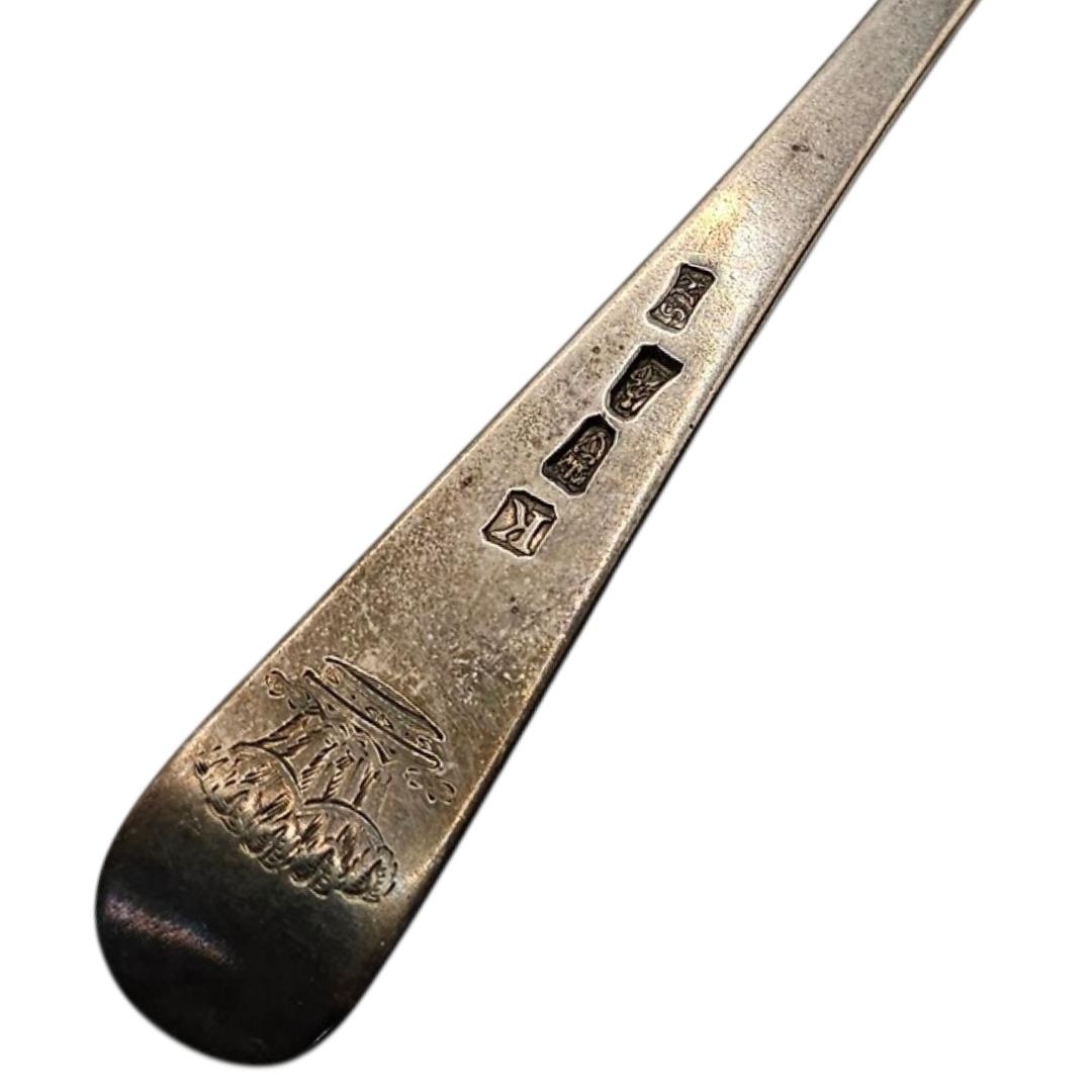 Hallmarked Dublin, 1806, Old English pattern with engraved family crest showing ostrich feathers plume above a ducal coronet to reverse terminal.