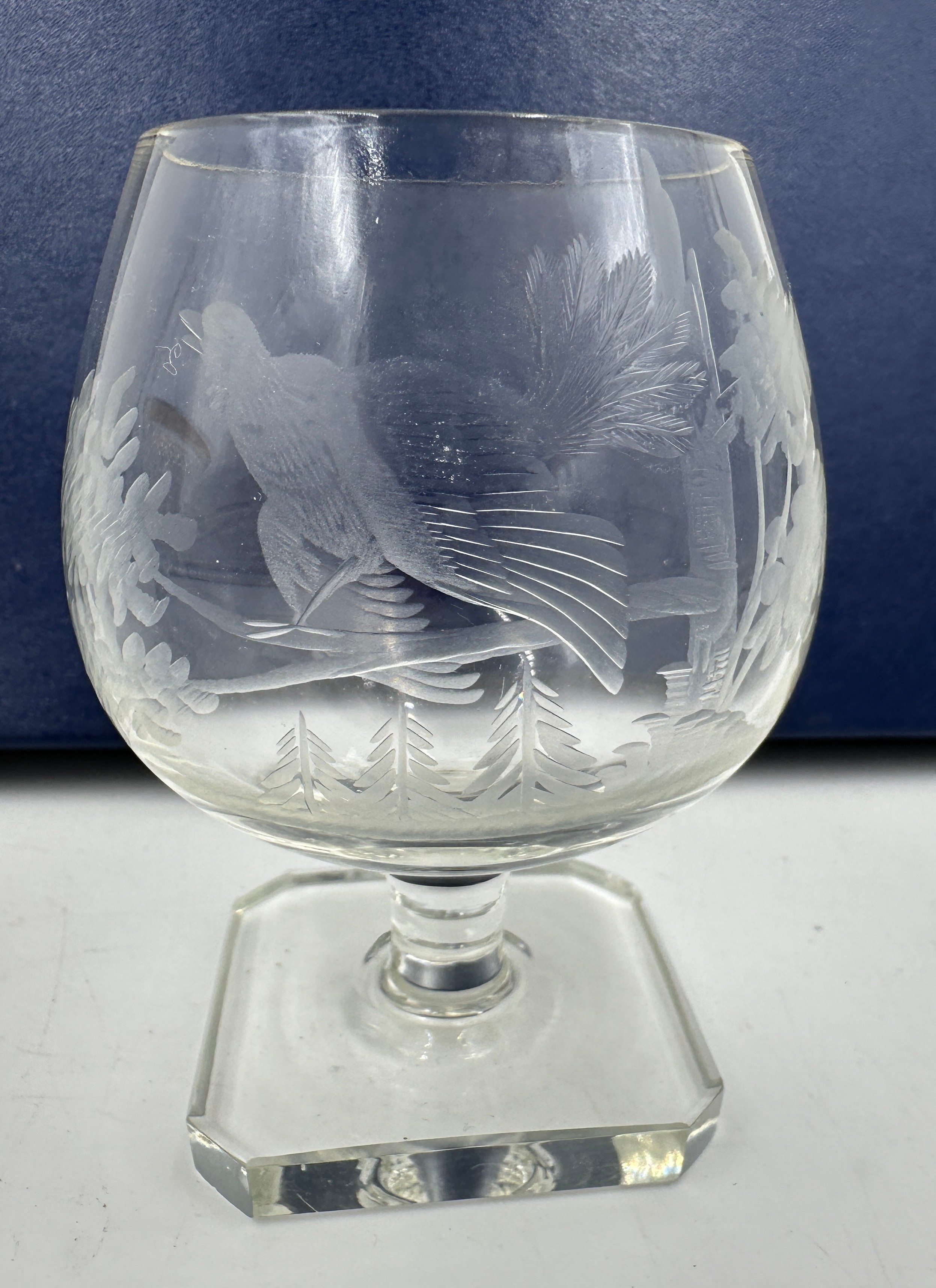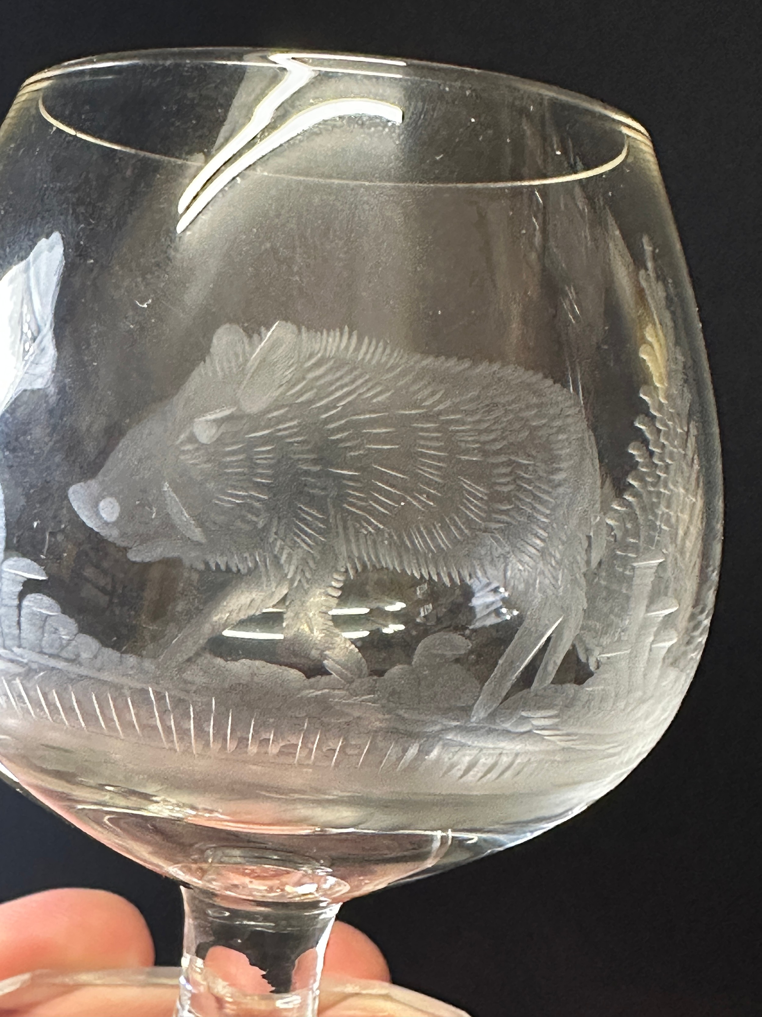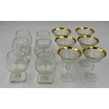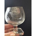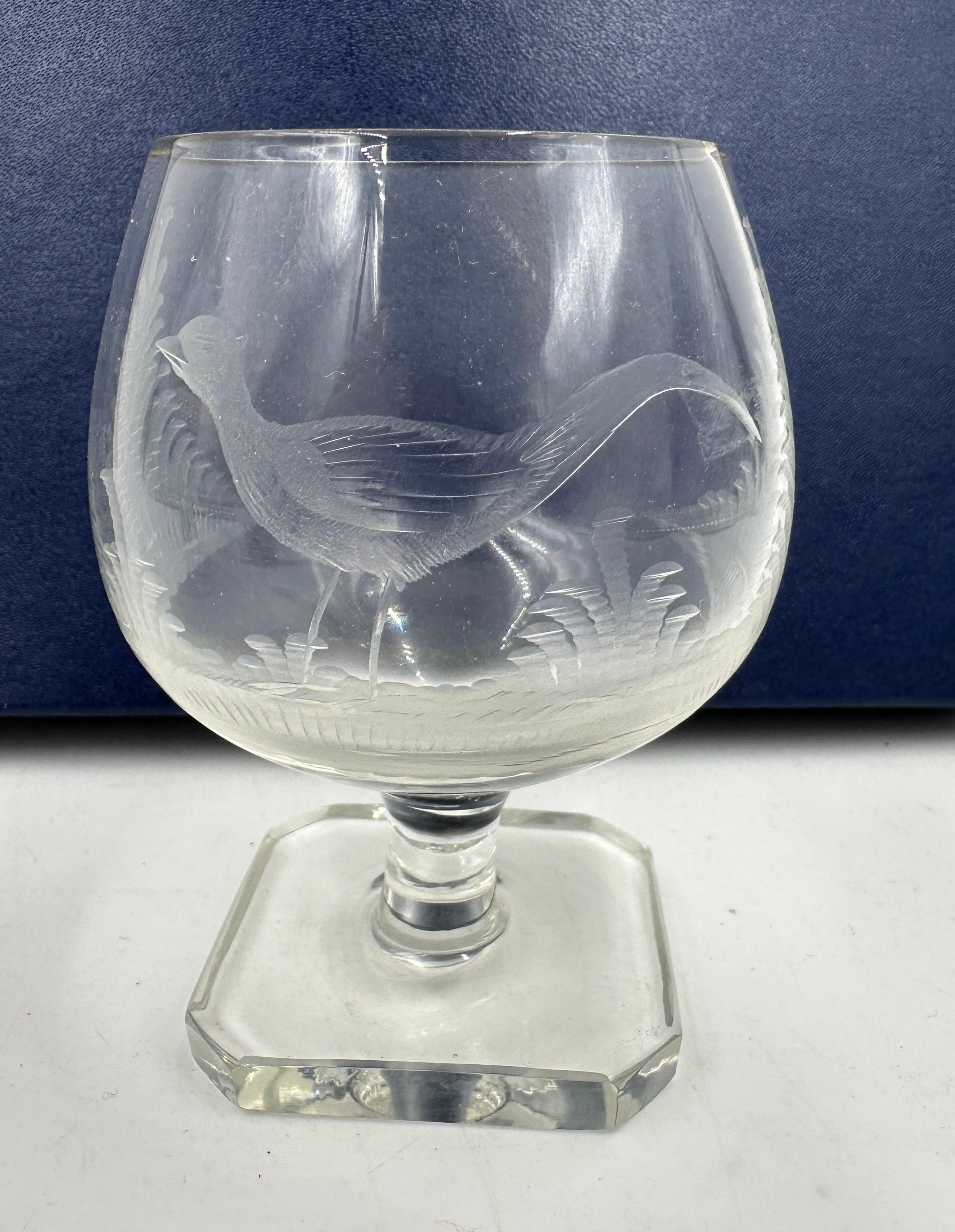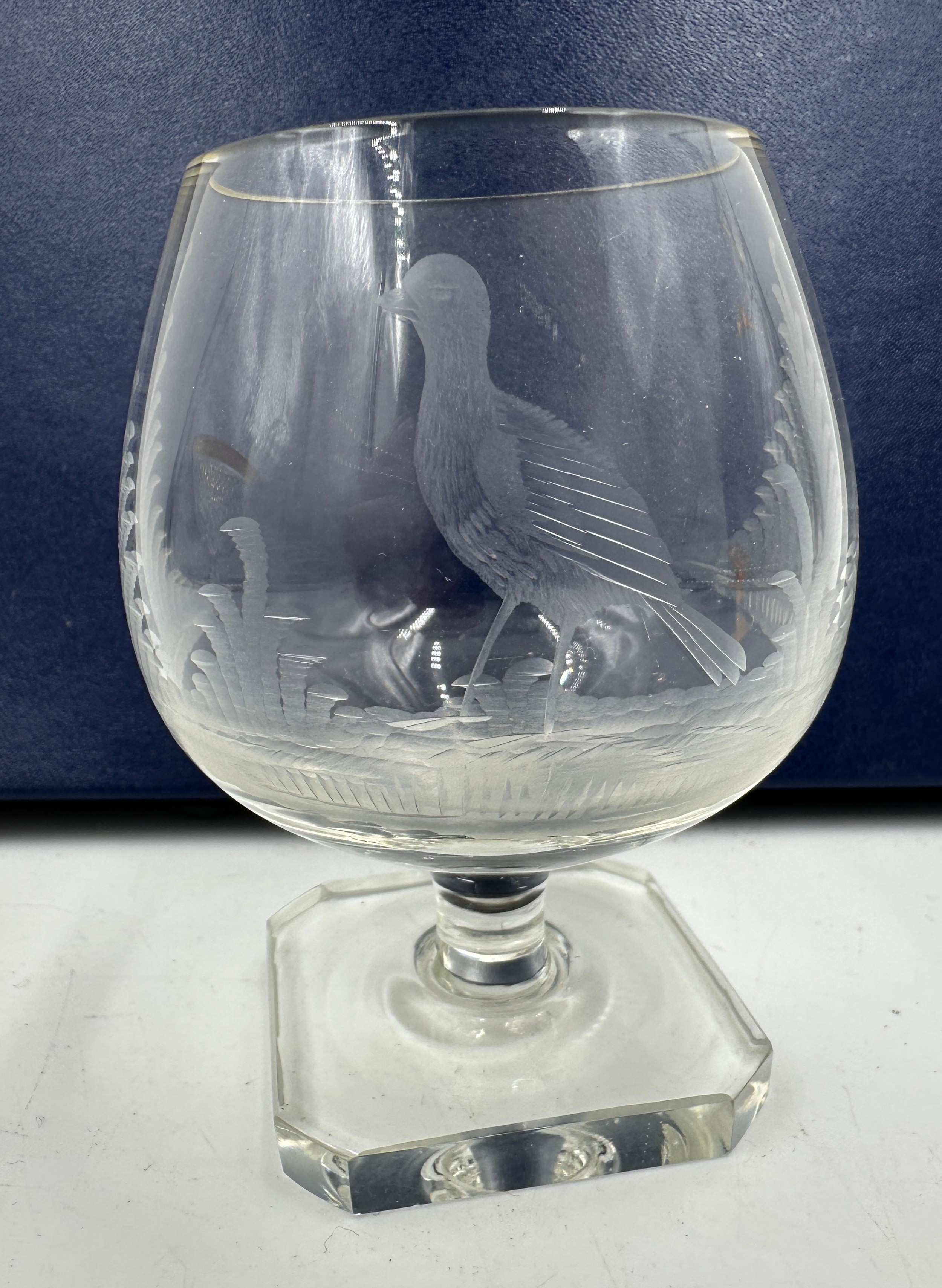 A set of six Rowland Ward engraved Brandy glasses, 9.5cm h, depicting various animals and birds, together with liqueur glasses with gold rims, 10cm h, possibly Moser. (12).