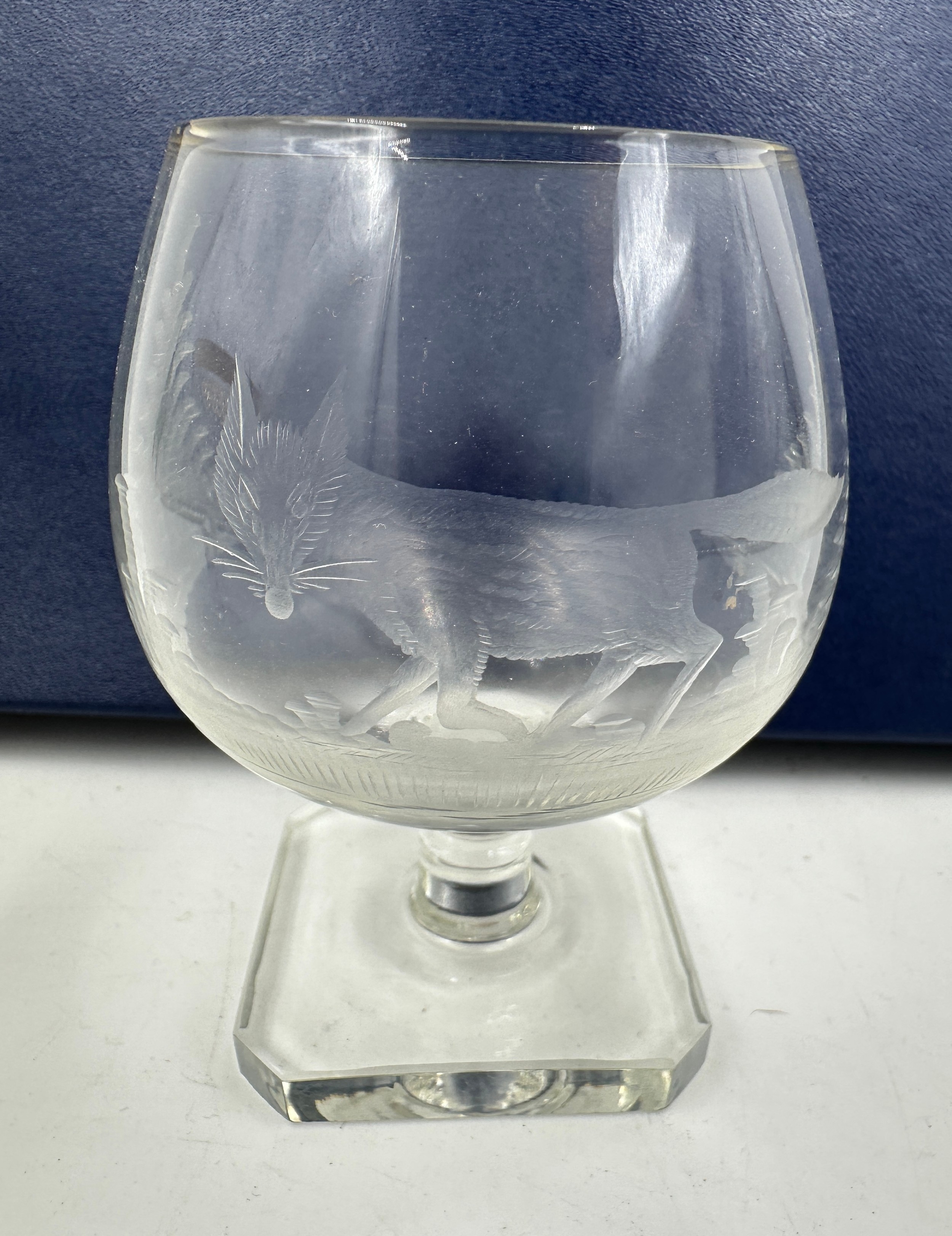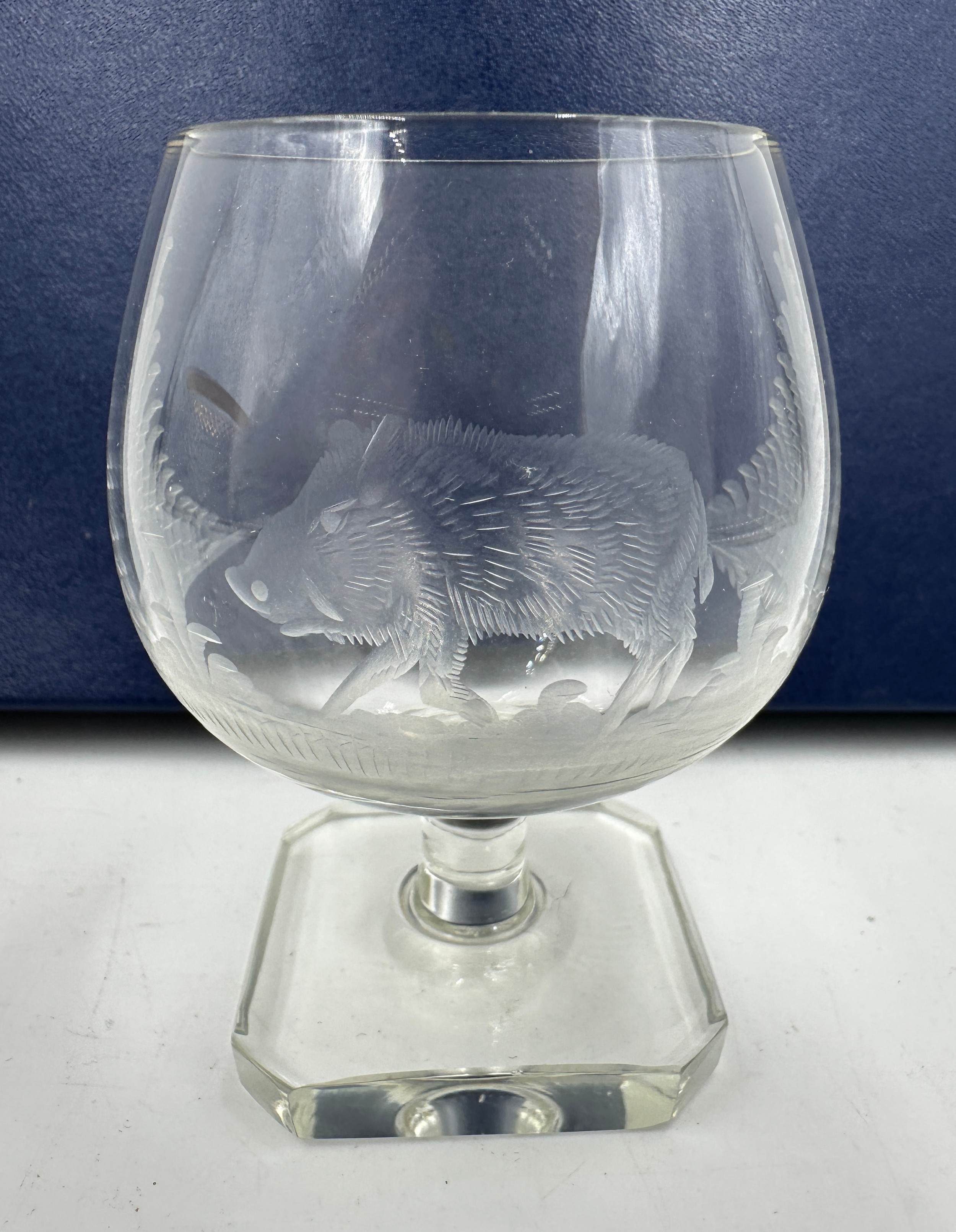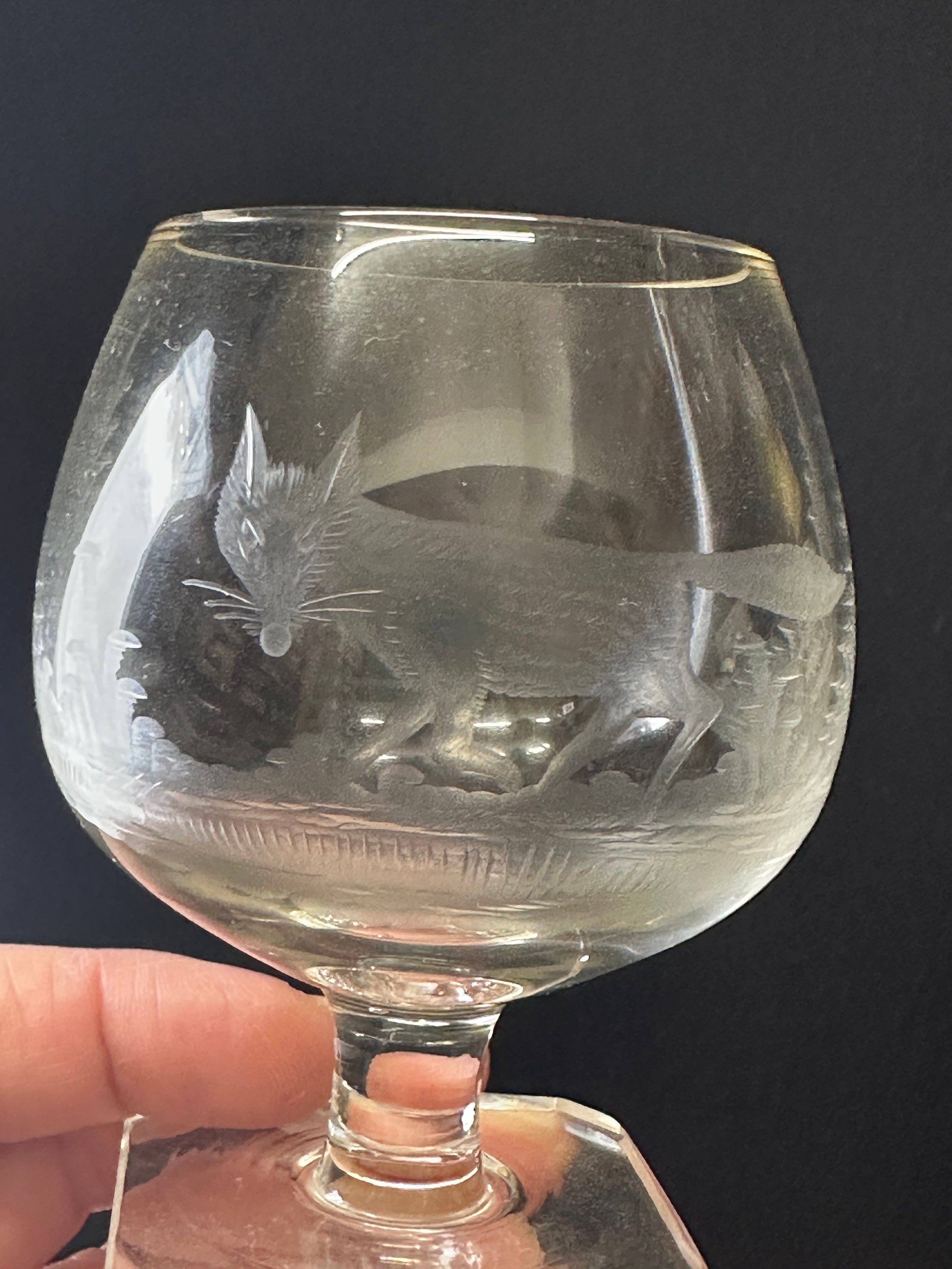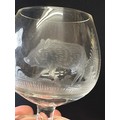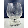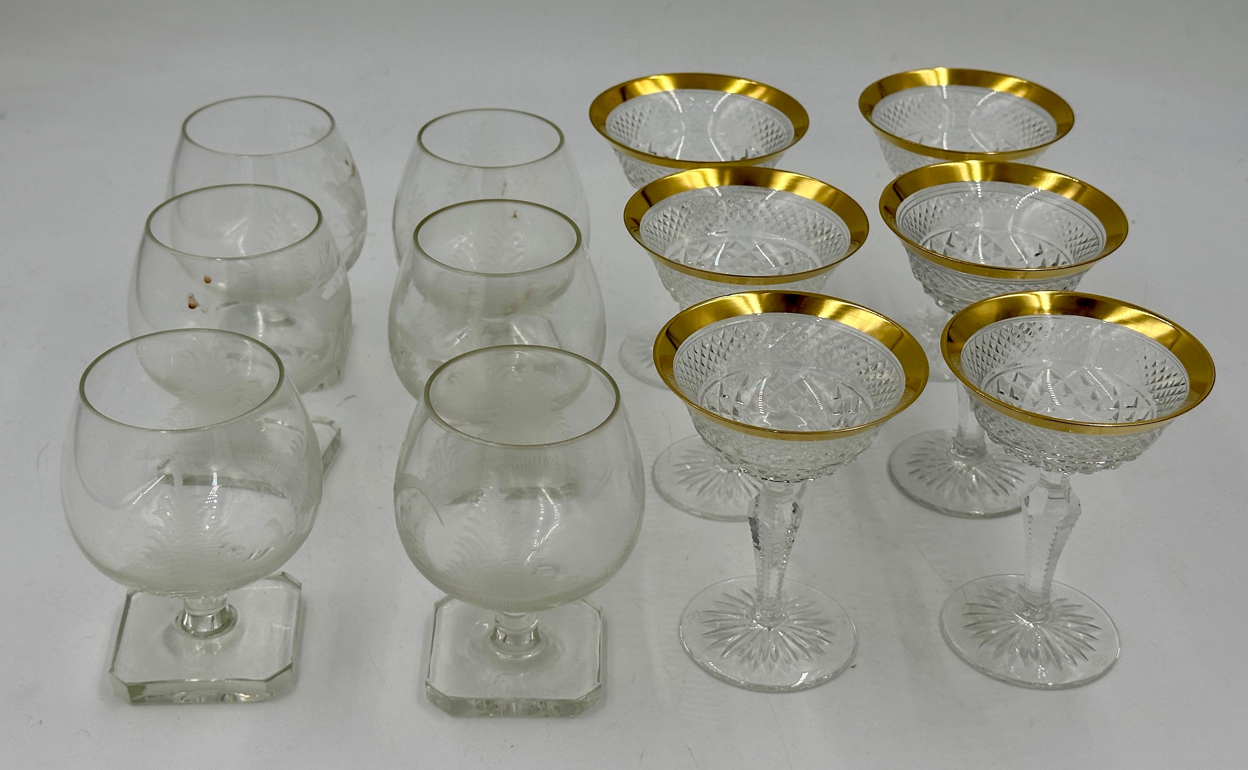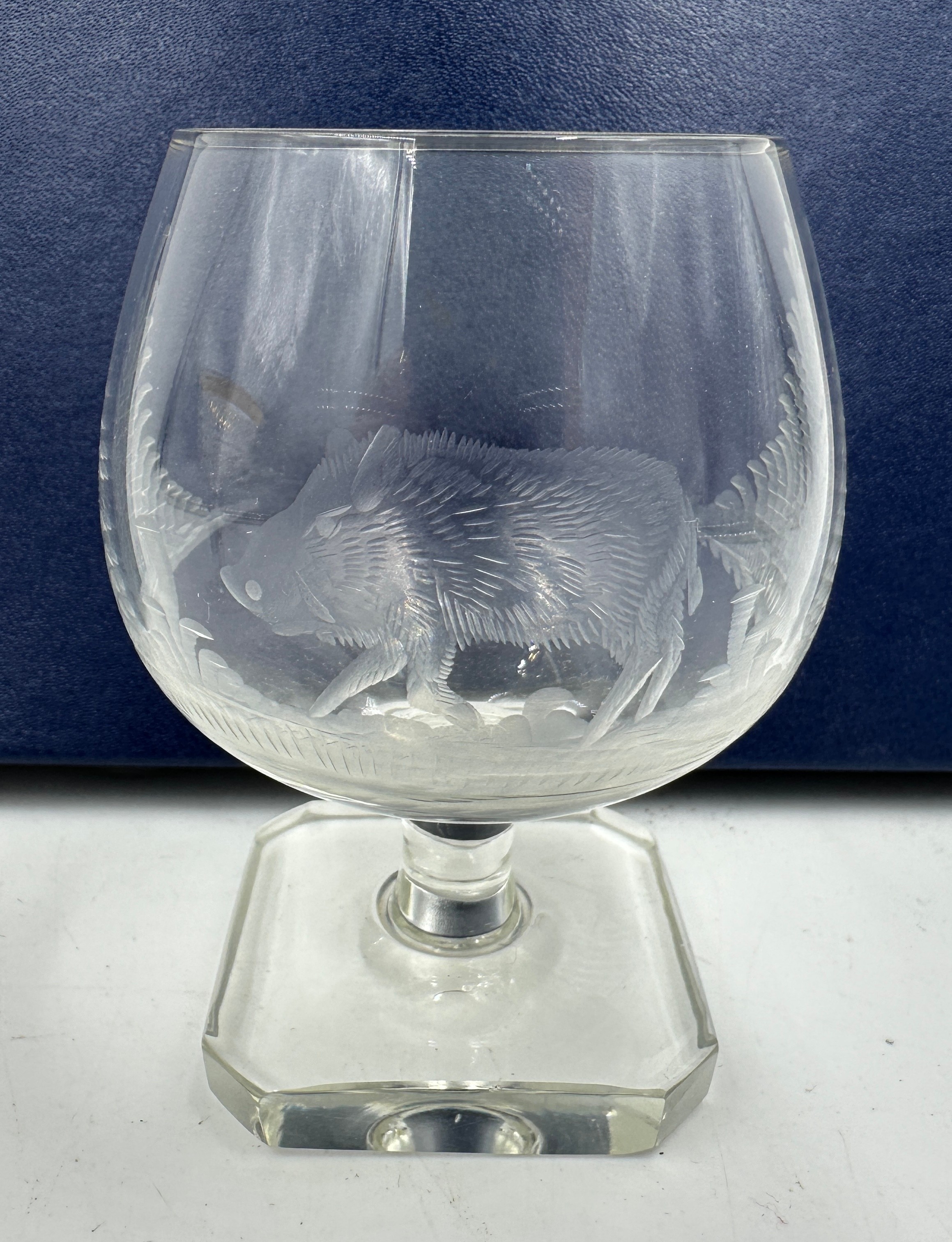 A set of six Rowland Ward engraved Brandy glasses, 9.5cm h, depicting various animals and birds, together with liqueur glasses with gold rims, 10cm h, possibly Moser. (12).