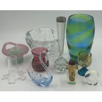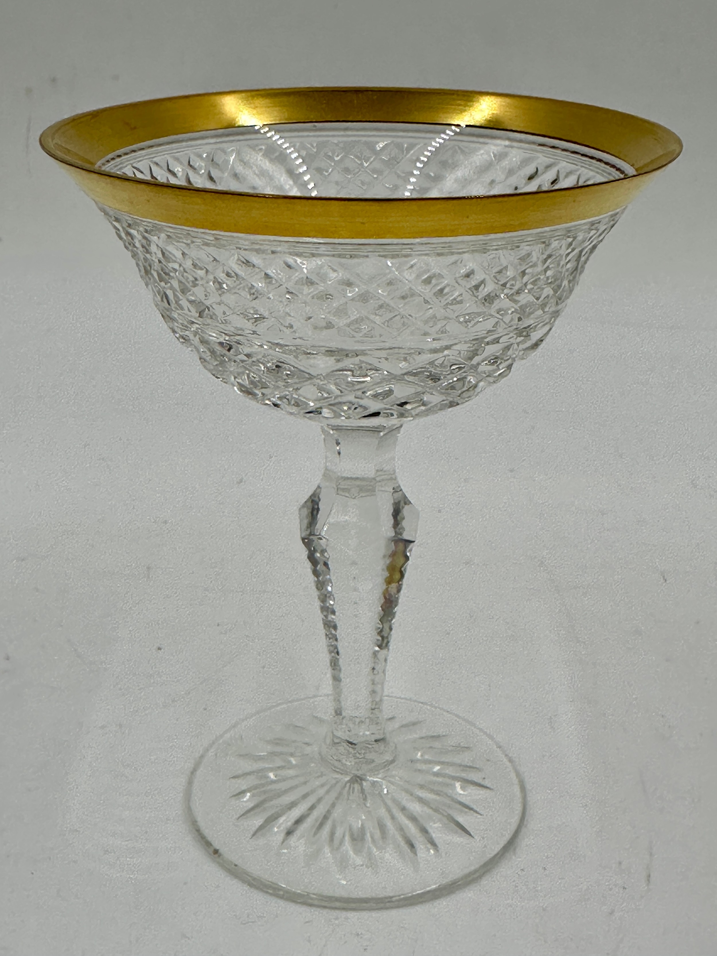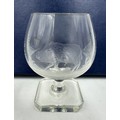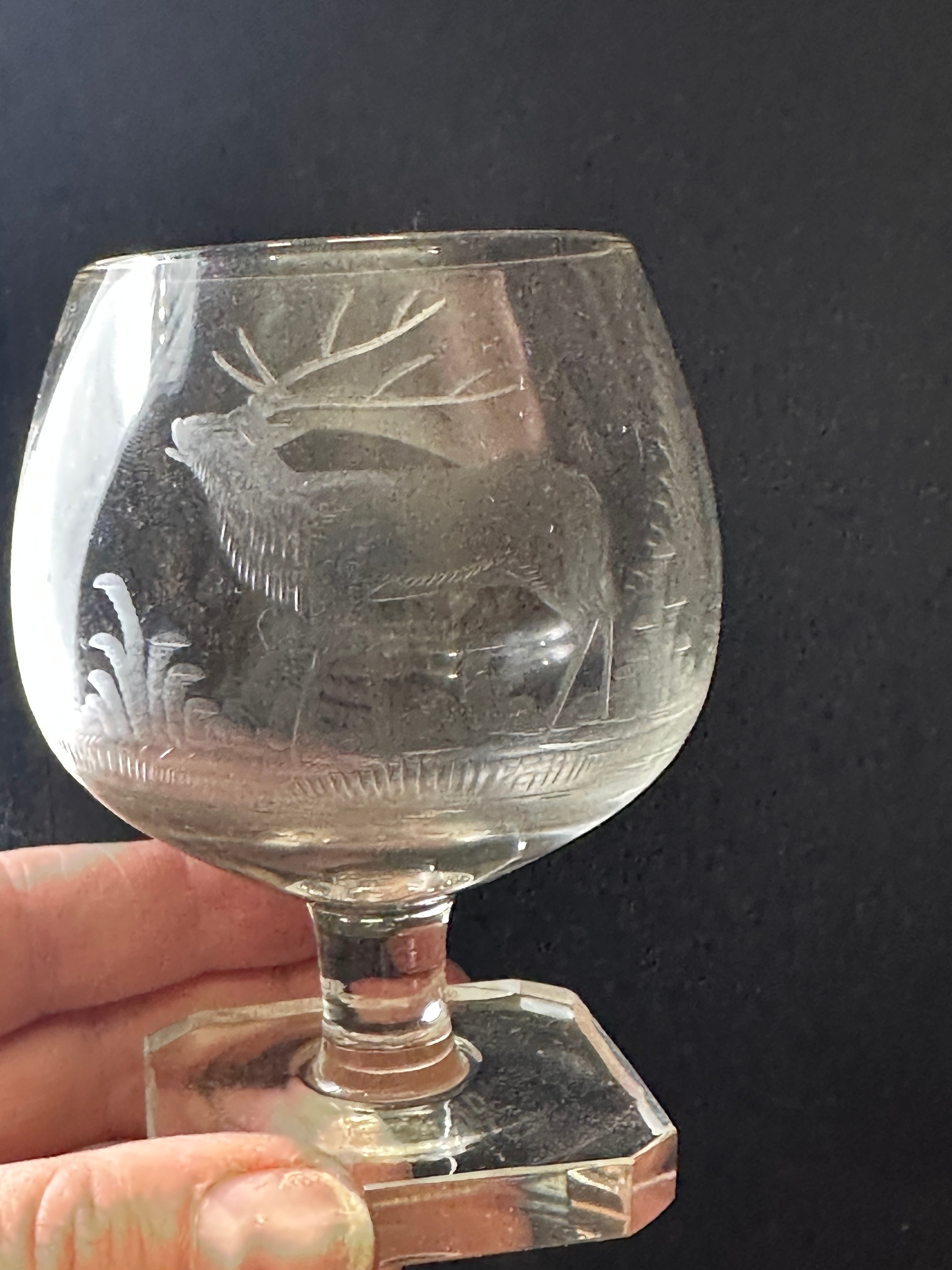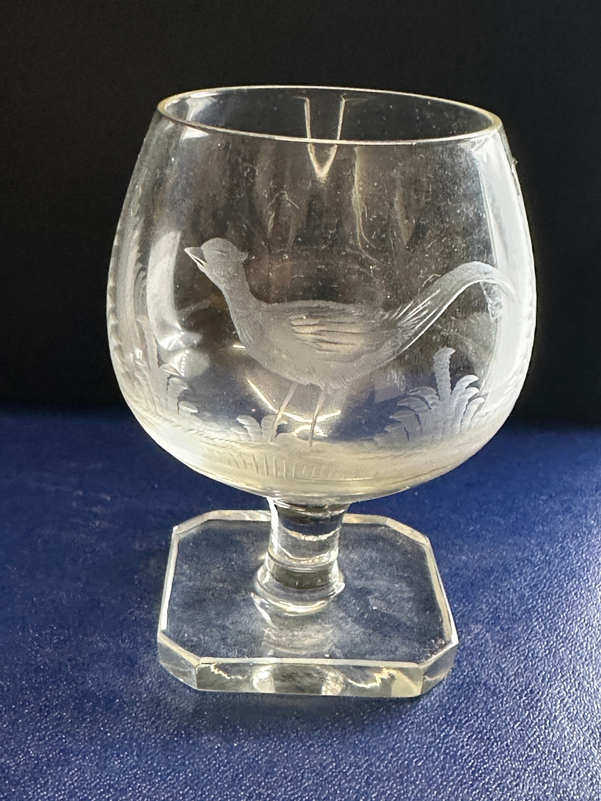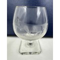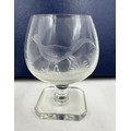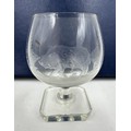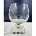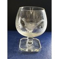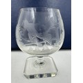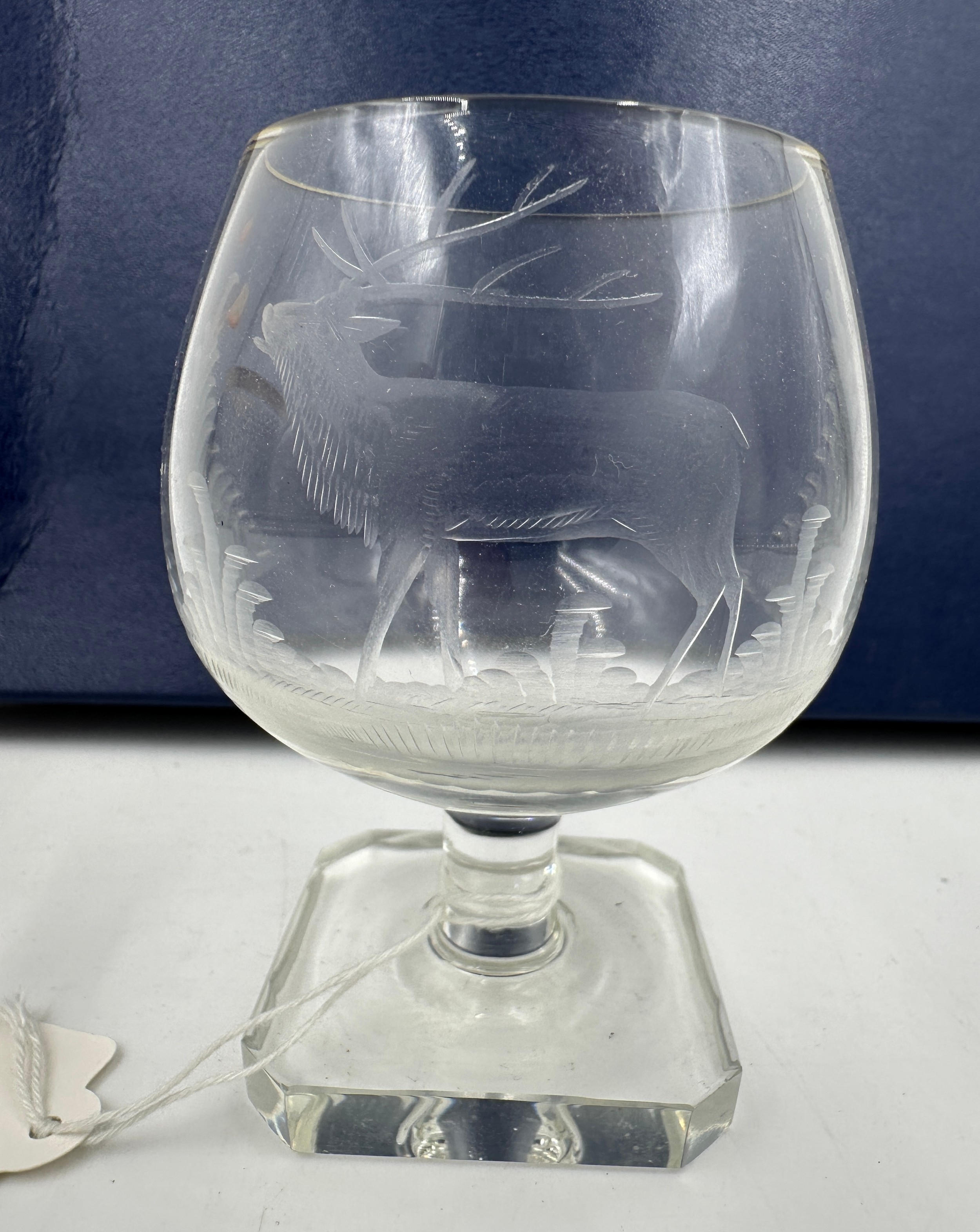 A set of six Rowland Ward engraved Brandy glasses, 9.5cm h, depicting various animals and birds, together with liqueur glasses with gold rims, 10cm h, possibly Moser. (12).