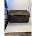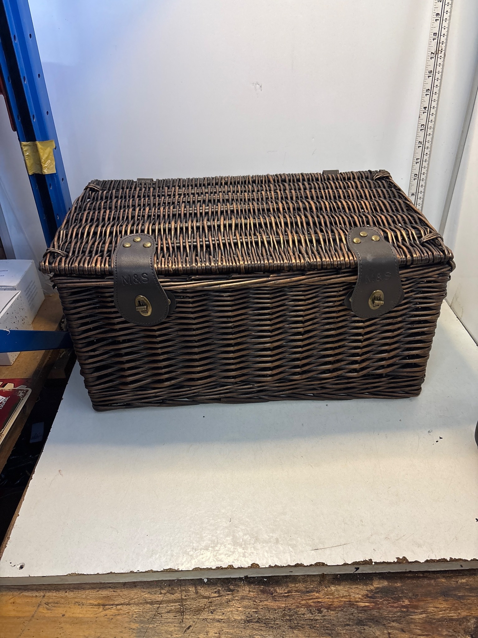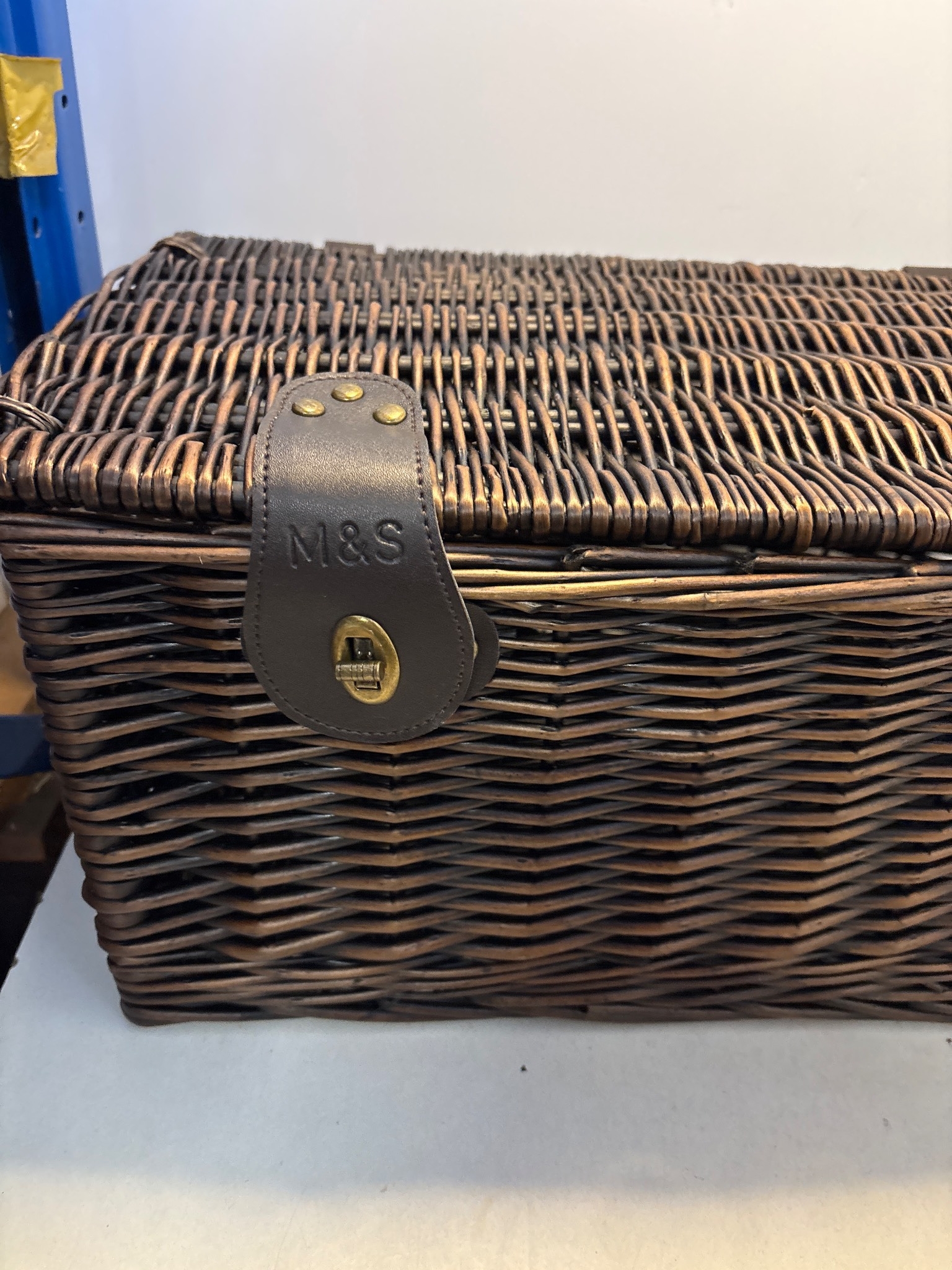Marks and Spencer wicker hamper with leather straps and metal closures.