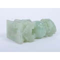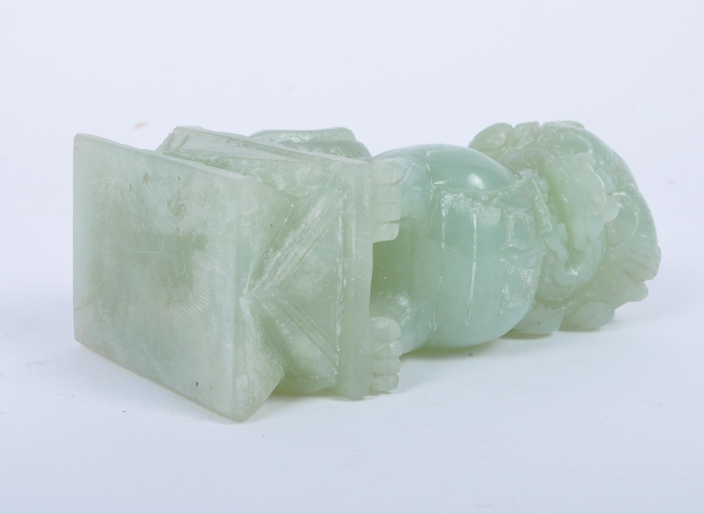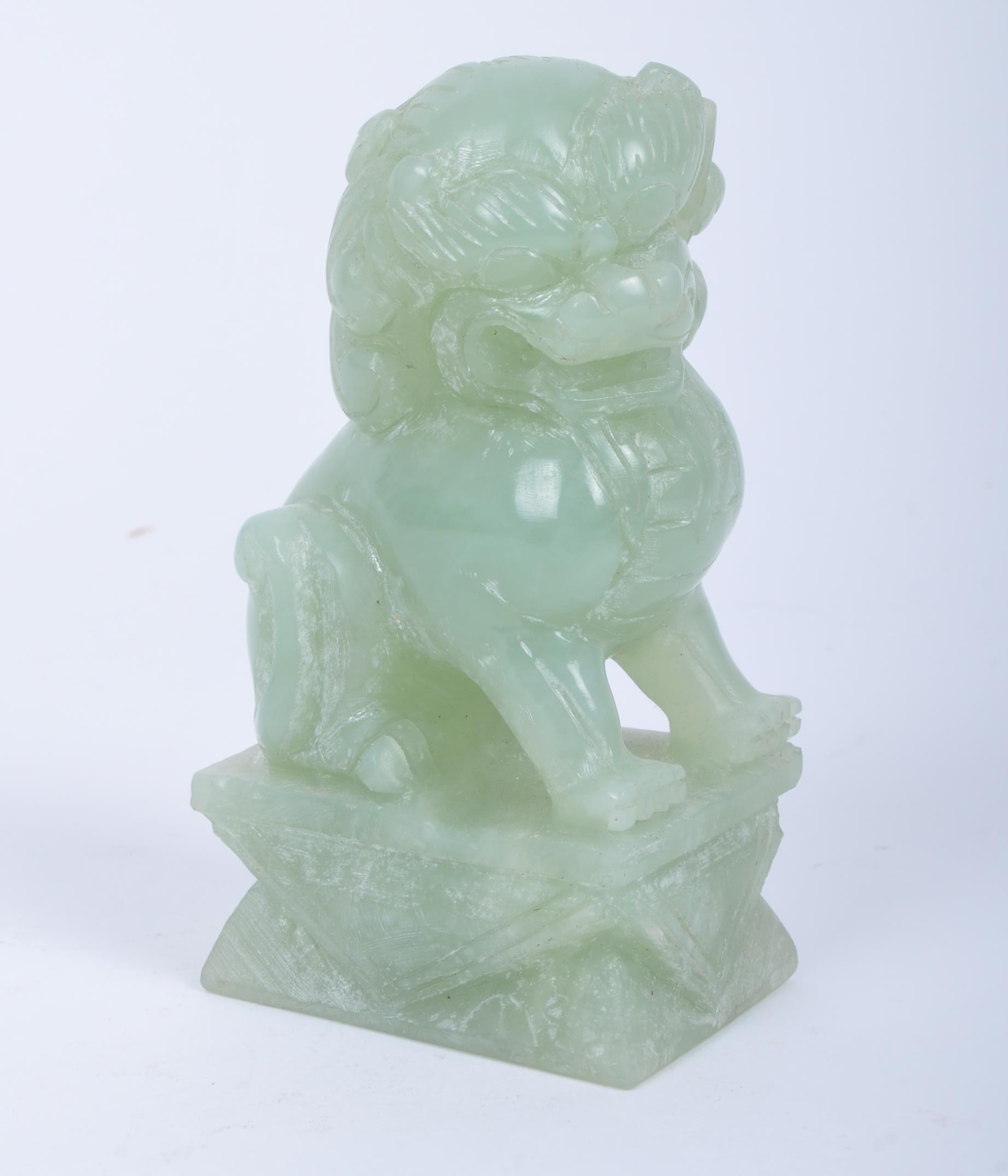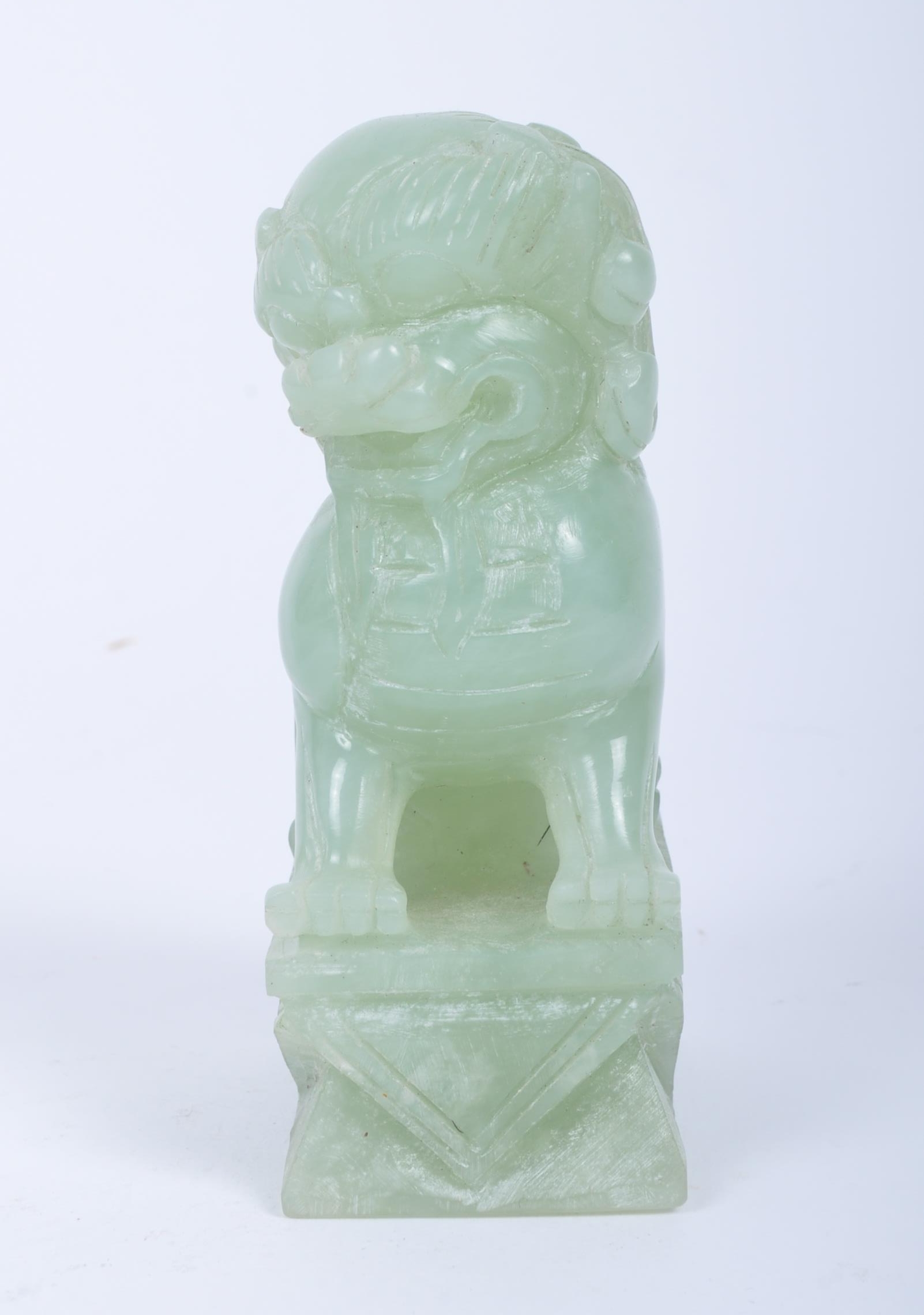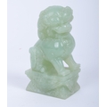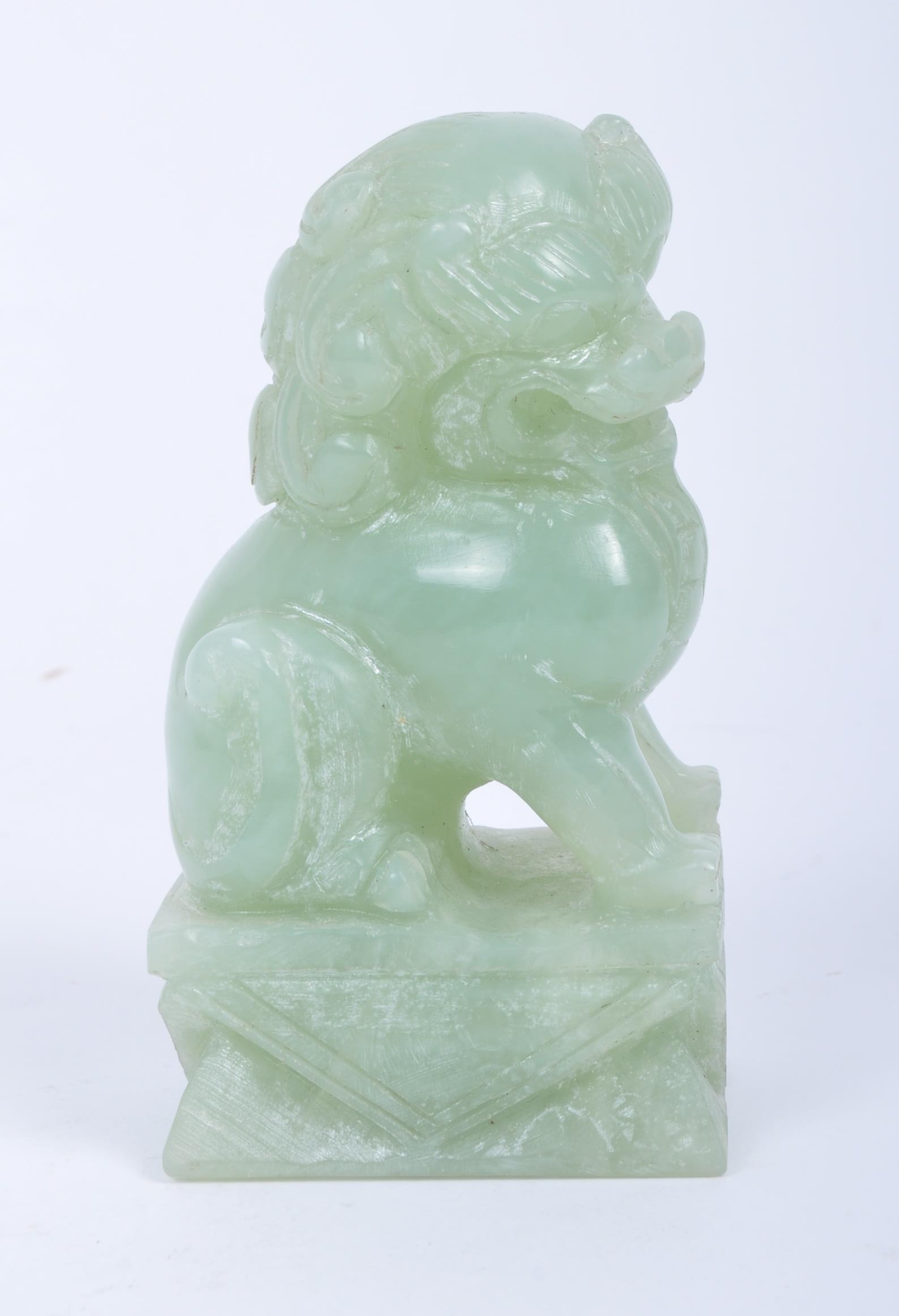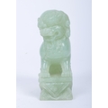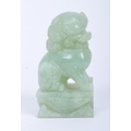 An early 20th century Chinese carved jade Dog of Fo / lion / temple dog. The carving with defensive expression and curled mane, mounted on pedestal base with engraved triangular pattern, 11cm tall.