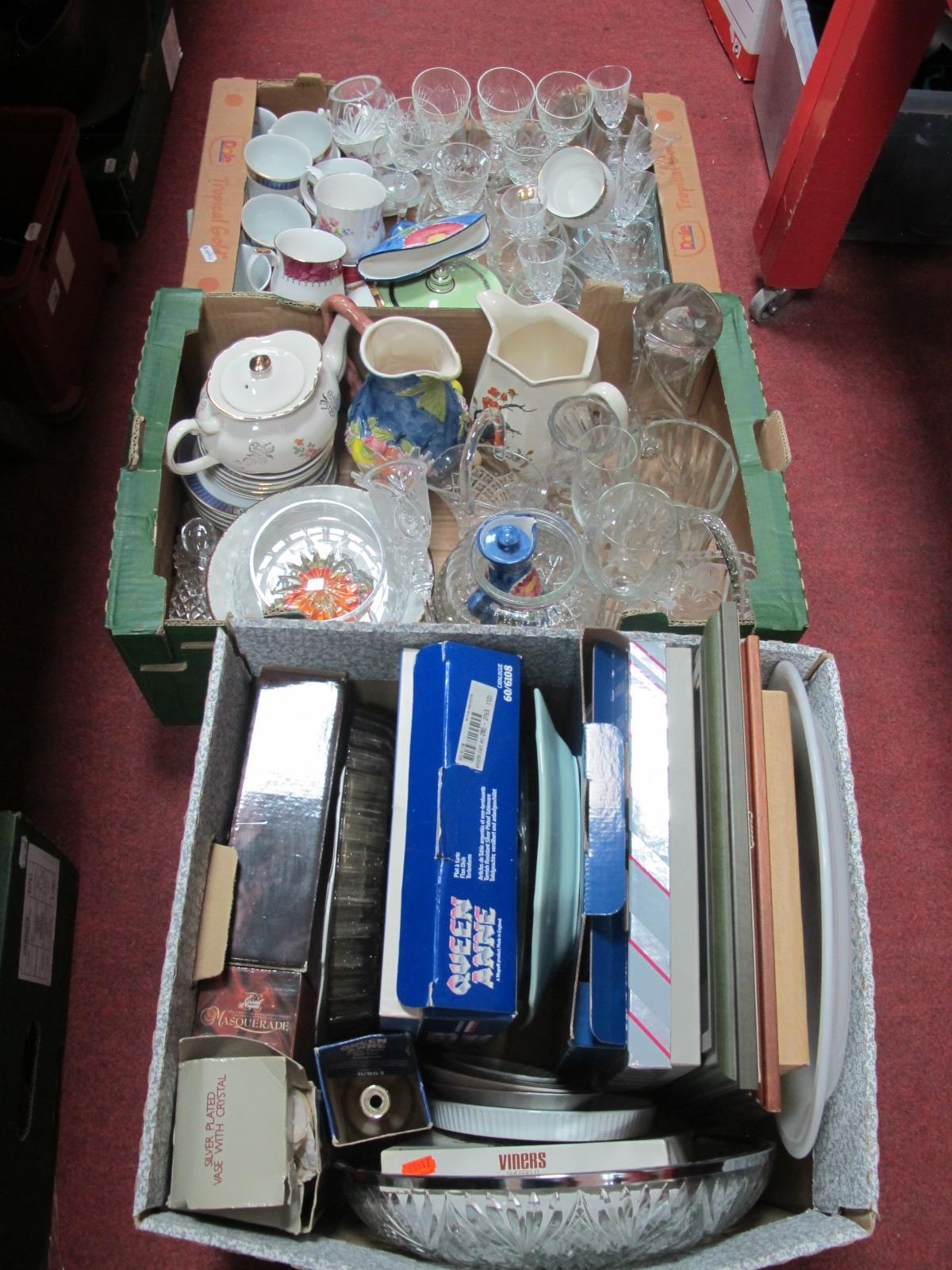 Plates, kitchen ware, table china, Waterford bowl, other glassware, Decoupages, etc:- Three Boxes