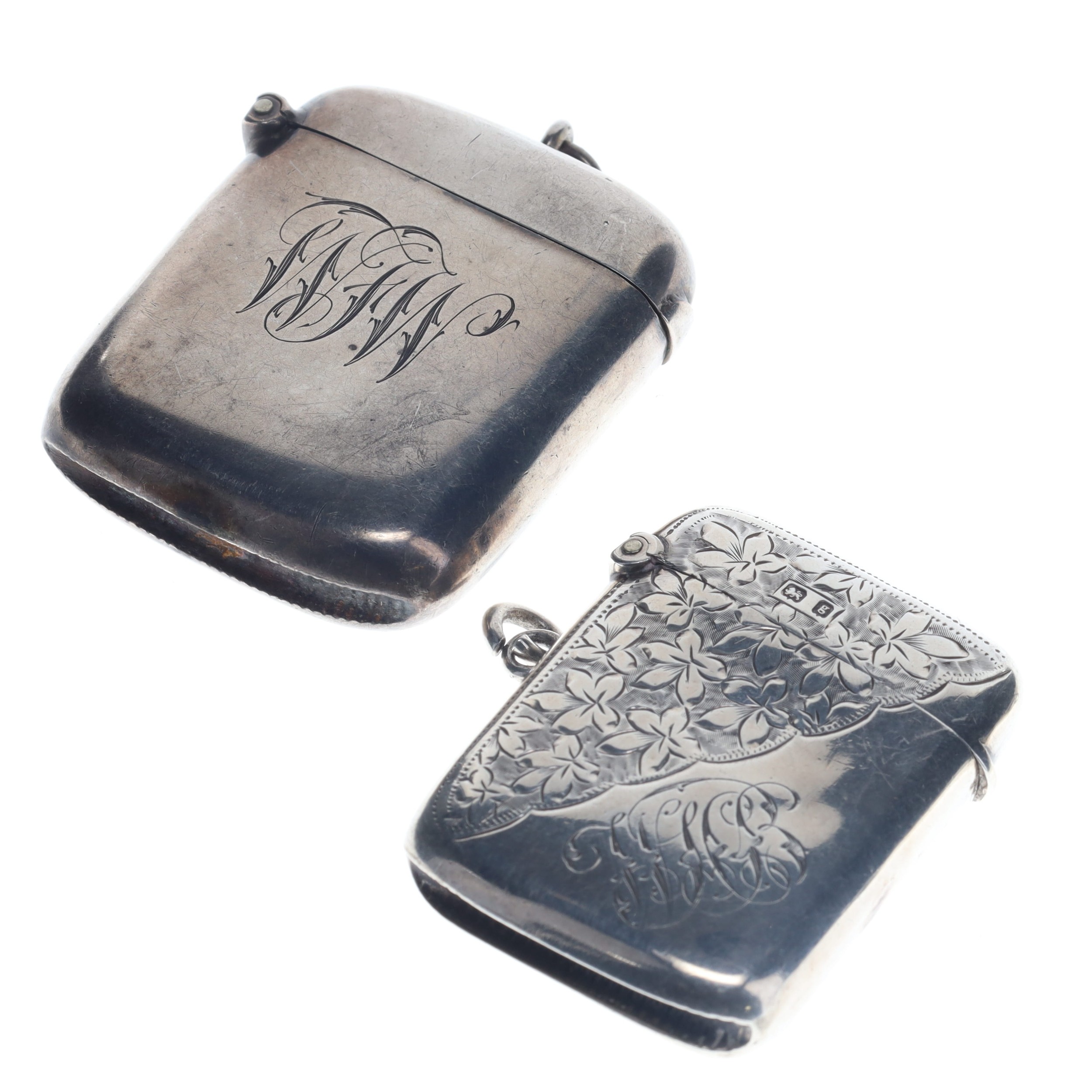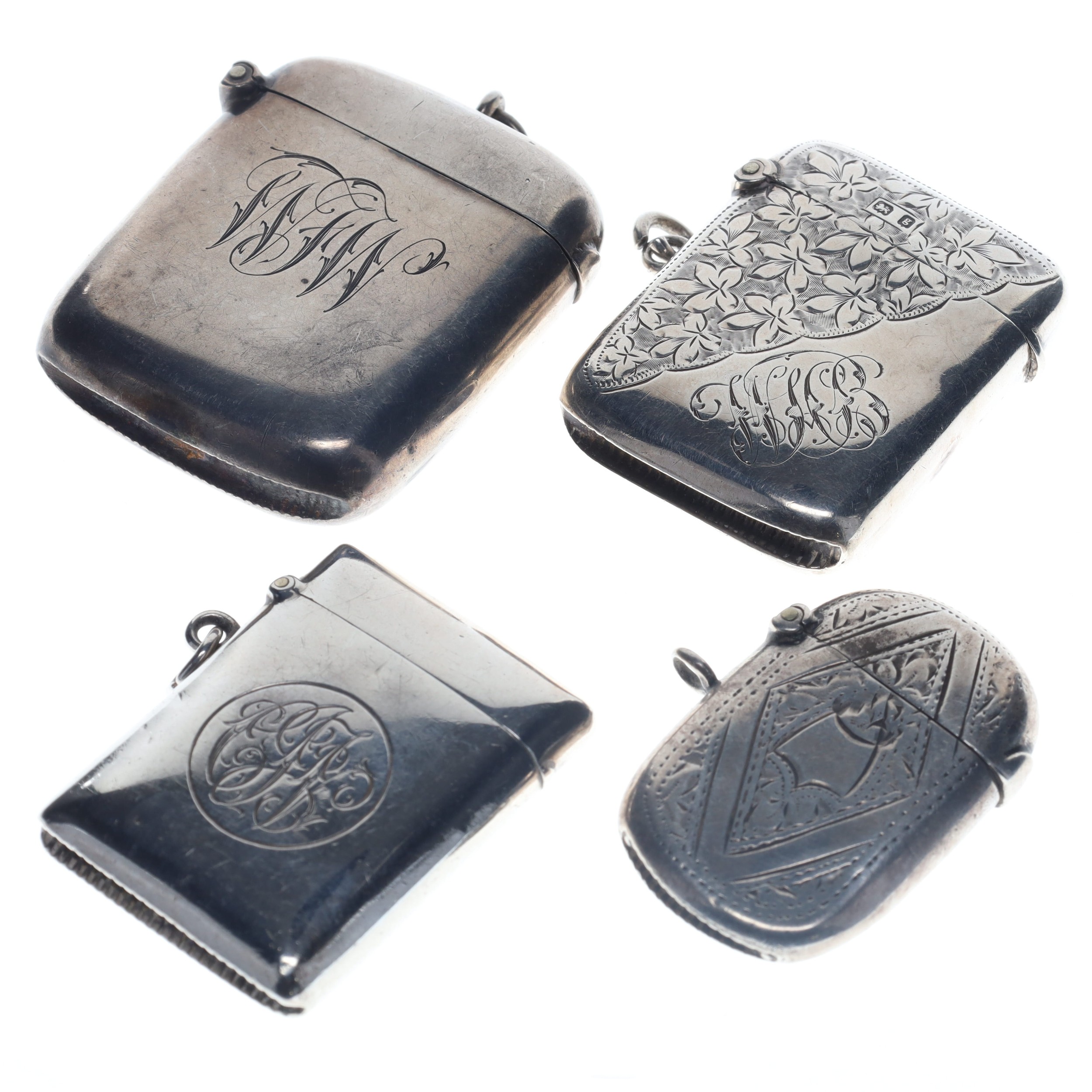 Antique Sterling Silver Vesta Case Collection, consisting of 4 items with various hallmarks, including Victorian, Edwardian. Various designs, styles and shapes, such as, plain and personal engravings, all of the vestas show visible tarnish. All hallmarked .925 sterling silver, total weight 93g.