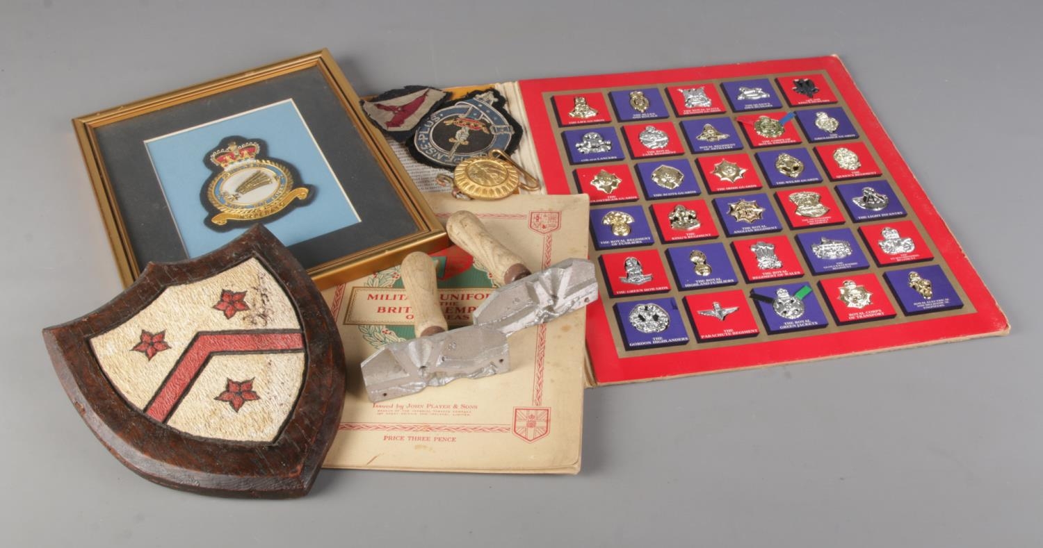 A Small collection of military related items including The Great British Regiments by Texaco, Military Uniforms Of The British Empire Overseas cigarette card album, Crest wall plaque, Framed RAF Patch, toy soldier mould etc