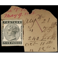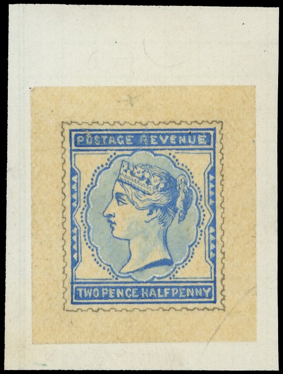 1881 2½d Blue. Superb hand painted essay from De La Rue’s first scheme painted on tracing paper (29x34mm) in blue and Chinese white mounted on stout white paper. Only two such sets of essays were produced, one of which is in The Postal Museum thus unique in private hands. Ex DLR Archives. Cat. £8500