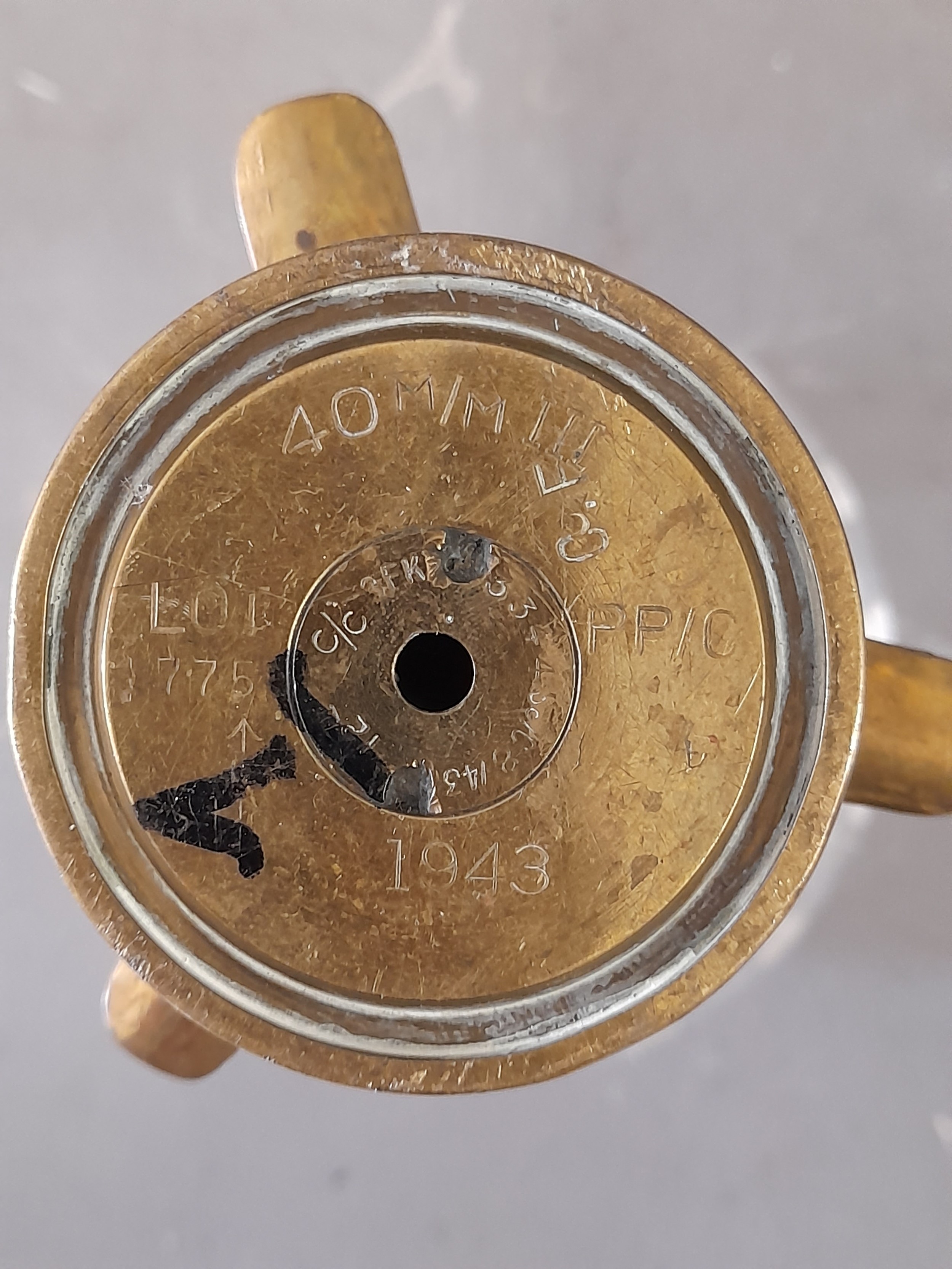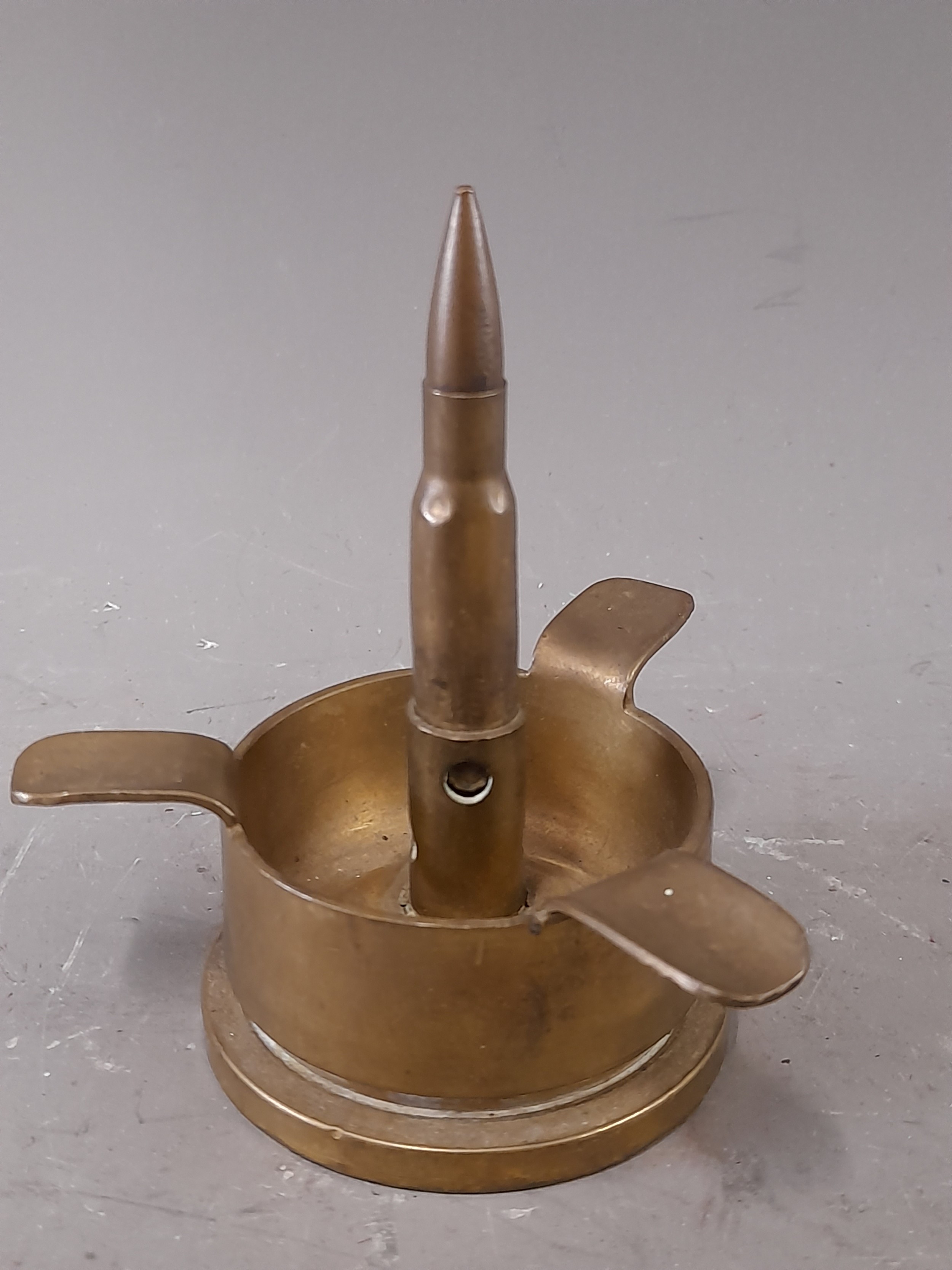Trench art, Brass Ash Tray made from a 1943 40mm Shell with Bullet Finial, 10cm high