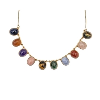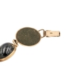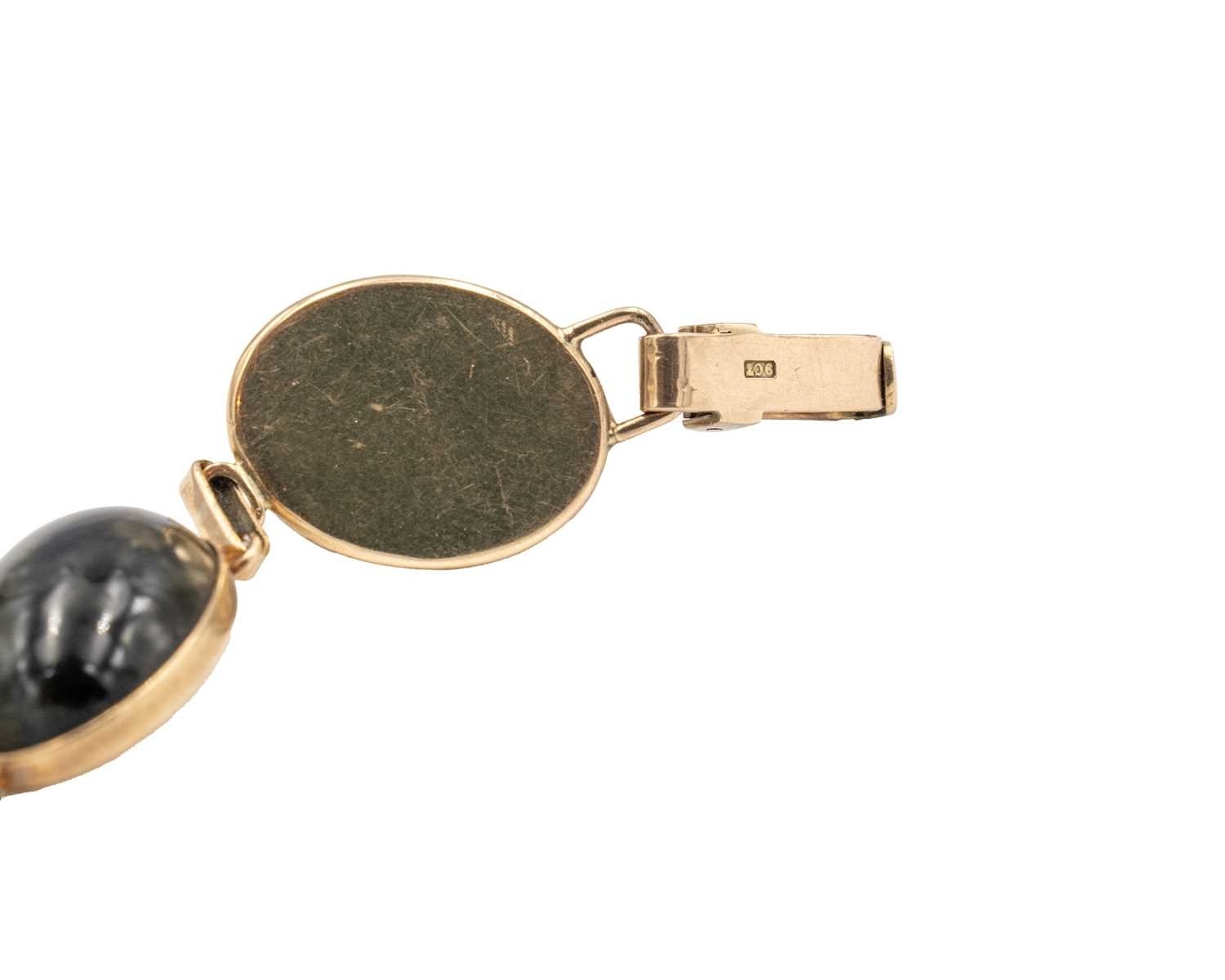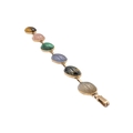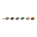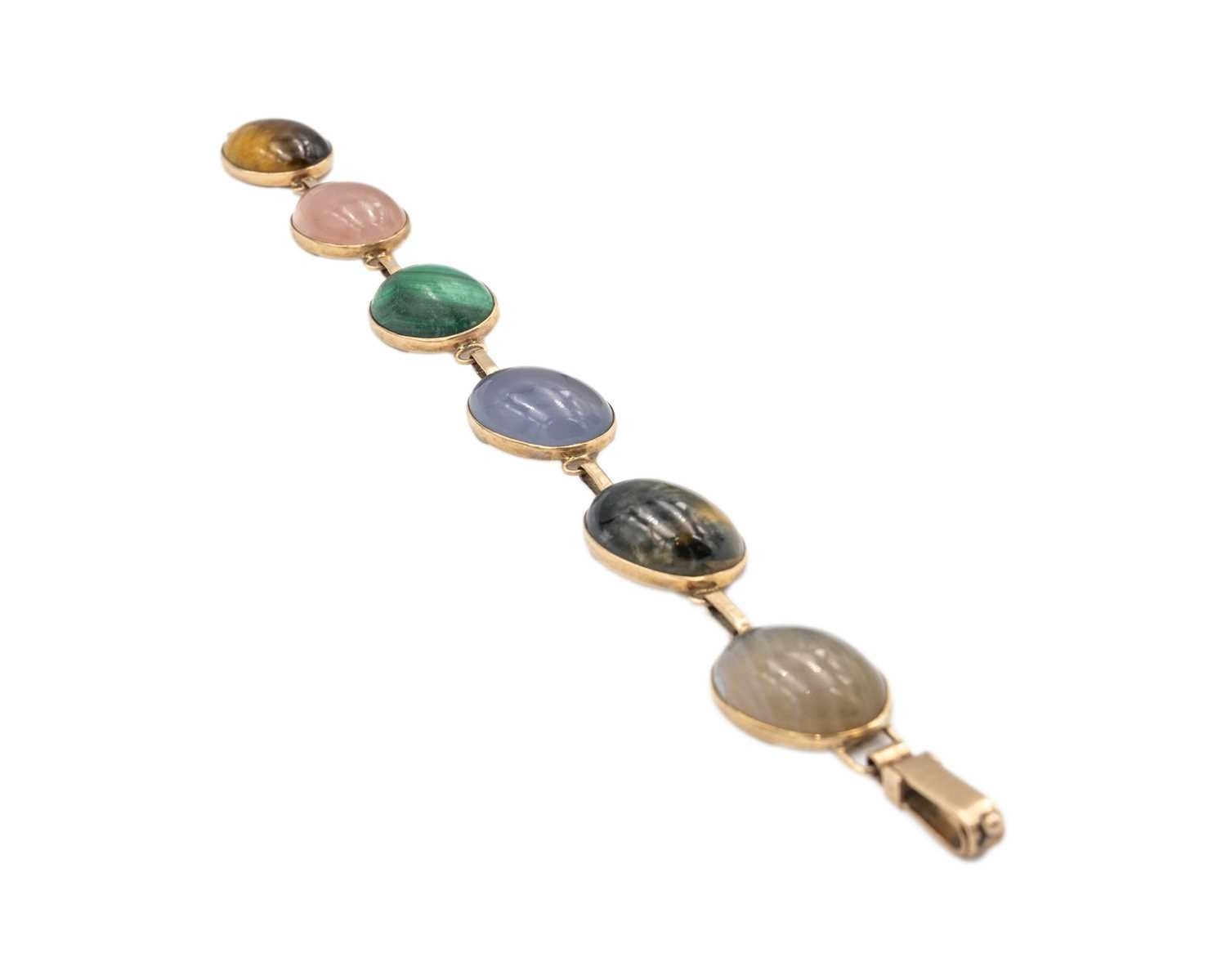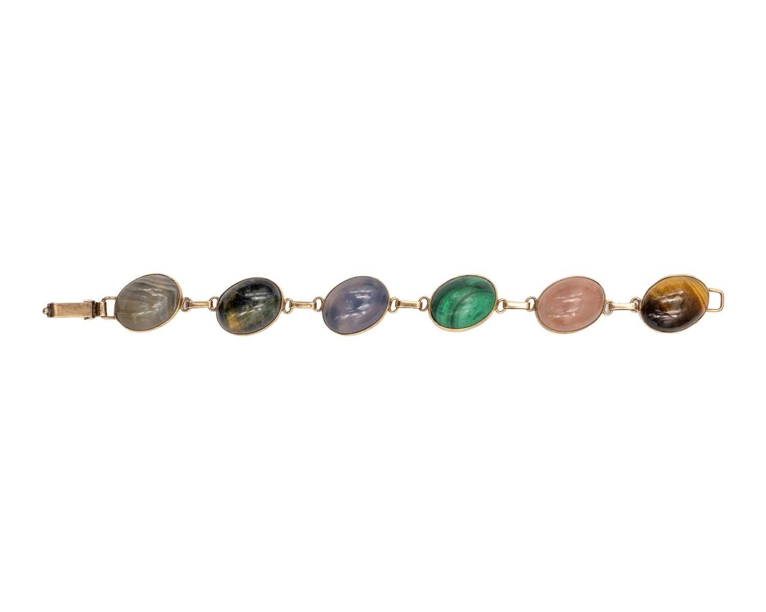 A 9k rose gold bracelet set with various quartz gems. Each oval cabochon gem in a closed back setting and measuring 20 x 15mm approx., united by an oval link spacer, the hinged clasp stamped 9ct, length 19.5cm, 34.4g.