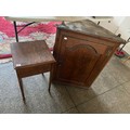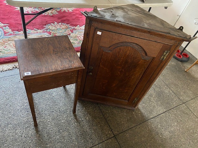 A Georgian oak wall hanging angle cabinet with panelled door and an oak sewing table with hinged lid, on square legs