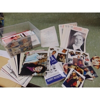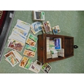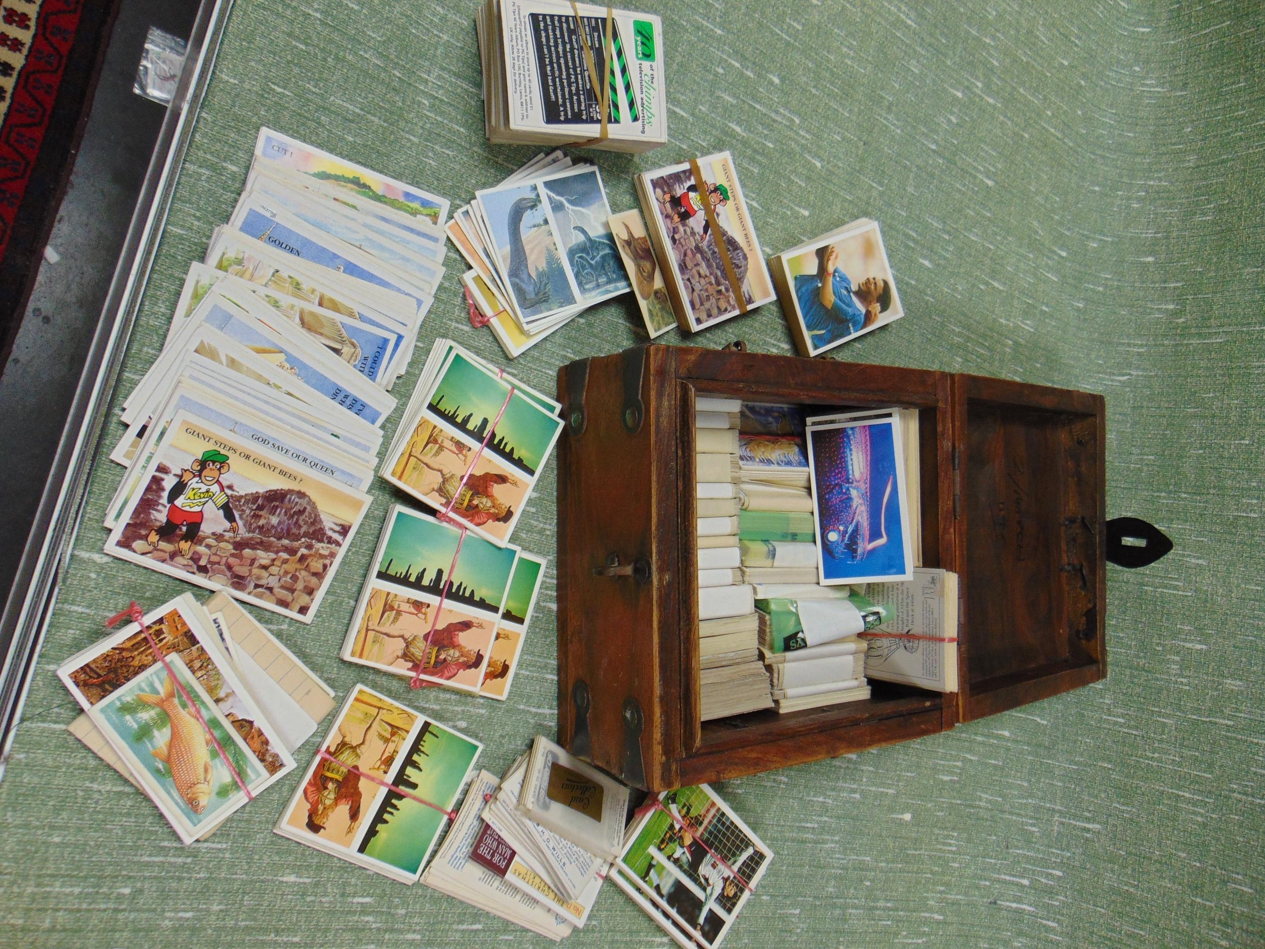 Wooden box containing a quantity of tea cards and cigarette cards.