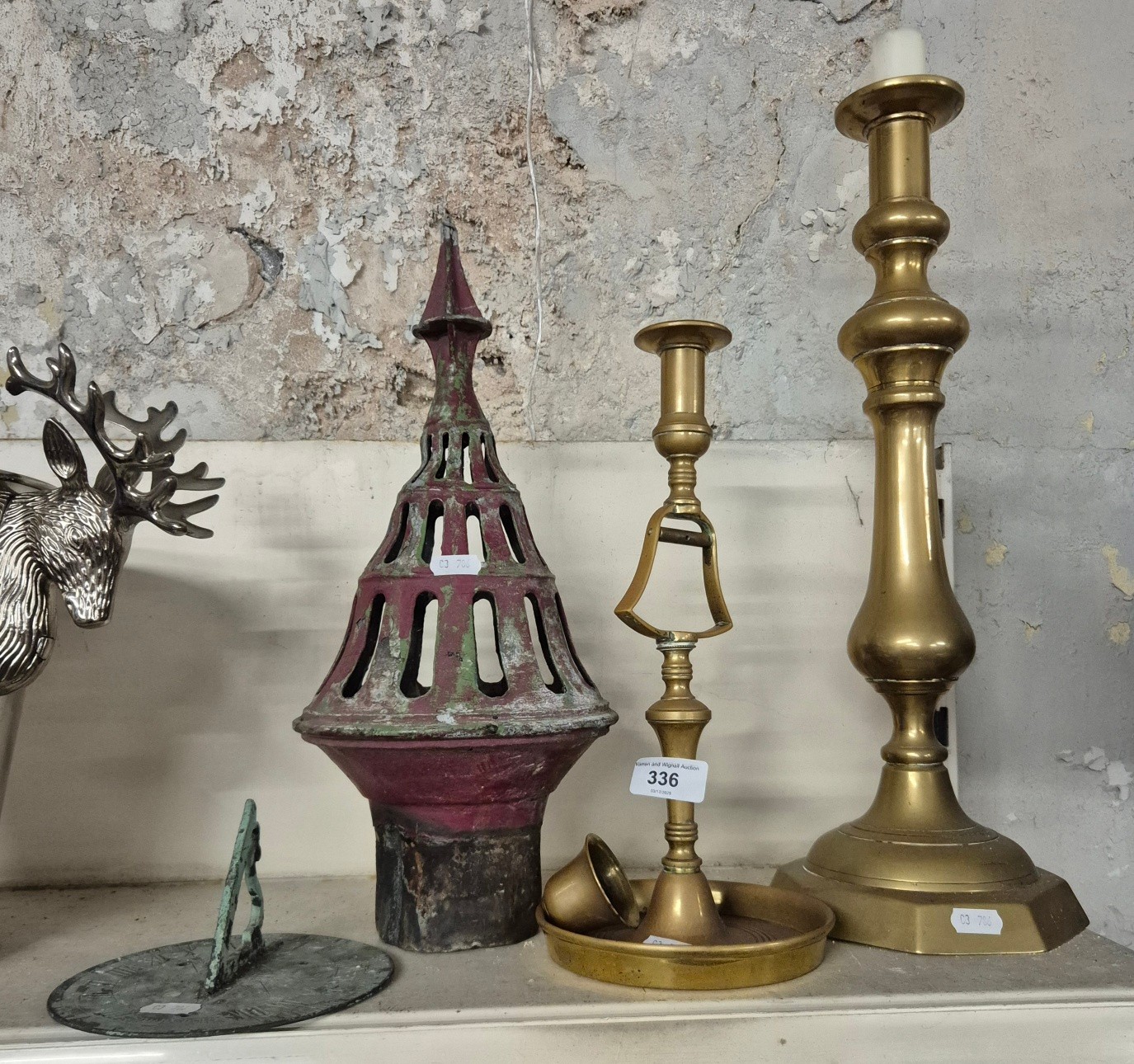 A group of assorted vintage metal items comprising of a brass sundial, an ornate lead pipe cap & 2 brass candlesticks.