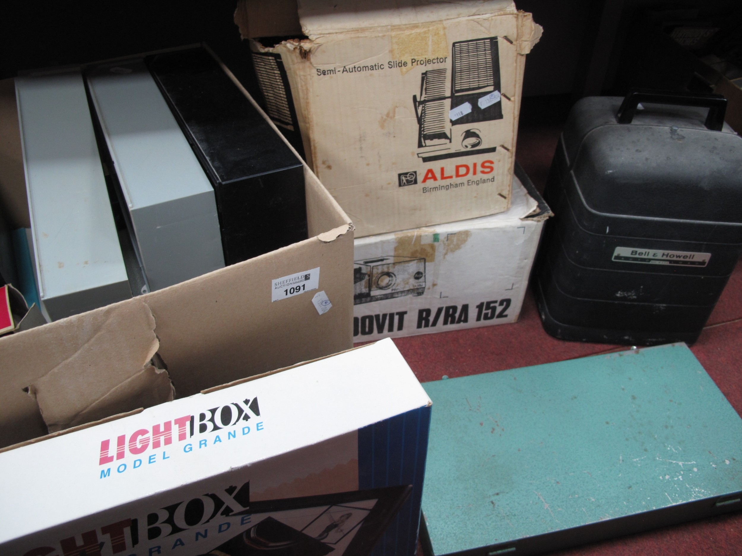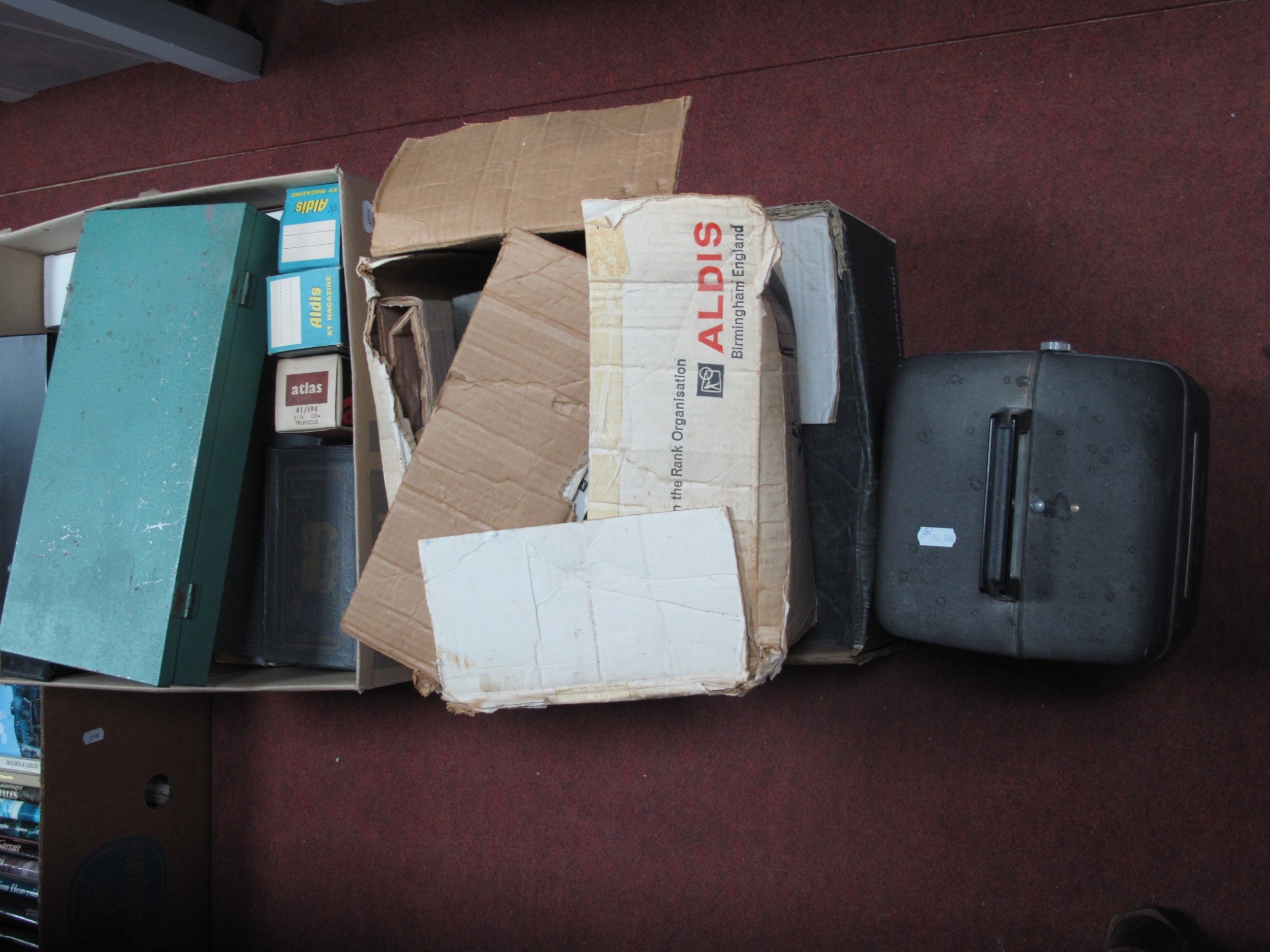 Haimar, Bell & Howell, Aldis and Pradovit projectors, slide cases and boxes, etc.