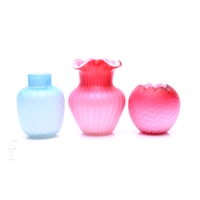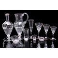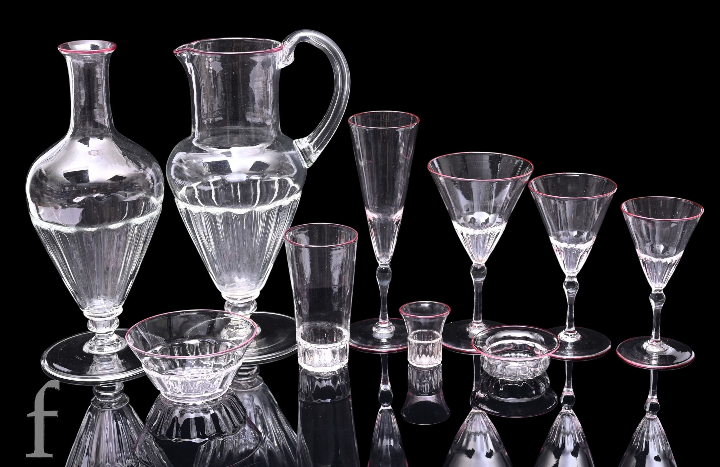 A large suite of Salviati &Co Venetian glass drinking wares, the clear bodies with fluted basal collars and ruby rims, comprising eight champagnes, seven large wines, seven smaller wines, nine sherries, six tumblers, seven shots, three single pan salts, eight bowls, two carafes and a pedestal ewer with paper label, two similar single campana salts and a mounted cruet.