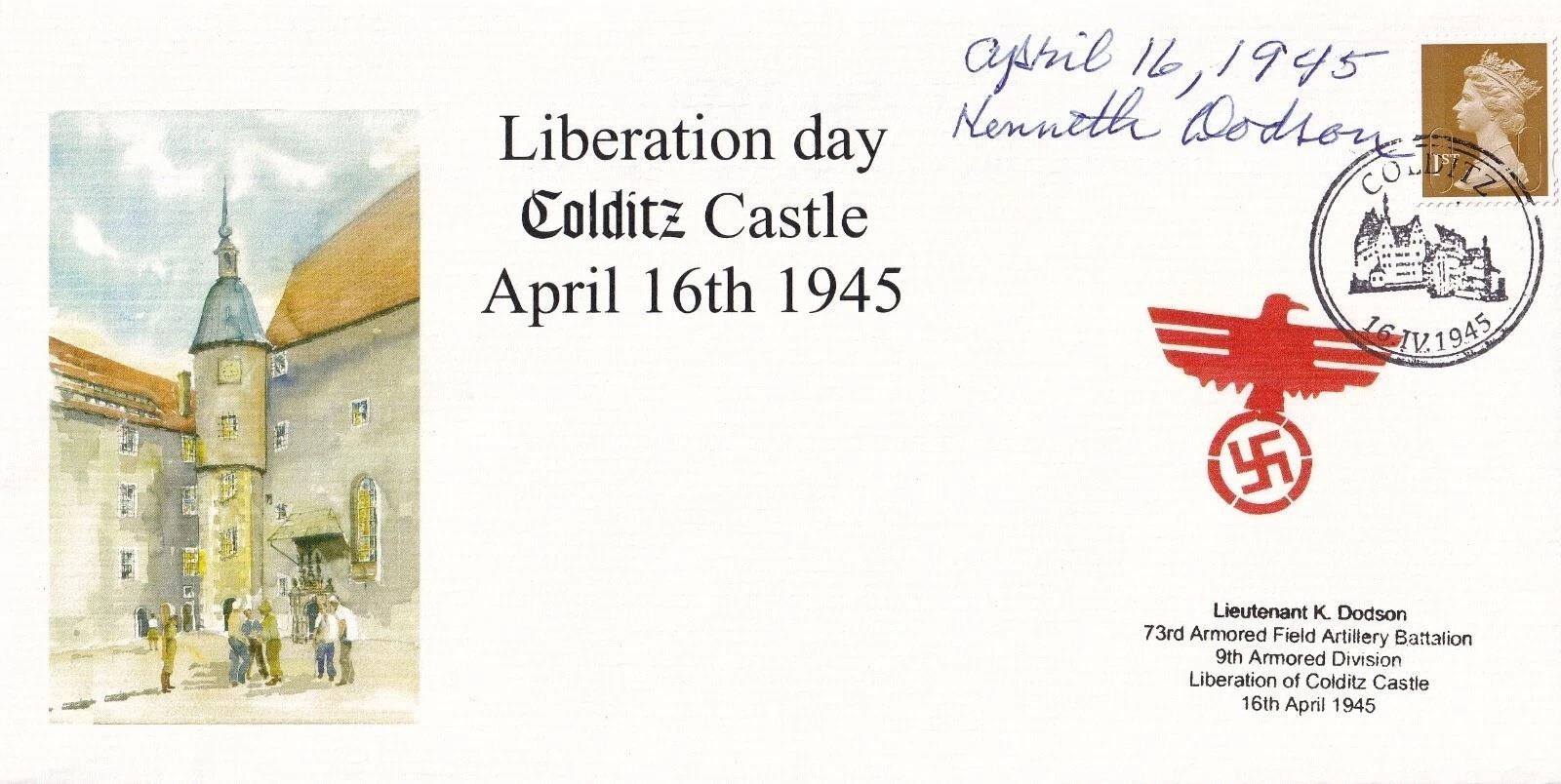 WW2 cover Colditz Signed by Lt K Dodson Liberation of Colditz 9th Armoured Division 16th April 1945. 16 IV 1945 Colditz Datestamp Liberation Day Colditz Castle 16th April 1945. Personally Signed Twice by Lieutenant Kenneth Dodson 73rd Armoured Field Artillery Battalion 9th Armoured Division Liberation of Colditz 16th April 1945 Also Signed on the Back Kenneth Dodson Good condition. All autographs come with a Certificate of Authenticity. We combine postage on multiple winning lots and can ship worldwide. UK postage from £5.99, EU from £7.99, Rest of World from £9.99
