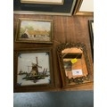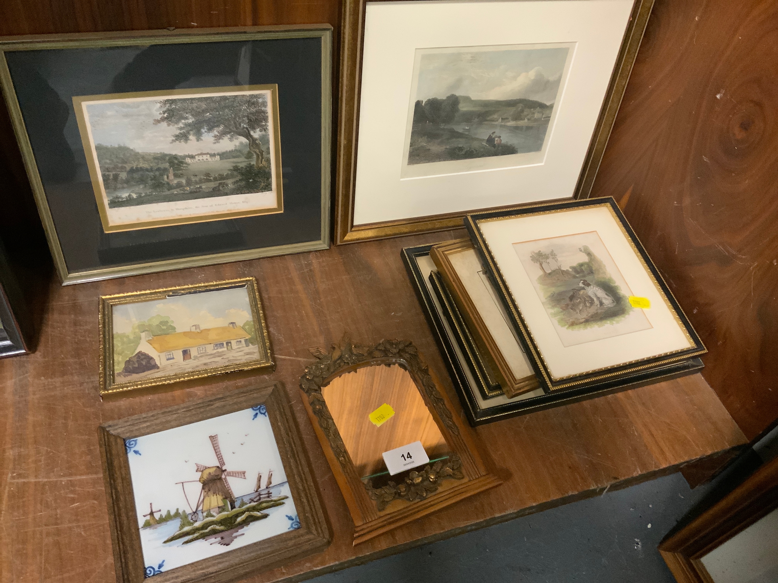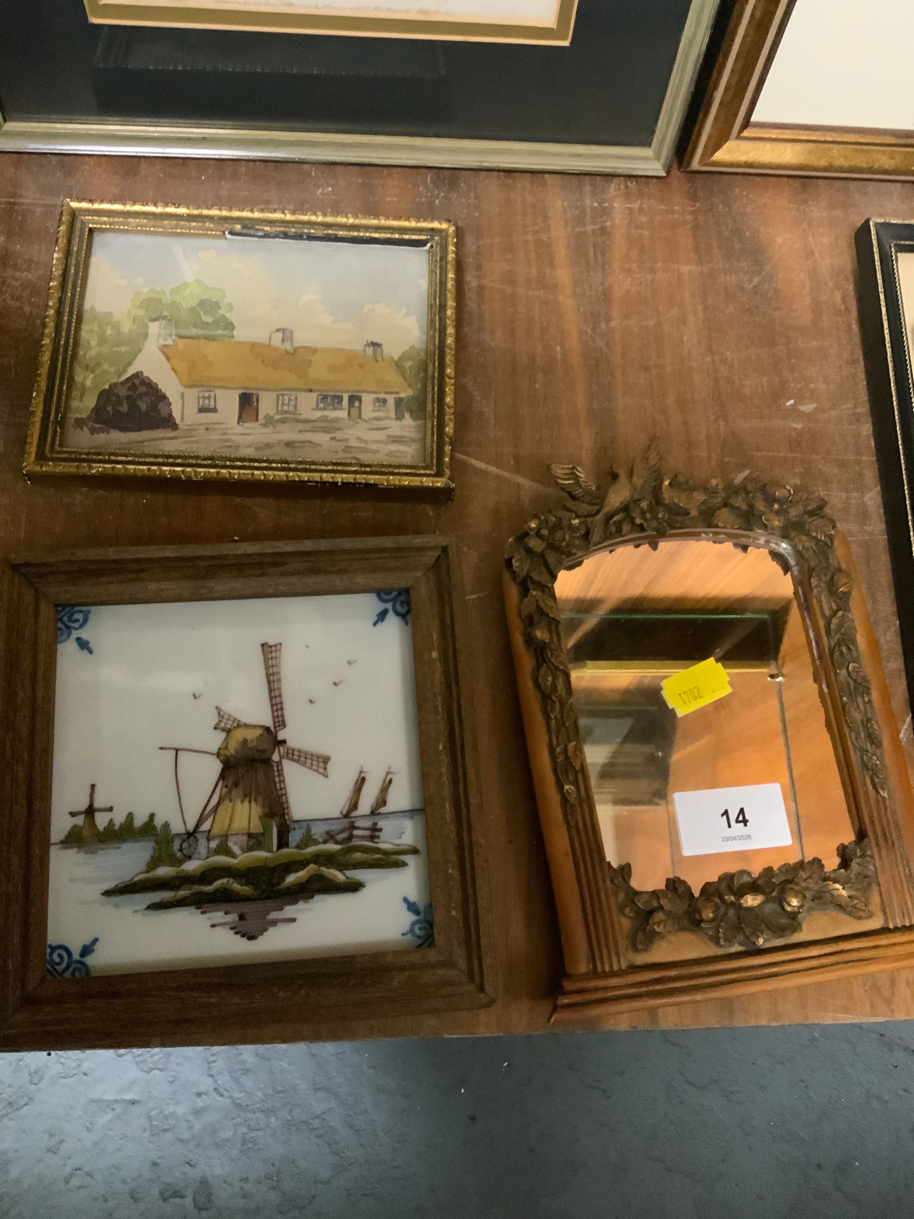 A collection of assorted prints and engraving to include a decorative small mirror, a porcelain Dutch tile and a small watercolor of a cottage