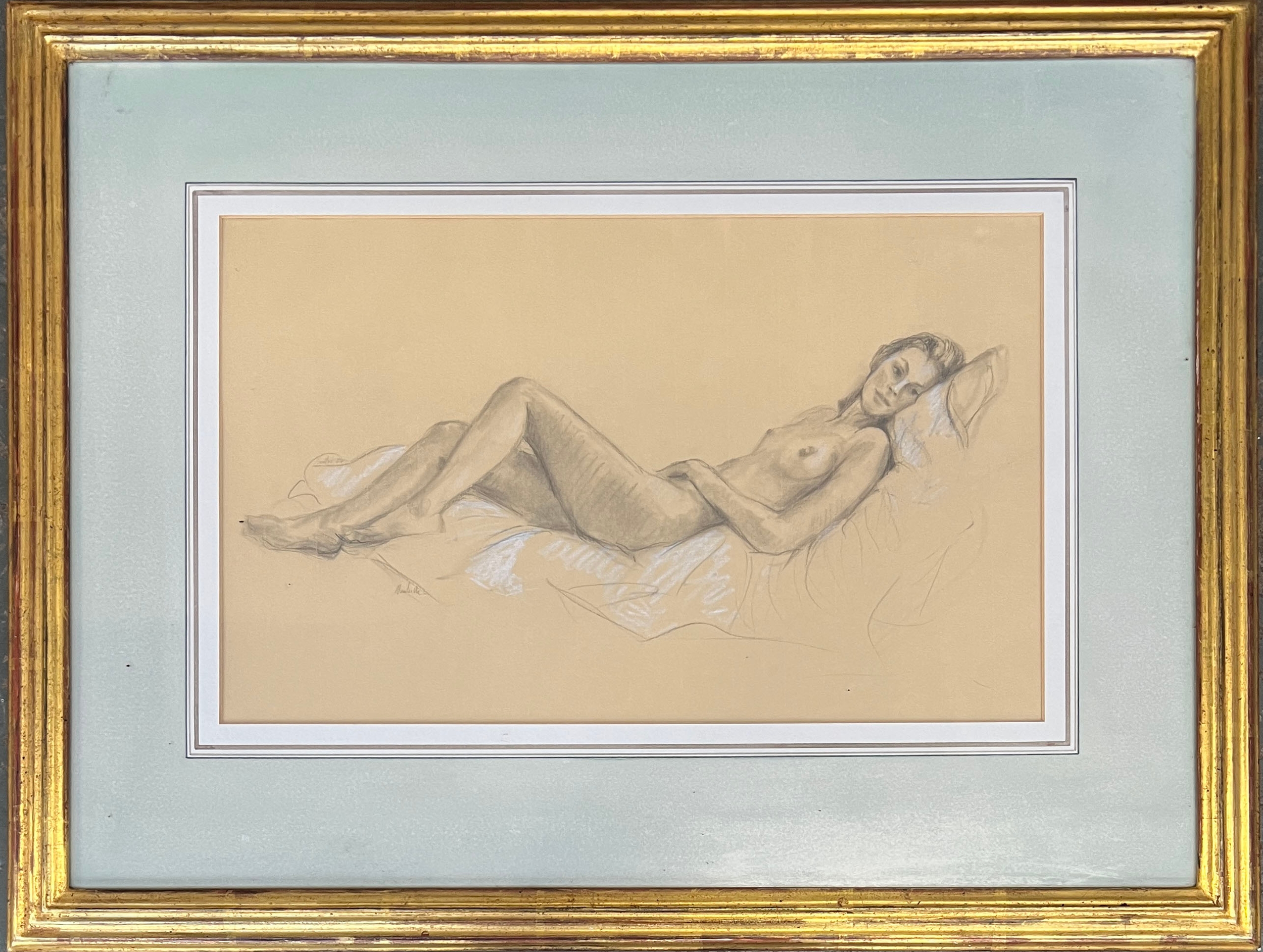 A 20th century pencil and white chalk nude study, 26x42cm