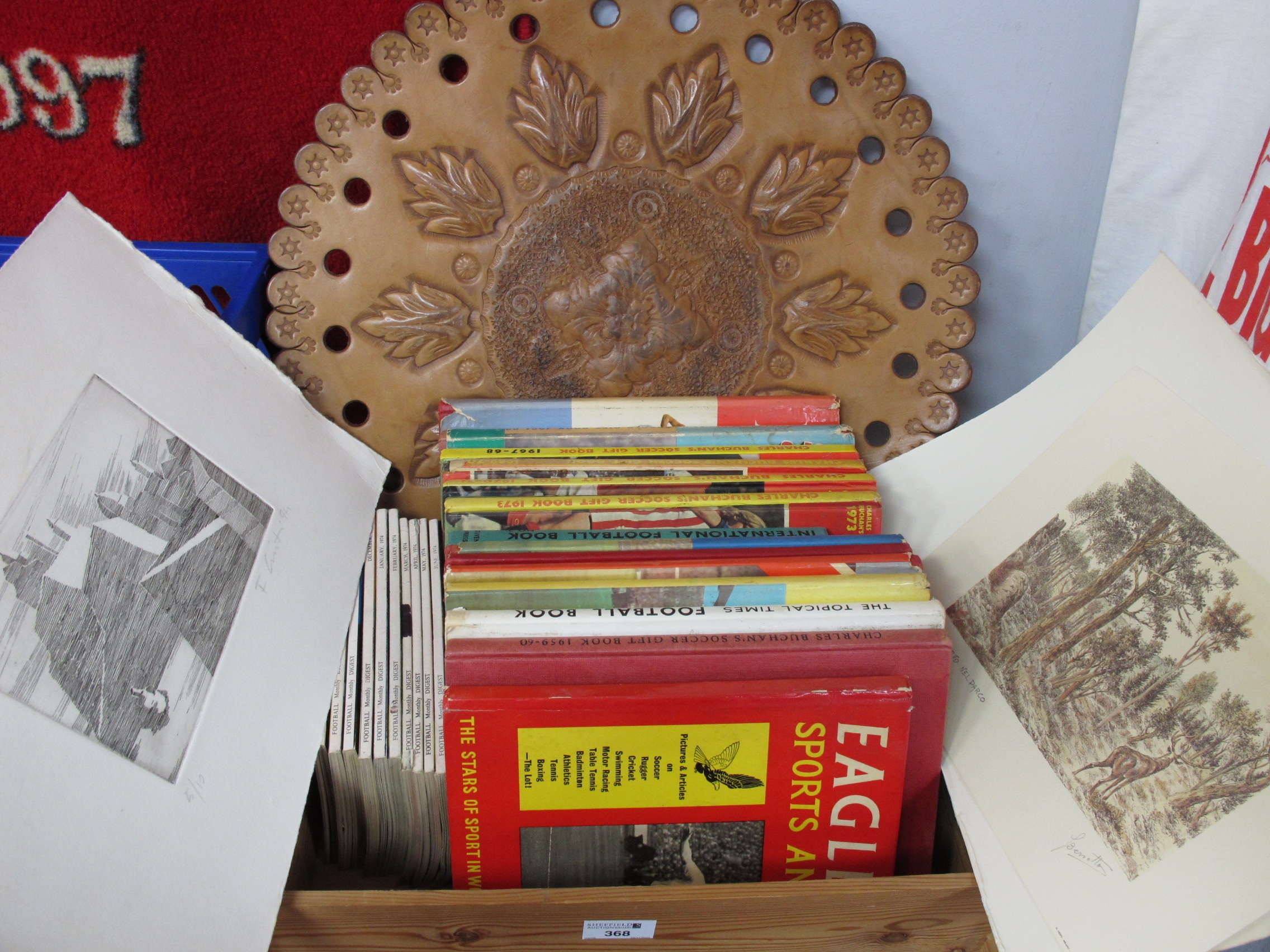 Sporting Annuals, including Charles Buchan, Eagle, Topical Times, Football Monthly Digest, together with two limited edition prints, one other, and leather wall plaque:- One Box.